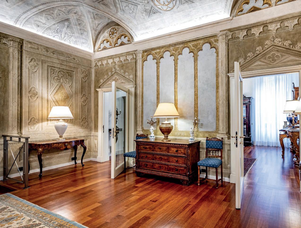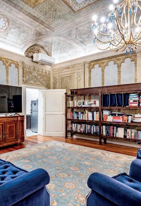 A refined apartment with historic allure. It features a majestic living room adorned with beautiful frescoes, once the heart of the building where the old library was located
