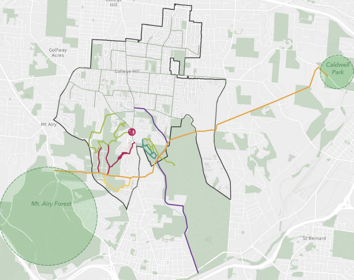 For this studio project, my group and I designed a network of trails in the hillsides of the Cincinnati neighborhood College Hill hillsides. We wanted residents and visitors to have a dynamic experience that fosters a rich sense of history, a connection with the natural environment, and a celebration of the neighborhood’s diverse and inclusive culture. Our five main objectives were to 1. use art as a catalyst to enrich and inspire the community through interactive installations; 2. establish a standard that balances man-made experiences with the natural environment; 3. provide opportunities to engage with nature and promote respect for the environment; 4. cultivate an appreciation of College Hill’s history; and 5. create an exciting and easily navigable experience to connect people to the environment. The map to the right (ArcGIS) shows the route and design of each our six trails. The following two pages show illustrative cross sections for three of our trails, as well as key pieces of information for each. The page following those is an illustrative rendering of a mini-trailhead along the Powerline Connector Trail.