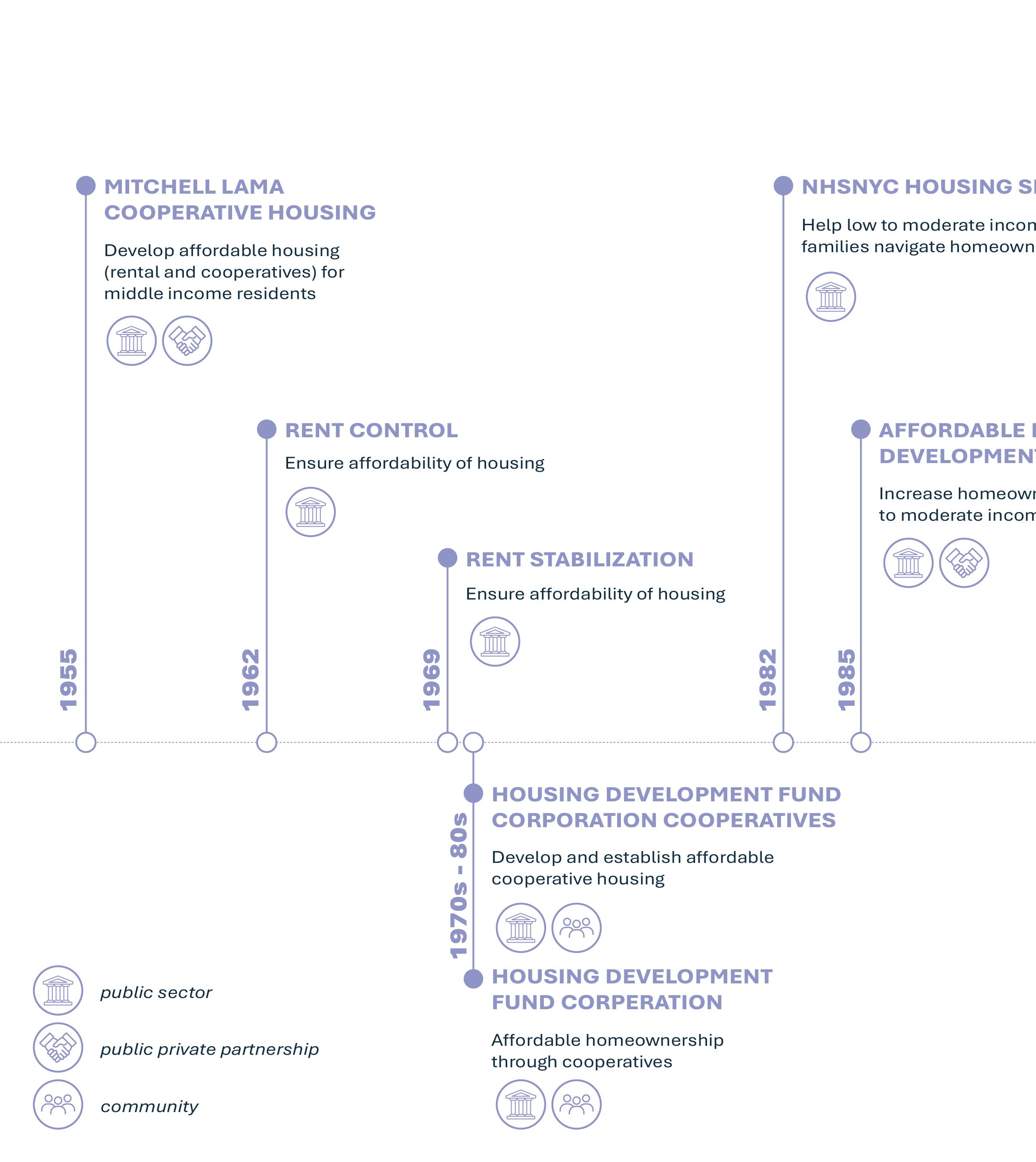 Looking at New York’s housing crisis requires a comprehensive assessment of the subsidized housing stock the city has tried to maintain over the past and current century. The four major historic social housing programs in New York are comprised of (1) the Mitchell-Lama programs launched by New York State in 1955 and predominant between 1960 and 1977, which provided middle-income housing to the city (between 80 and 130% of the median income), (2) HUD (Department of Housing and Urban Development) federal funding or assistance programs, targeting households with incomes below 80% of the median income, over a period of 20 to 40 years - which have been dominant in the 1980s, meaning that a large portion saw their affordability expire recently, and (3) LIHTC (Low income housing credits), an indirect federal aid program targeting the most vulnerable lower income households (50 to 60% of median income), a program that has dominated the