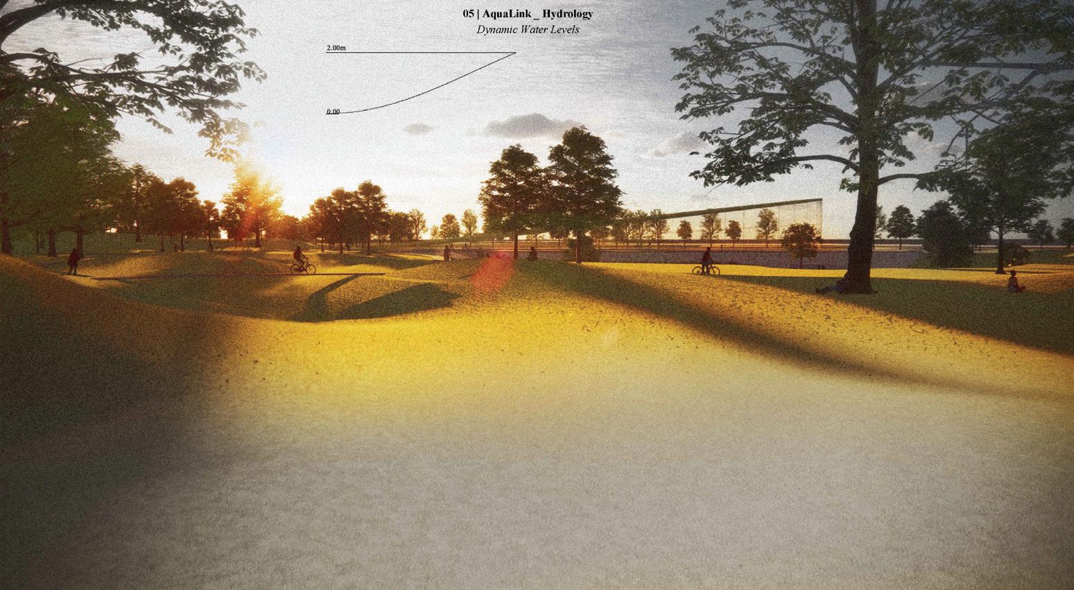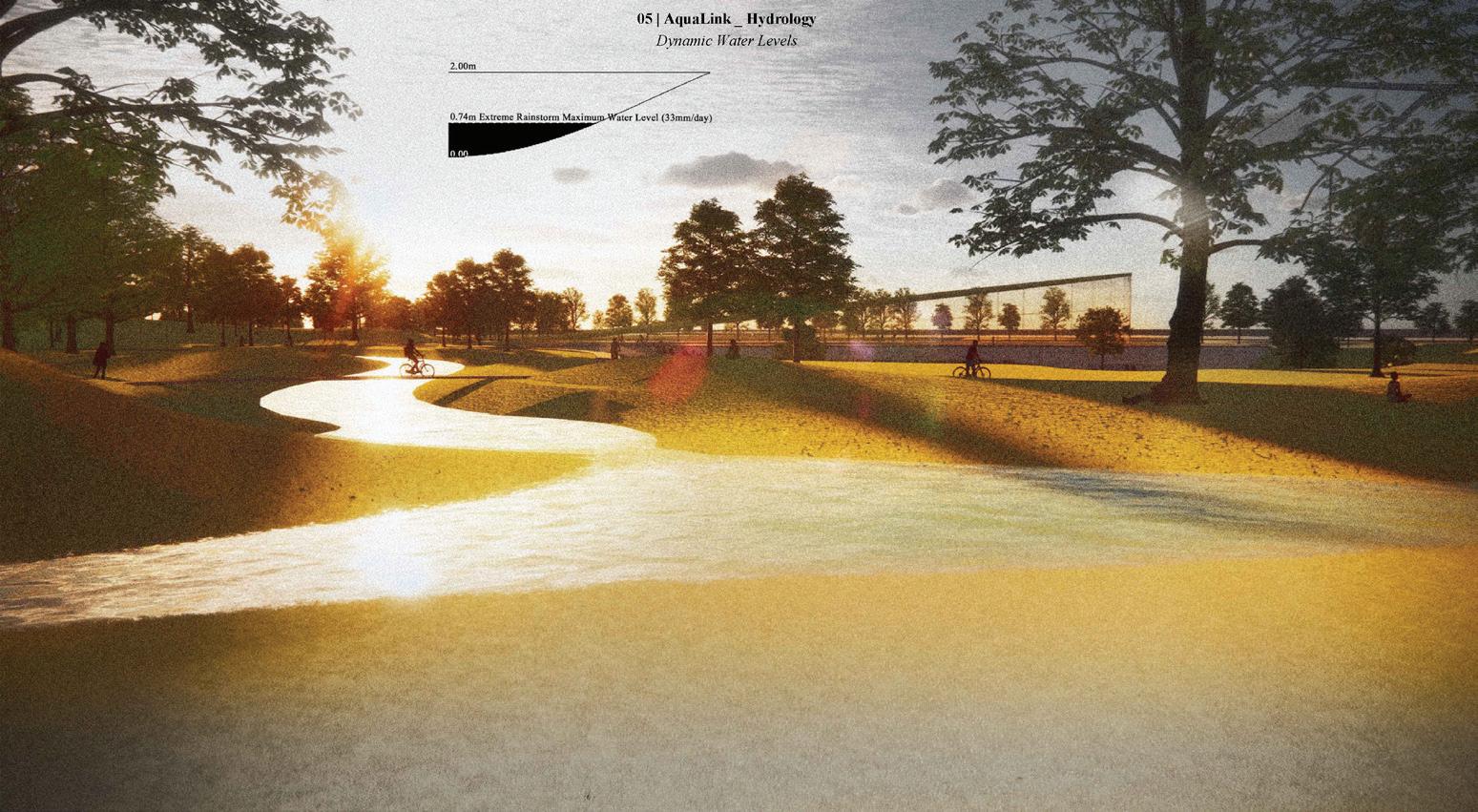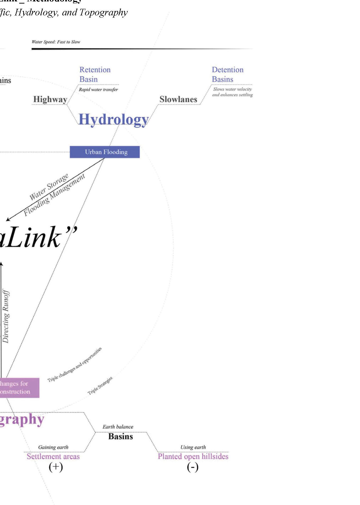 The AquaLink initiative aims to tackle the issues of flood management and drought through the development of an integrated space that connects multiple transportation and water systems. Working within Node 3, the project proposes the adoption of a new spatial language and land use that promotes higher resilience in rainwater management.