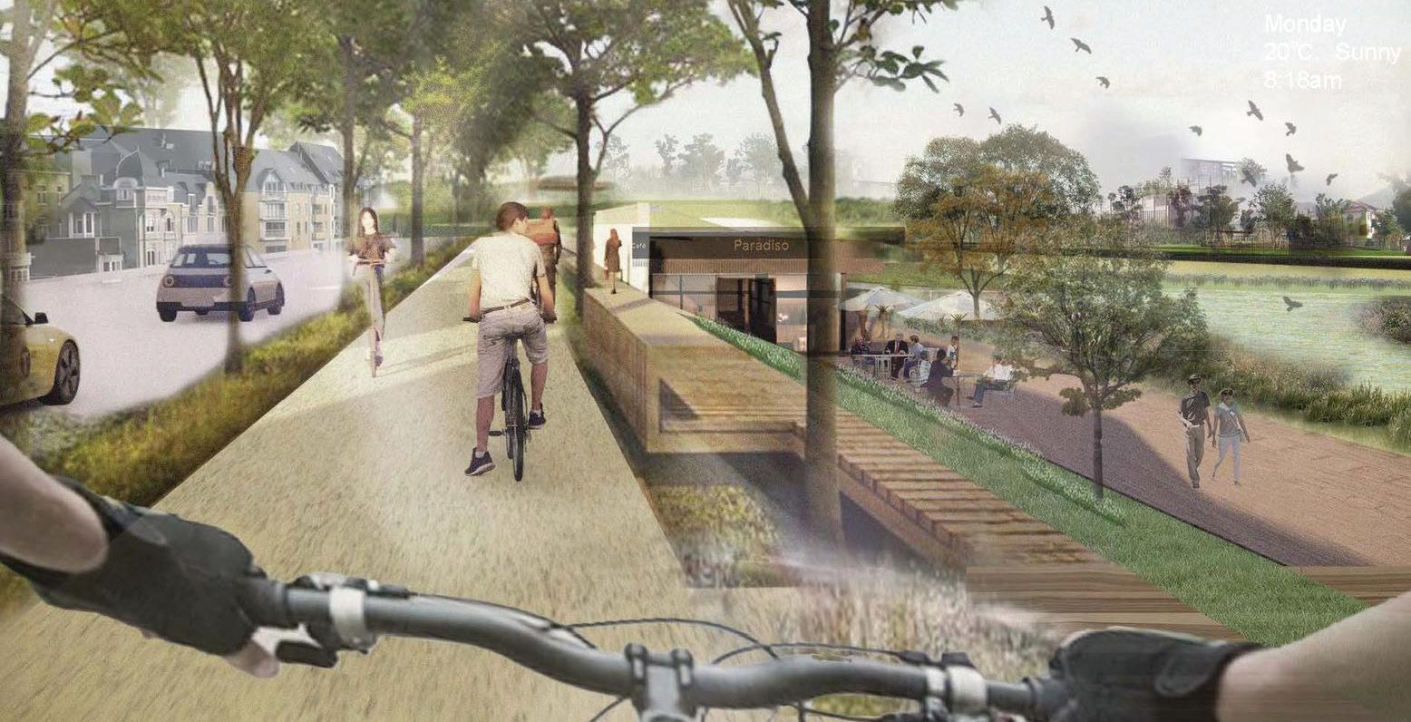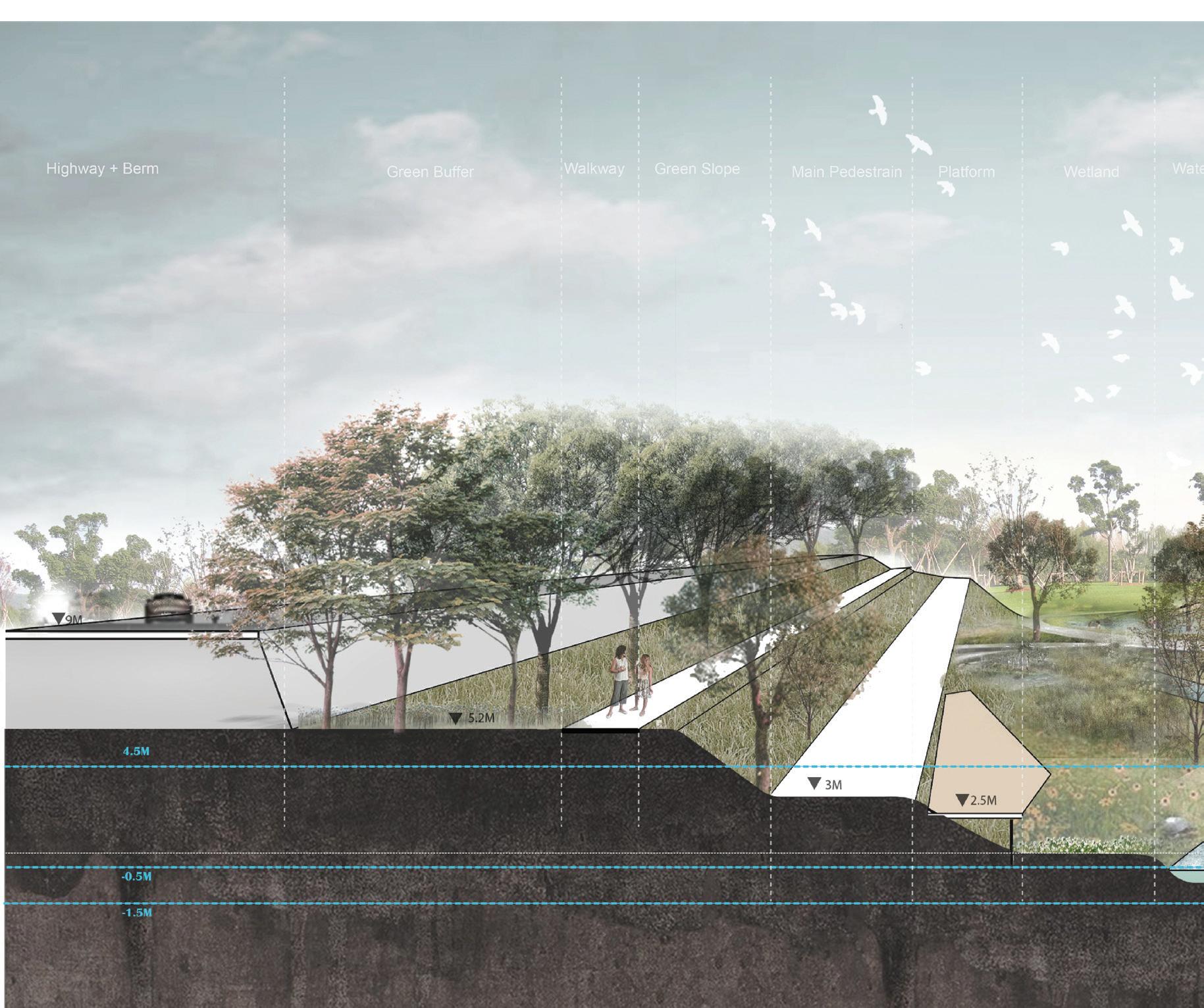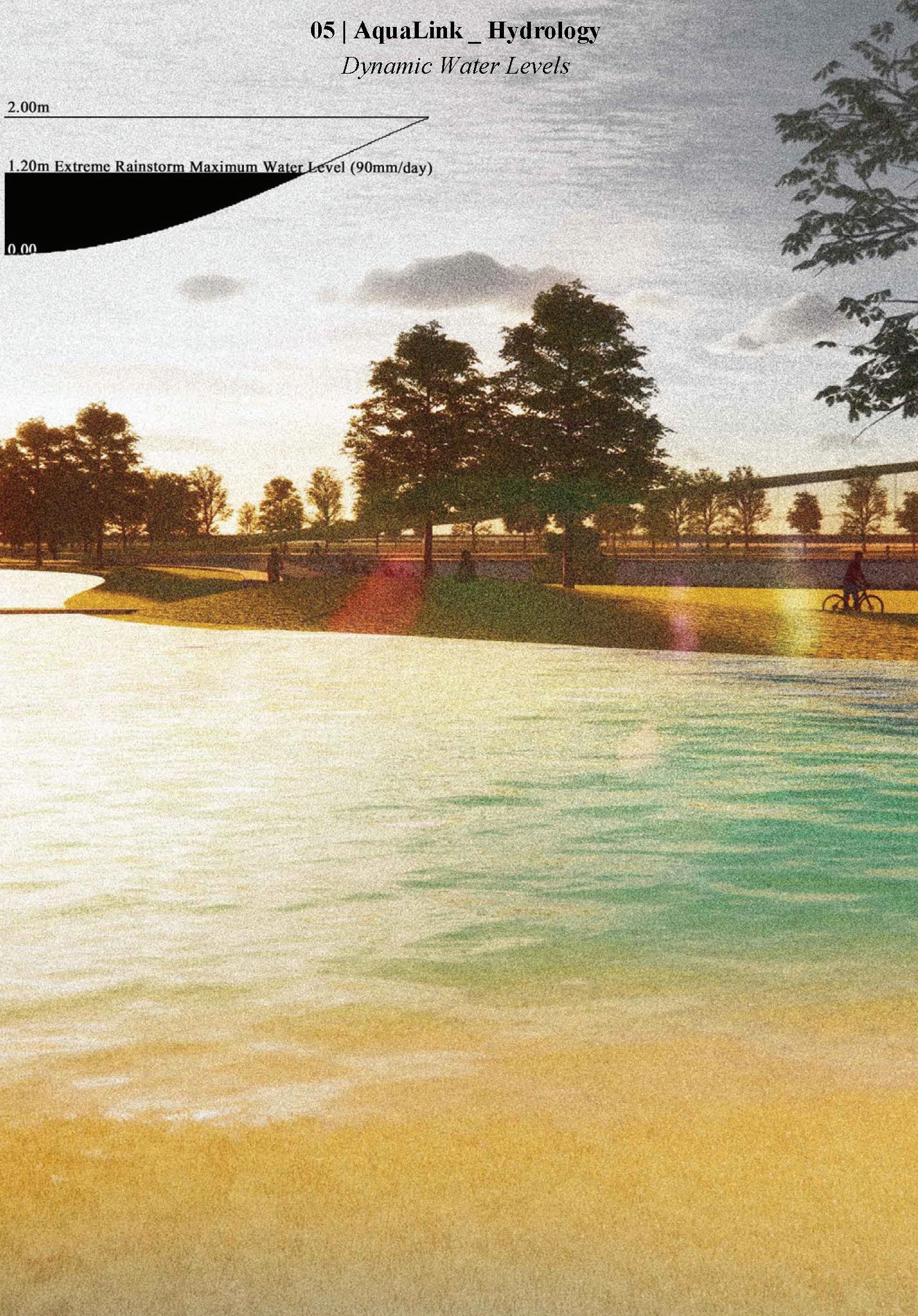 The AquaLink initiative aims to tackle the issues of flood management and drought through the development of an integrated space that connects multiple transportation and water systems. Working within Node 3, the project proposes the adoption of a new spatial language and land use that promotes higher resilience in rainwater management.