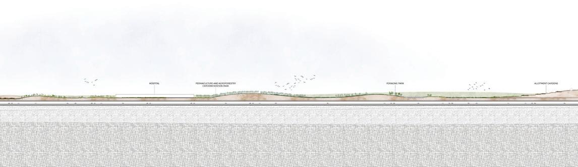 The project starts by identifying and analyzing the existing soil types and their qualities around the A102 underground highway, as shown in the “before” section. Then it proceeds to place new functions according to the features of the various soil types during the deposition process, as shown in the “after” section. These functions range from improved community garden and allotment space, an immensely popular existing usage, to wellness parks with microclimate-controlling topographical devices, from noise cancelling berms, to improved water infiltration and flood prevention techniques. This project sets a precedent for future underground and excavation projects.