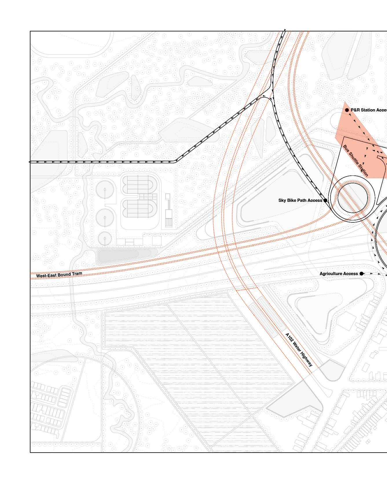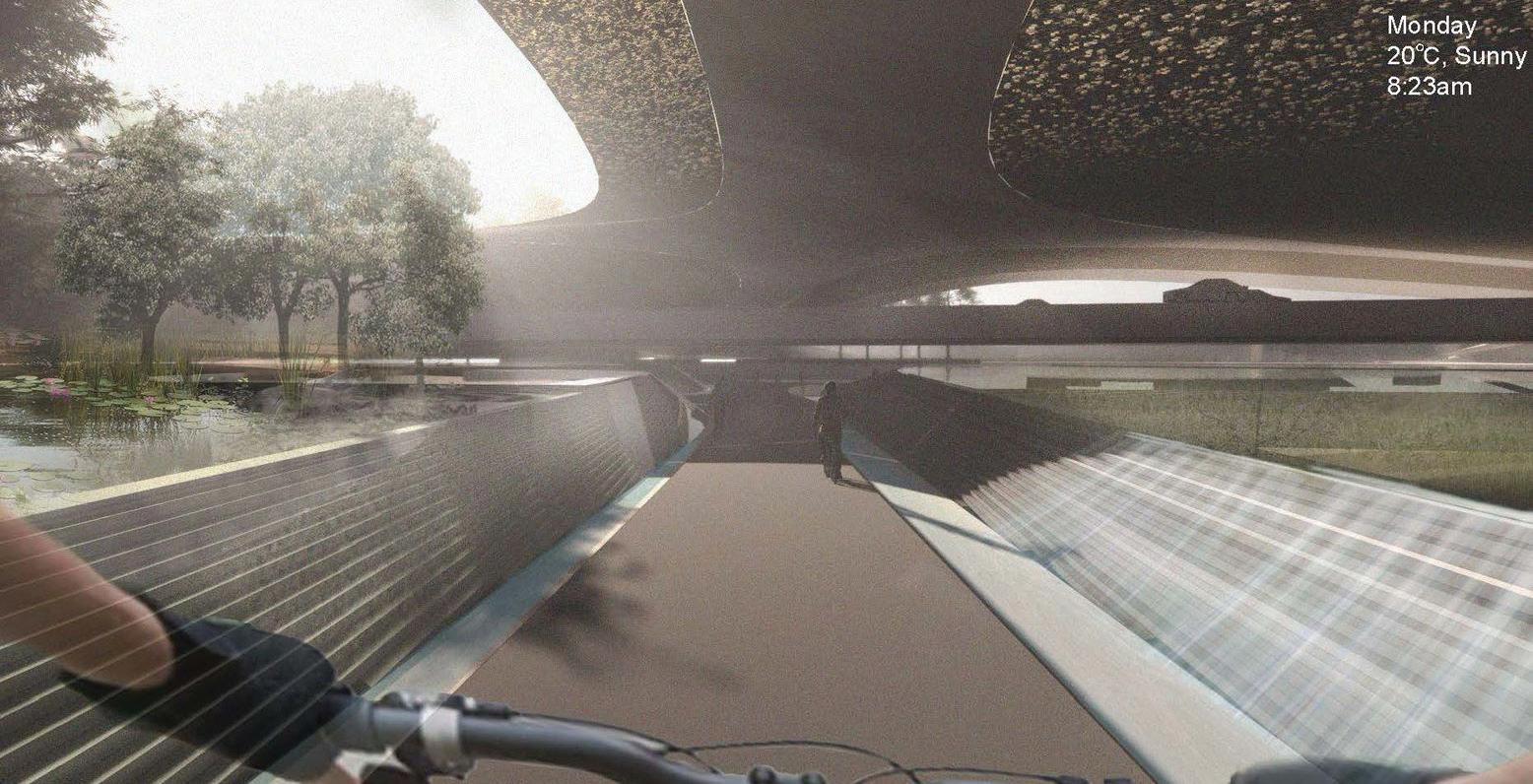 This structure collects water during periods of flooding, directing the water to three destination points; the natural waterbody to the north, a water treatment site on the west, and to the Fort to the south which is surrounded by an artificial lake. The hybrid station design allows the development of a transportation system that is both sustainable and efficient, operating above and below ground. Flooding is understood as an opportunity rather than as a threat as energy for the hub is generated through the movement of water. The design of surface transportation utilizes surface flooding to vertically separate the flow of pedestrians and bicycles throughout the seasons. The original chaotic circular traffic overpass node evolves into the transportation hub, combined with underground bike lanes.