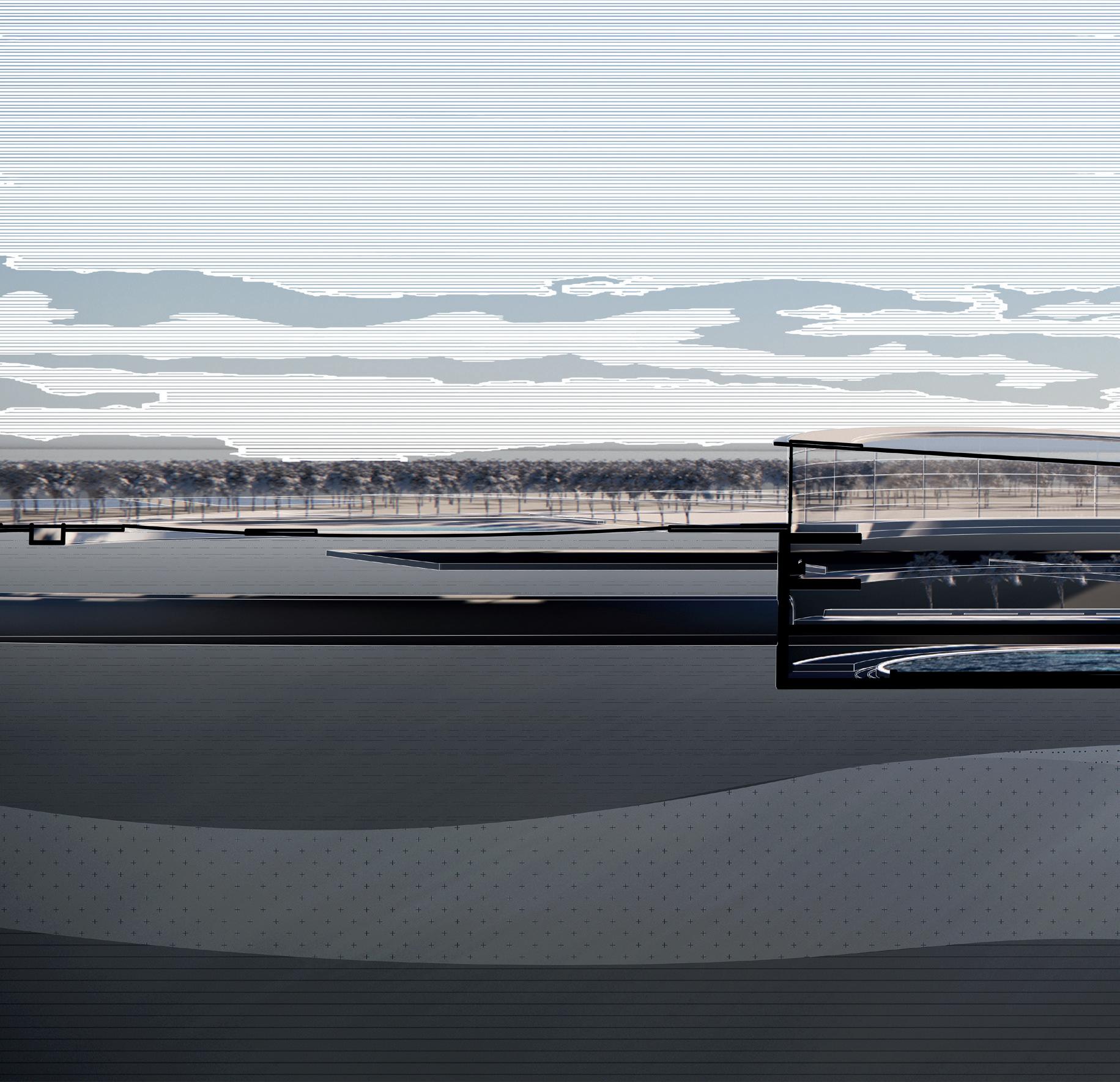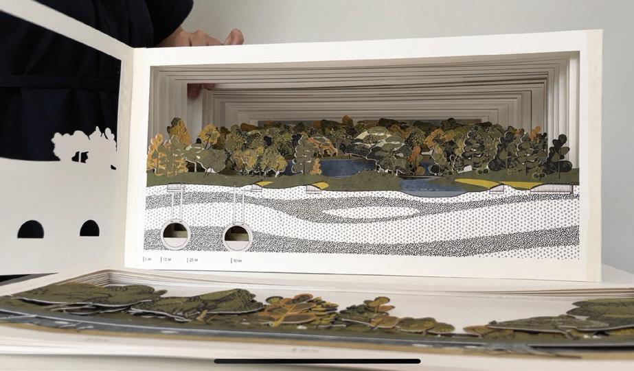 The entire infrastructure connects various nodes of the site and vertically separates pedestrian, vehicular, and bicycle paths, while integrating with A102 to form a transportation hub. The hybrid station design allowed the development of a transportation system that was both sustainable and highly efficient, operating both above and below ground. The underground parking lot is integrated into the overall water circulation system, connected to the artificial detention pond, creating a vertical waterscape that serves as a park and ride lot for citizens. The “green arm” on the site will serve a dual purpose: providing a pedestrian-friendly green space and directing stormwater towards the detention pond. This system was not hindered by the threat of flooding but instead utilized the power of water to create a more convenient life scenario for people as they moved throughout the city.