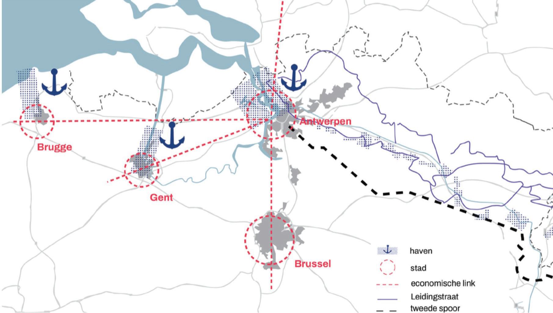 to the Port of Antwerp also more or less follows the route of the reserved strip for the A102. Looking it within a larger EU context, the “Leidingstraat3,” a planned strip of land of 45 meters wide, going from Antwerp in the direction of the German Ruhr area, to the Belgian-Dutch border at Geleen (fig. 3).