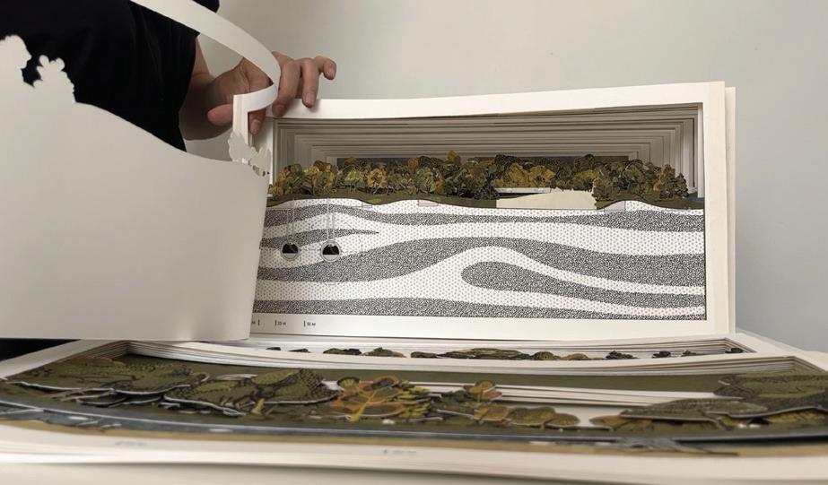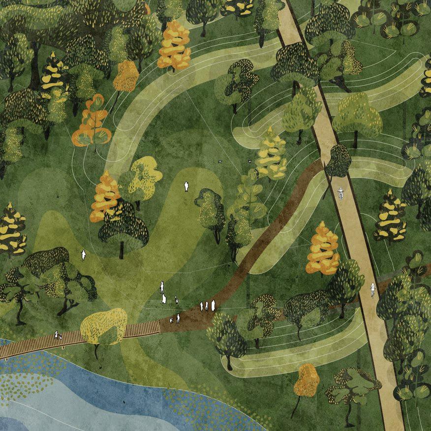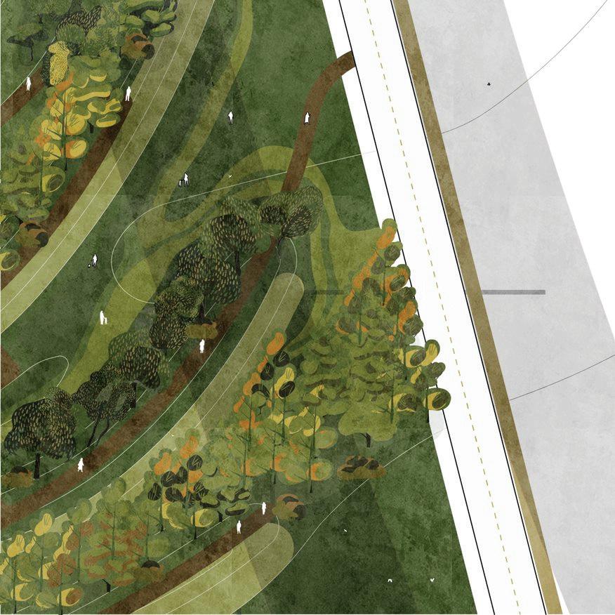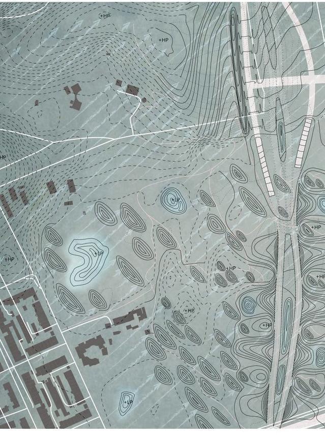 Following new understandings in plants’ abilities to uptake gaseous pollutants through their roots, this project imagines how a network of biofilters could be attached to the ventilation system. Creating a landscape from the topographies of these biofilters, this project proposes ideas for how this mechanical and highly engineered “below” can create a picturesque and pastoral landscape “above” that supports community needs regarding mobility but also larger regional concerns regarding the health of the Albert Canal and the greater Scheldt Estuary.