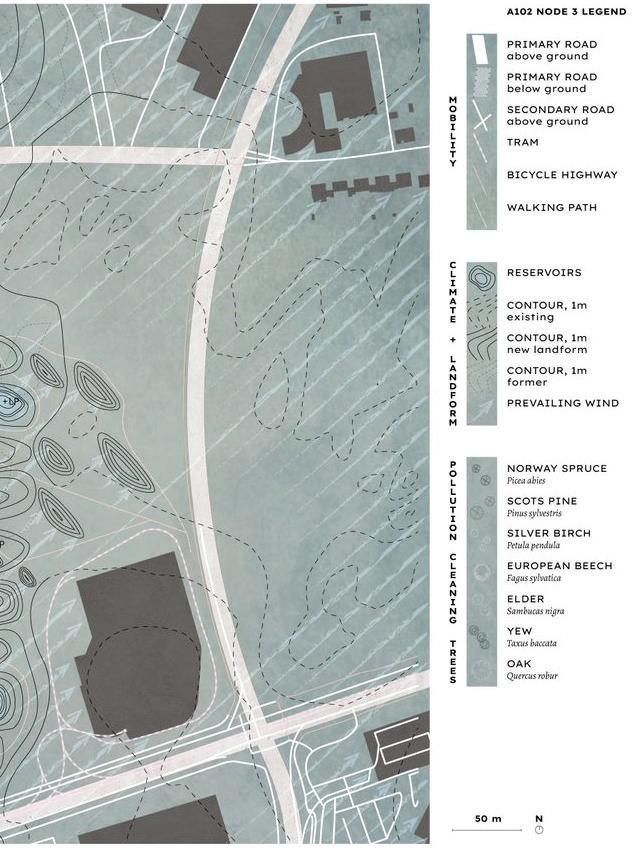 The noise intervention strategies on Node 4 are fourfold: 1st, a triangular system of landforms around the entrance of the A102 is introduced; 2nd, a series of traffic circles and baby berms are sprinkled throughout the region to slow down all traffic; 3rd, a 6-layer barrier of trees on the interior of the landform system is maintained; and 4th, a recirculating waterfall system on the exterior of the landform is enacted to create constant white noise.