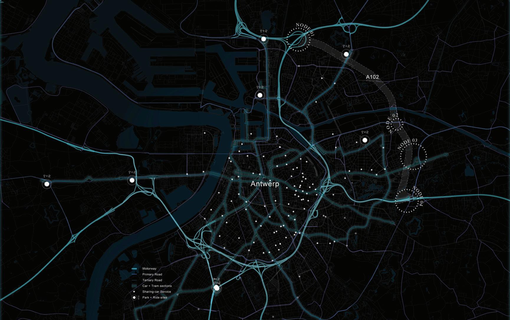 Citizens of Antwerp can navigate the city entirely without cars. An extensive network of tram and bus lines covers the entire city, and many of the P+R sites along the city fringe enable suburban commuters to park and enter the city by public transportation. Traffic toward the Port of Antwerp is the main cause of the current congestion. Thus, even though the extensive road infrastructure toward the port has severely affected the urban structure and the quality of citizens’ everyday lives, that infrastructure is not essential to their lives. This disjuncture between what the citizens really need every day and what has been implemented must be carefully considered, especially if the city is to achieve the carbonneutral goal by 2030. How can the A102 make the city less car dependent through innovative interweaving?