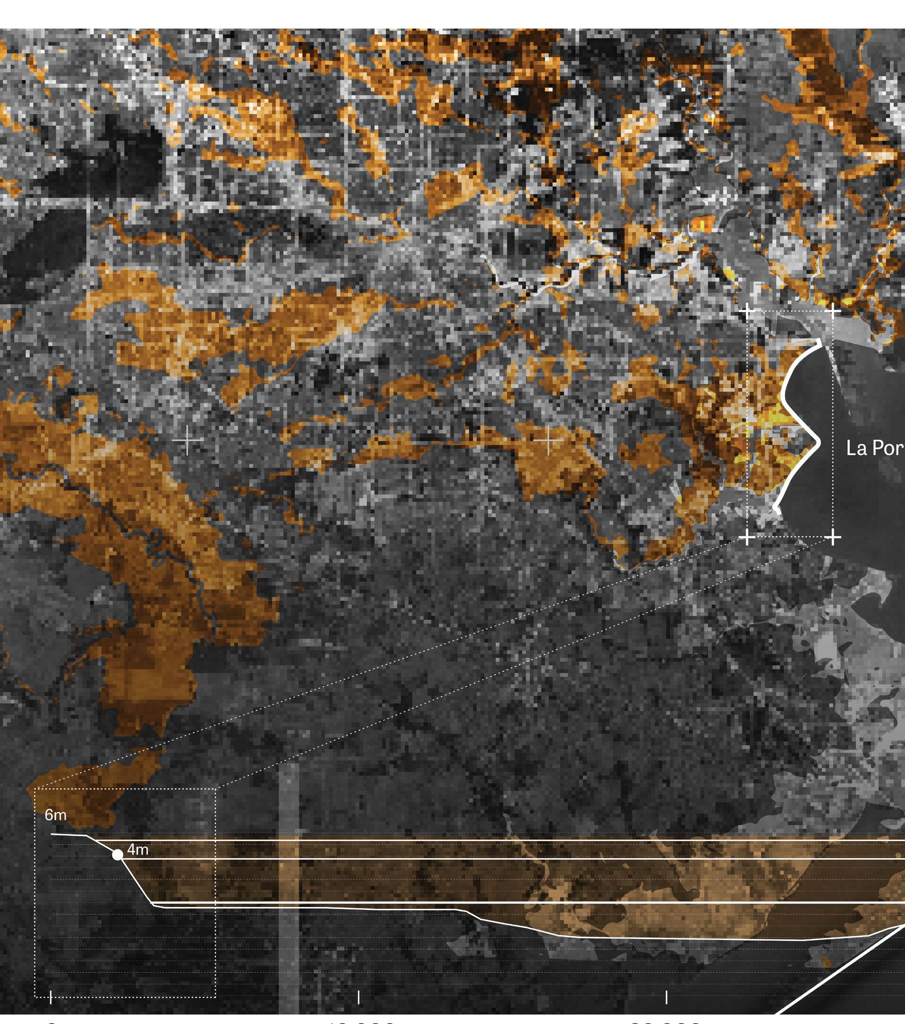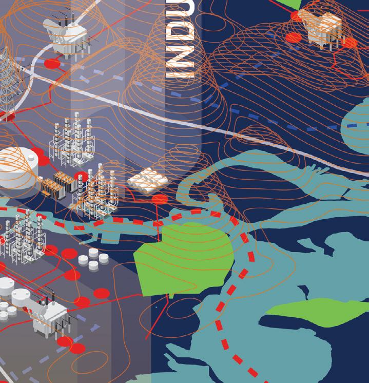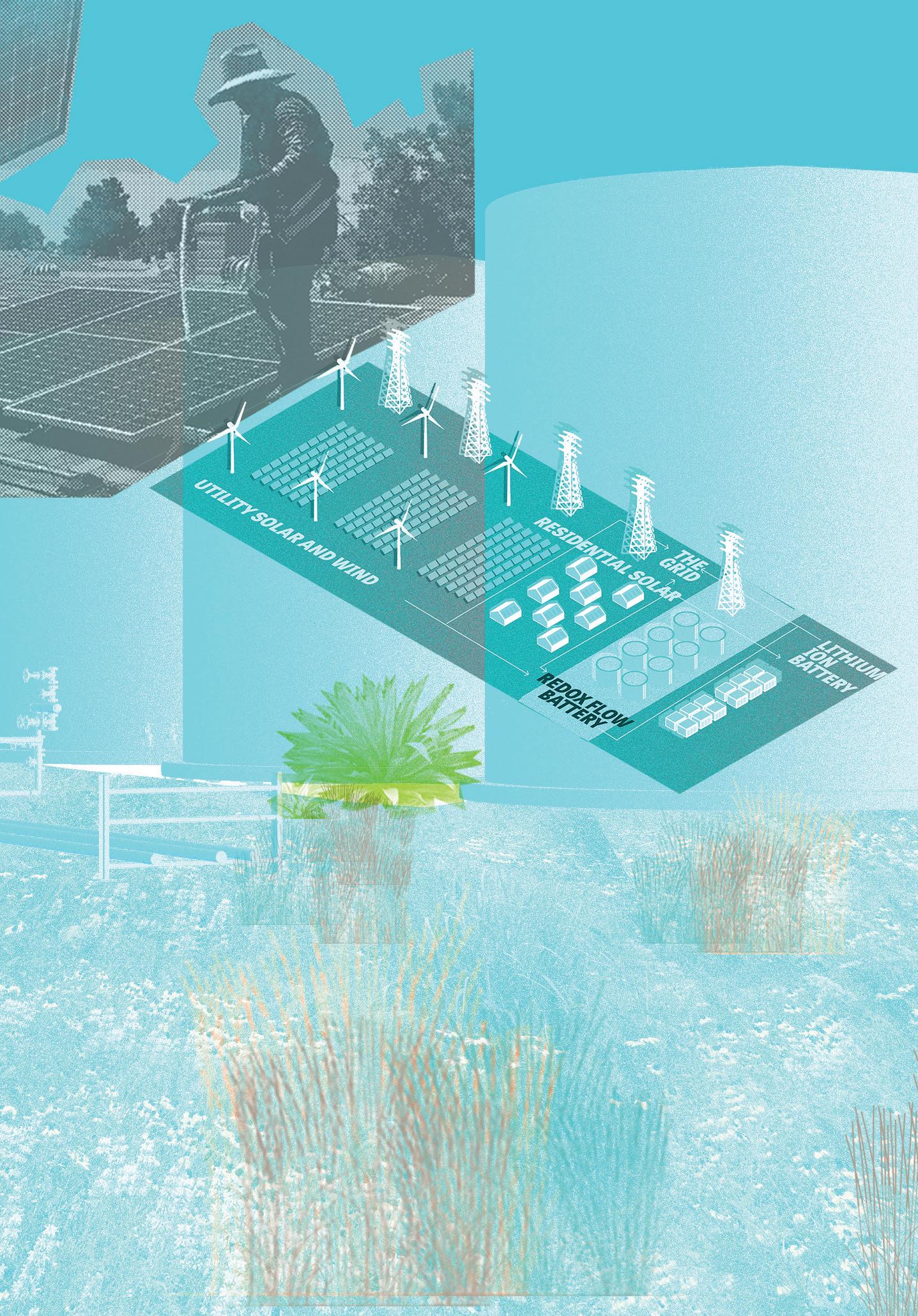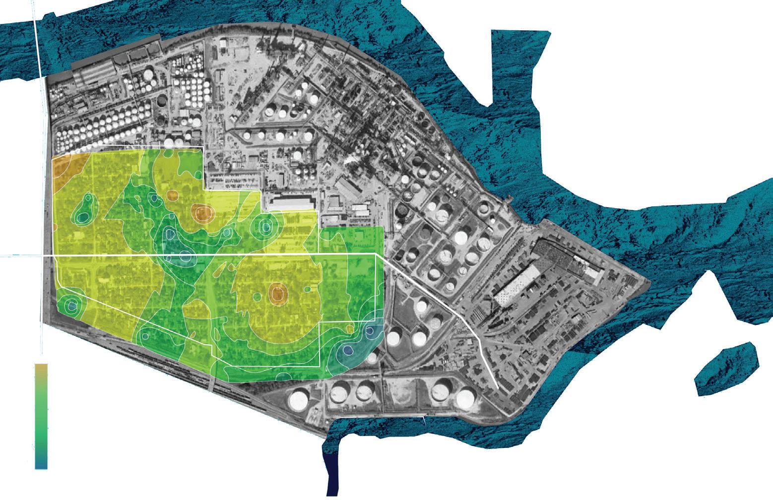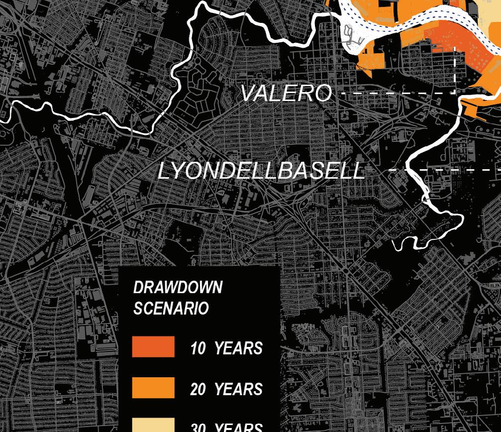 The inevitable drawdown of fossil fuel infrastructure and the accompanying changes in land use and infrastructure can allow for large-scale environmental restoration, including the use of nature-based solutions for remediation and flood control. While analyzing the geological, hydrological, and ecological history of the area and learning about different ways to “build with nature,” students began to envision ways to rebalance the built and natural environments by incorporating natural infrastructure at all scales.