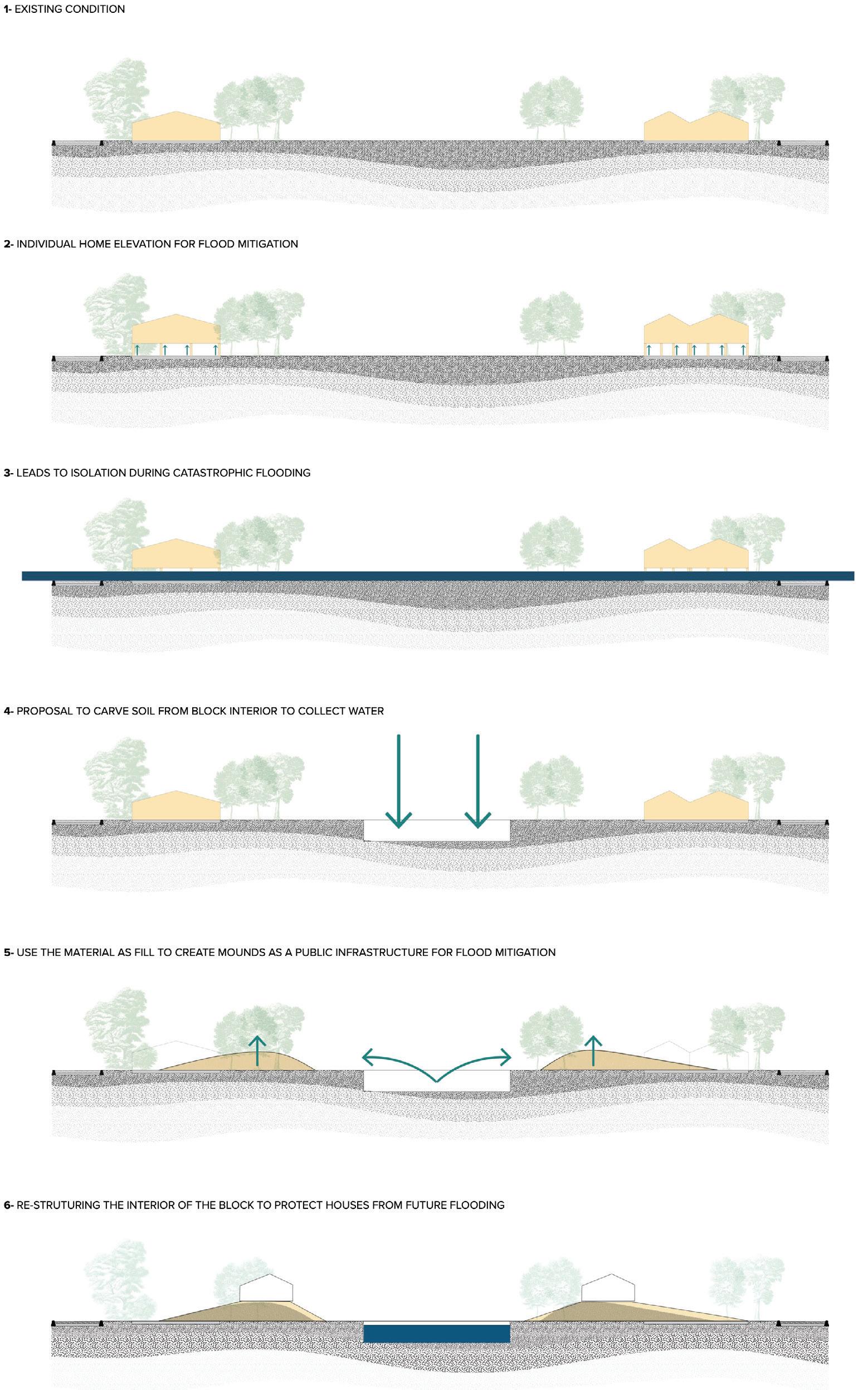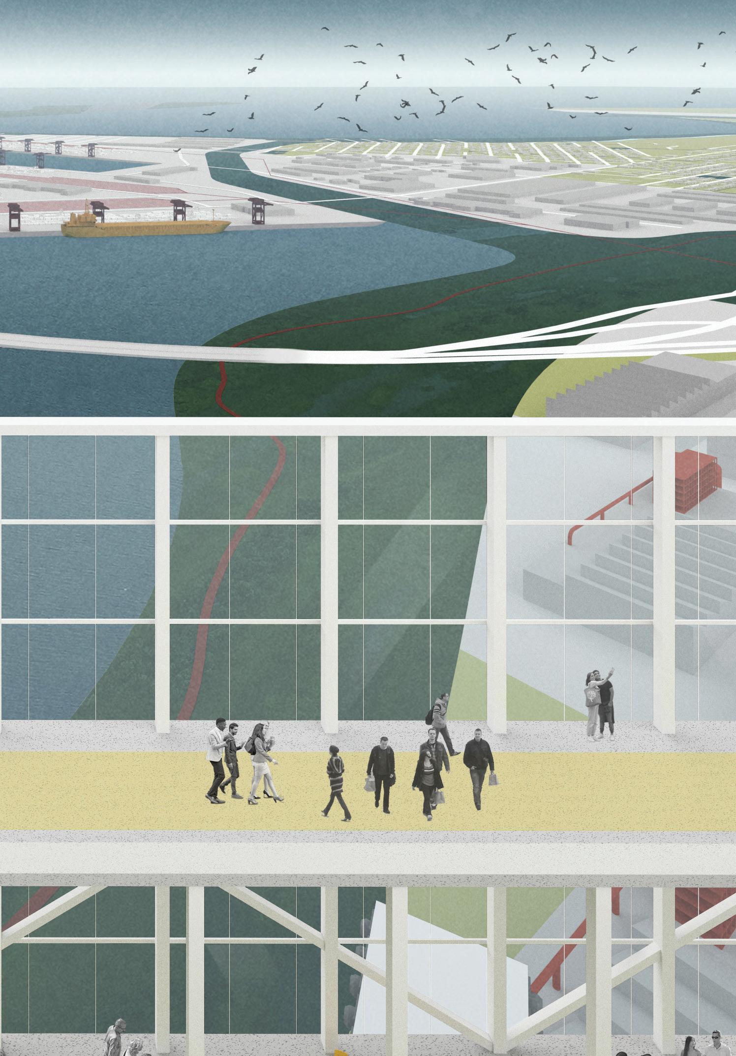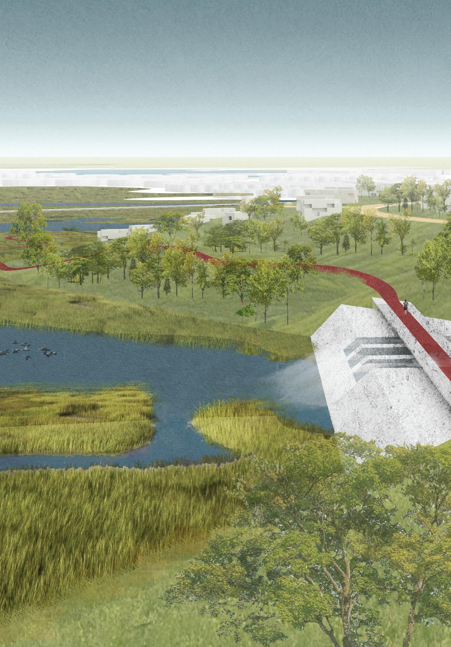 These new landforms create elevated platforms that integrate affordable housing and recreational facilities. This approach leverages infrastructural systems to create opportunities for low-income residents to live in desirable waterfront locations. The design, attuned to the fluctuations of the local ecosystem, creates a marsh ecology that benefits from periodic inundation, an energy tide connected to generation and use.