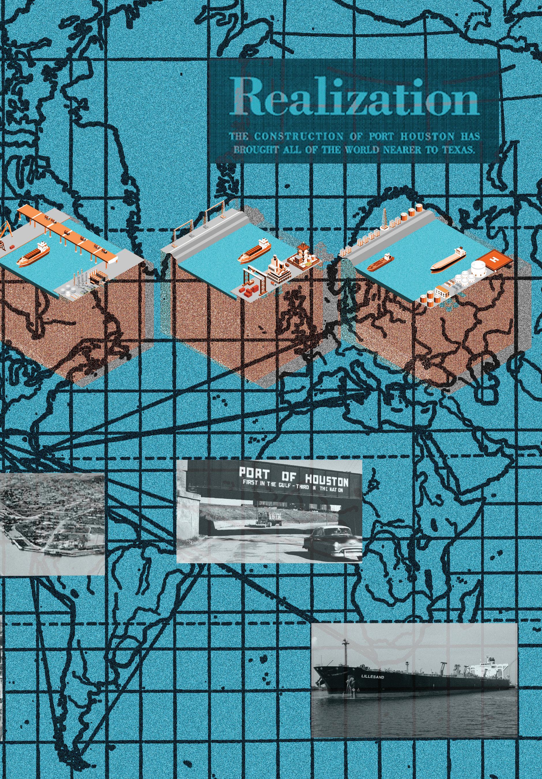 In addition to energy, the city of Houston is characterized by a culture of spectacle, as evidenced by its grand monuments and landmarks. This project takes the position that for Houstonians to embrace the energy transition, these existing characteristics will need to be embraced to engender a shift in the city’s self-conception. Our design centers on four sites moving outward from downtown along the Ship Channel towards a consolidated port. Each site represents a step in the energy transition process, incorporating community actors, a hybrid infrastructure intervention, and material and energy flows.