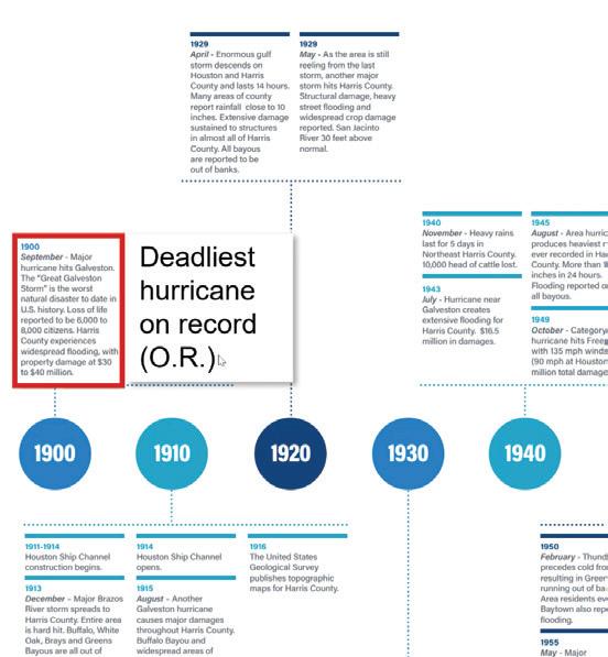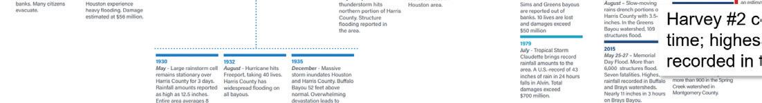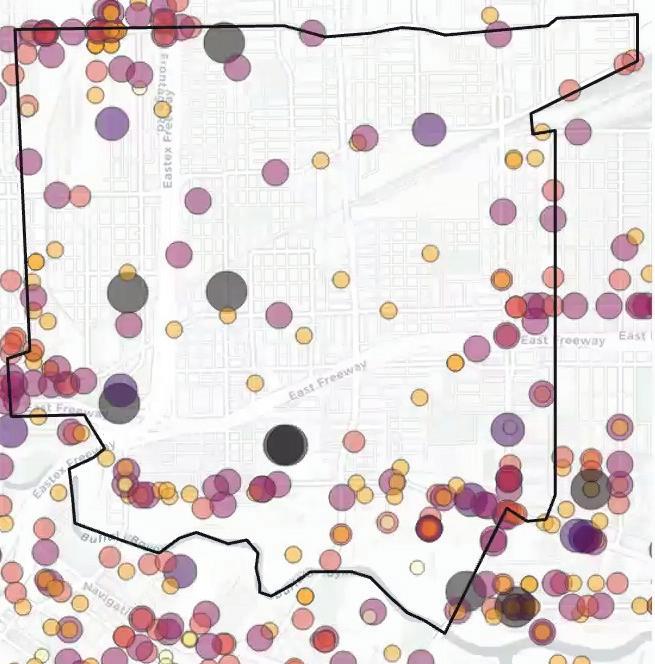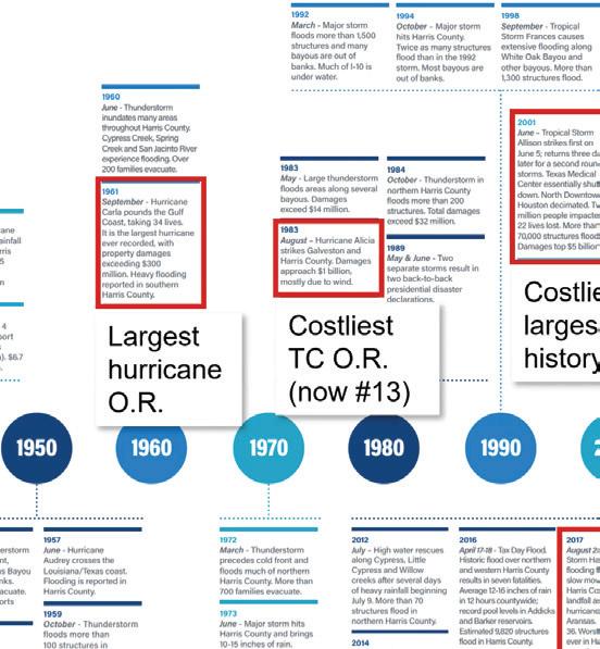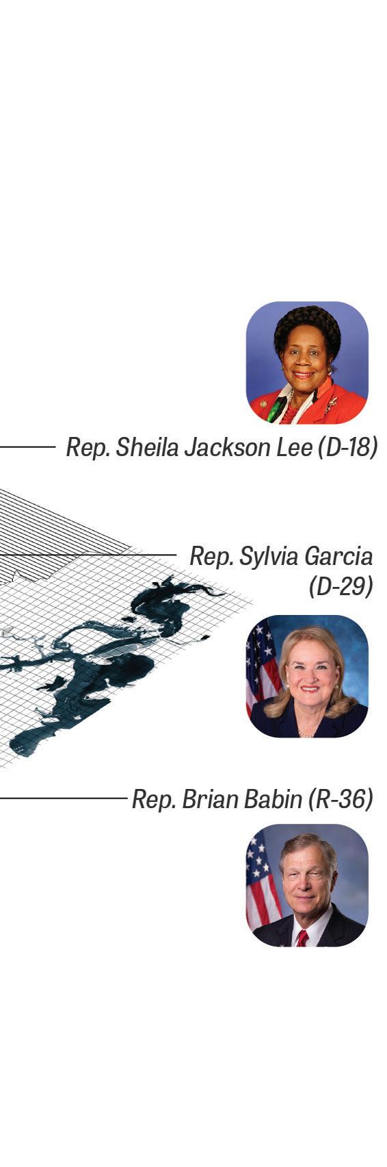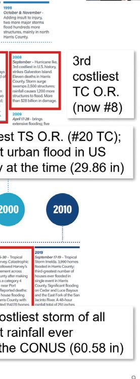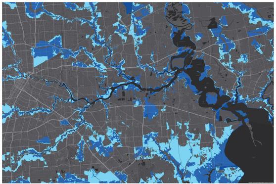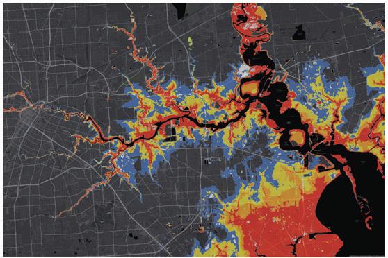 Houston is one of the US cities most impacted by the climate crisis. In the 2010s, a number of onethousand-year storms hit the area, including the Tax Day Floods and Hurricane Harvey. Harvey unleashed up to fifty inches of rain on the city, and the Harvey-related costs attributed to the climate crisis are estimated to be as much as $67 billion USD. In 2021, Winter Storm Uri resulted in the collapse of the energy system. And while 2008’s Hurricane Ike had limited impacts on Houston proper, sea level rise and increased