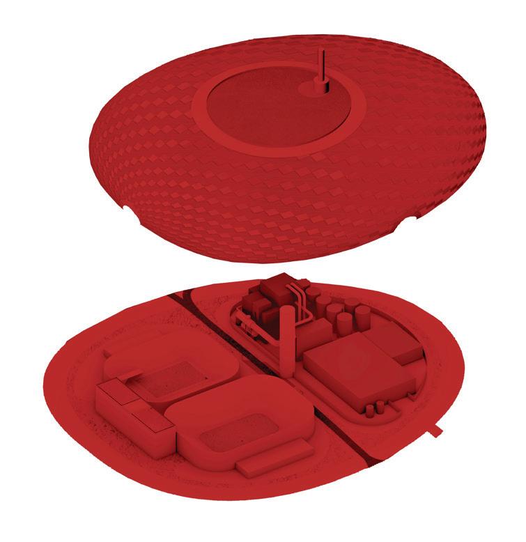 The Light House is a carbon sequestration incubator composed of three volumes and linked at its base to the Houston Maritime Museum. The lowest volume is an innovative carbon-sequestration startup incubator. The middle volume is a CO2 direct-air-capture tower that produces pressurized CO2. The tallest volume houses offices for the Port of Houston and spaces for venture capital investors looking to fund local innovation. The building is capped by the Museum’s public observation deck, which overlooks port activities, the Shipping Channel, and Galveston Bay. Once carbon sequestration infrastructure is expanded, the Light House startups scale up to the surrounding district, turning CO2 into a resource that offers new opportunities for entrepreneurship. These innovations feed into a broader low- and net-negative carbon manufacturing industry that can address the need for materials with a low embodied energy. Such materials are an essential component of a post-carbon future.
