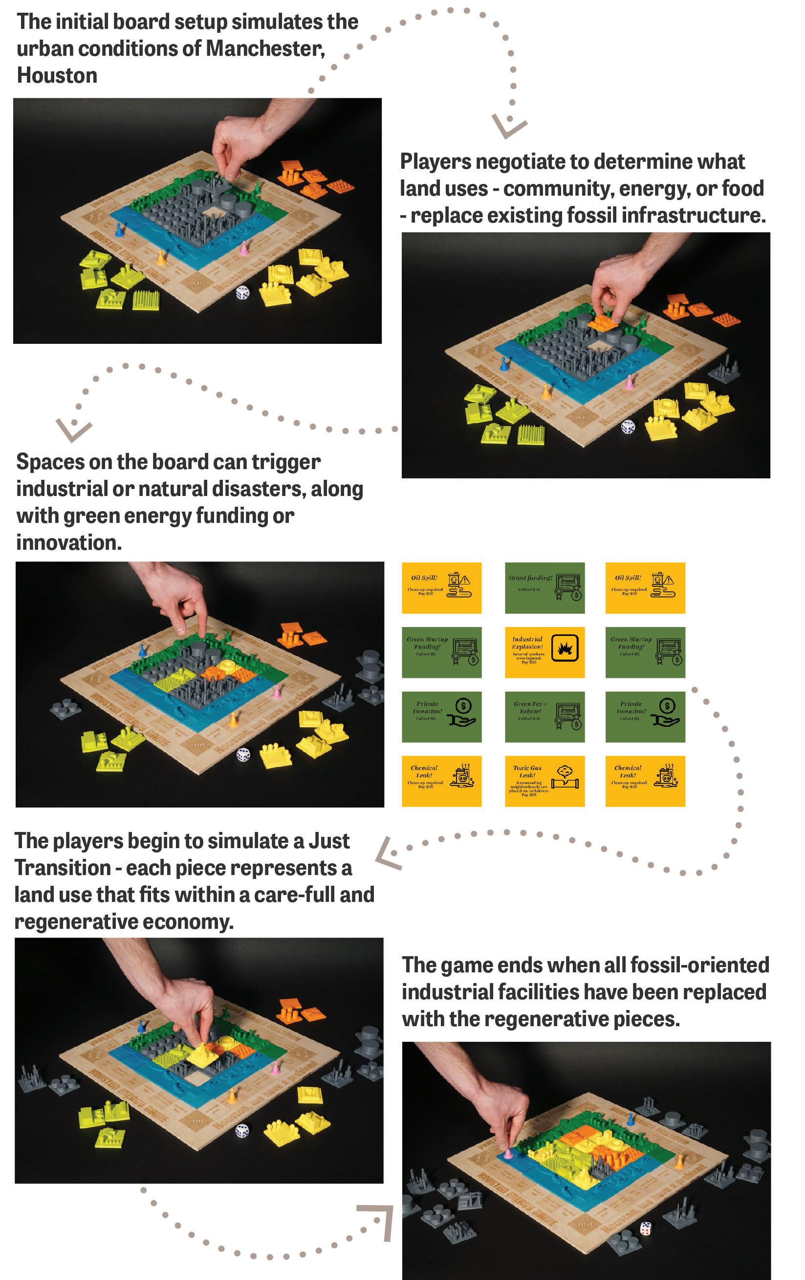 munity meetings, storytelling, and games. The collective created The Houston Energy Games to facilitate community-based articulation of the fossil-fuel-free and sustainable futures they imagined for themselves. But they knew imagining was just the beginning. Their organizing values included truth, reconciliation, and accountability between marginalized communities and powerful entities whose activities played a major role in climate change.