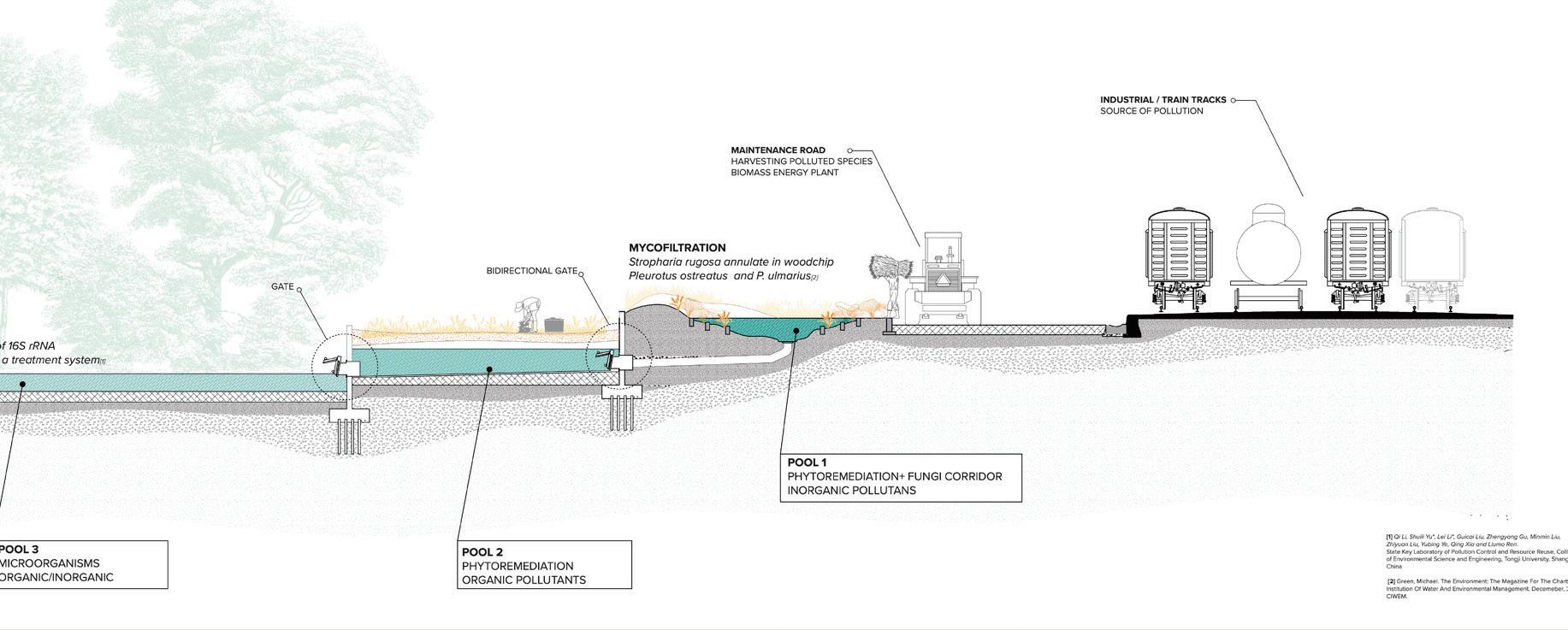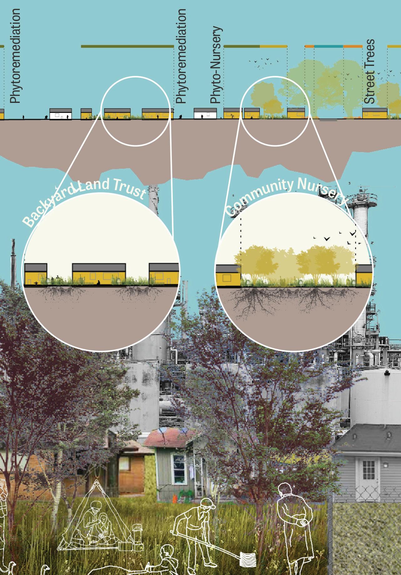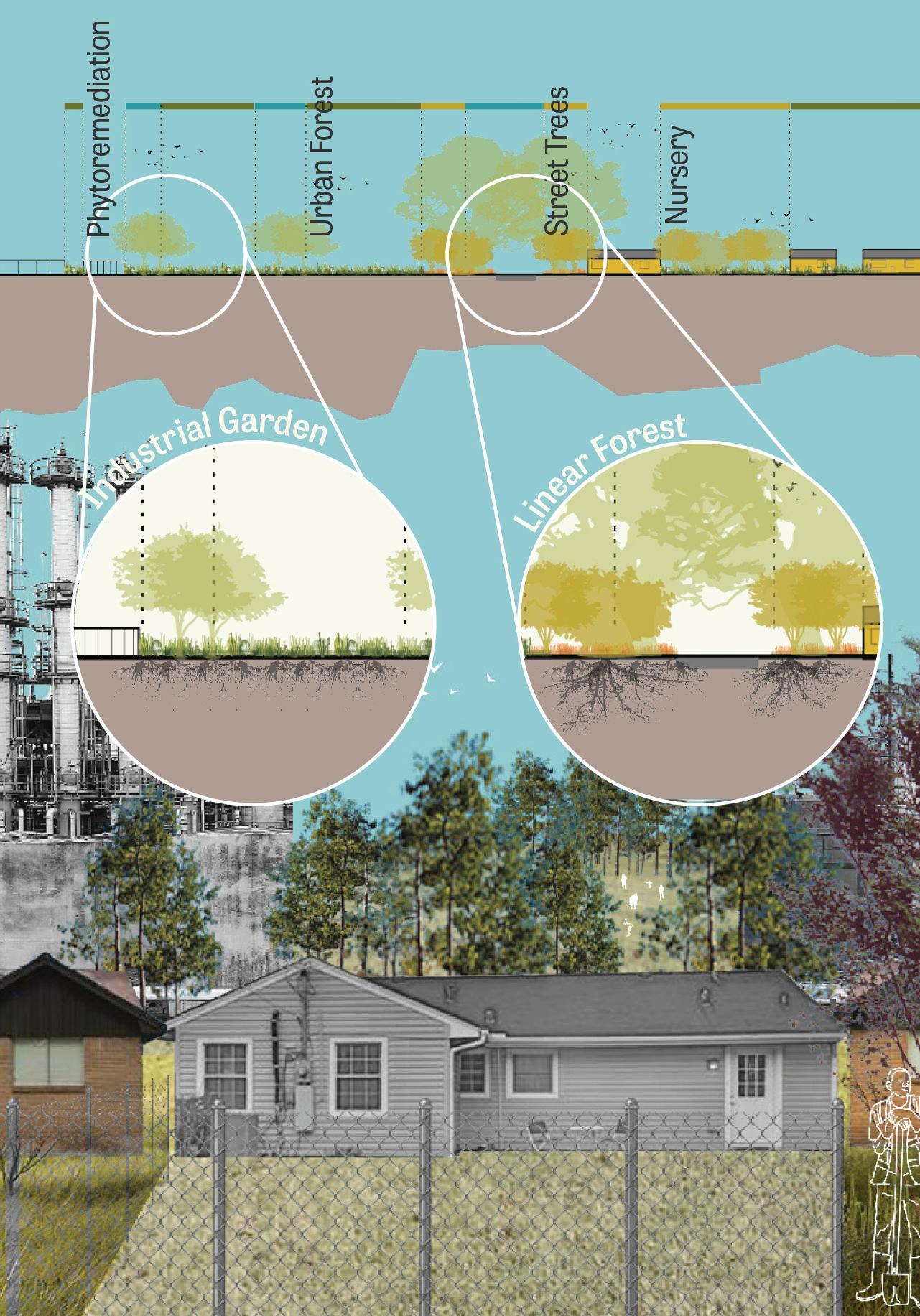The intervention serves as a platform for community voices. Its program includes an environmental justice magnet school and community offices, a wastewater treatment facility relocated out of the floodplain, indoor and outdoor remediating plant nurseries, and a community greenhouse. These changes help to remediate the adjacent scrap yard and builds community food security.