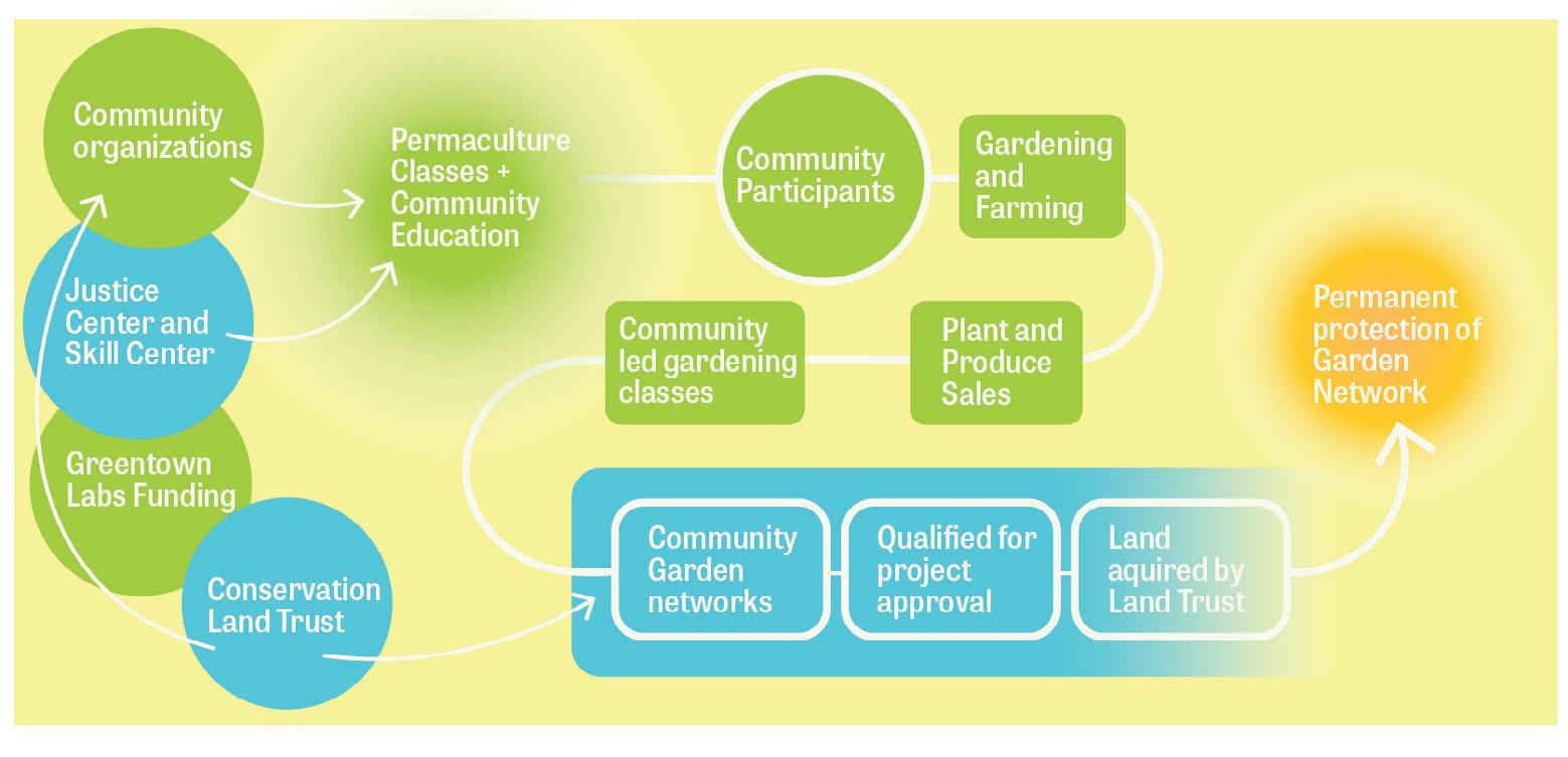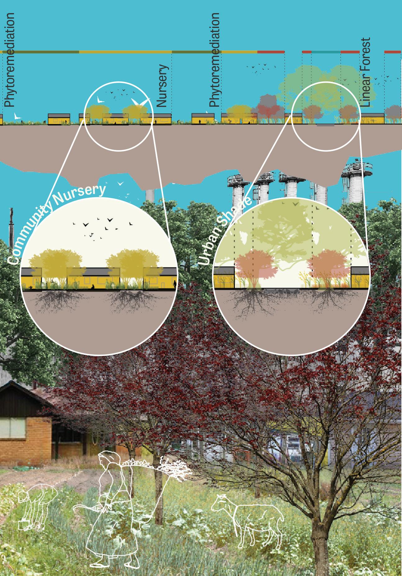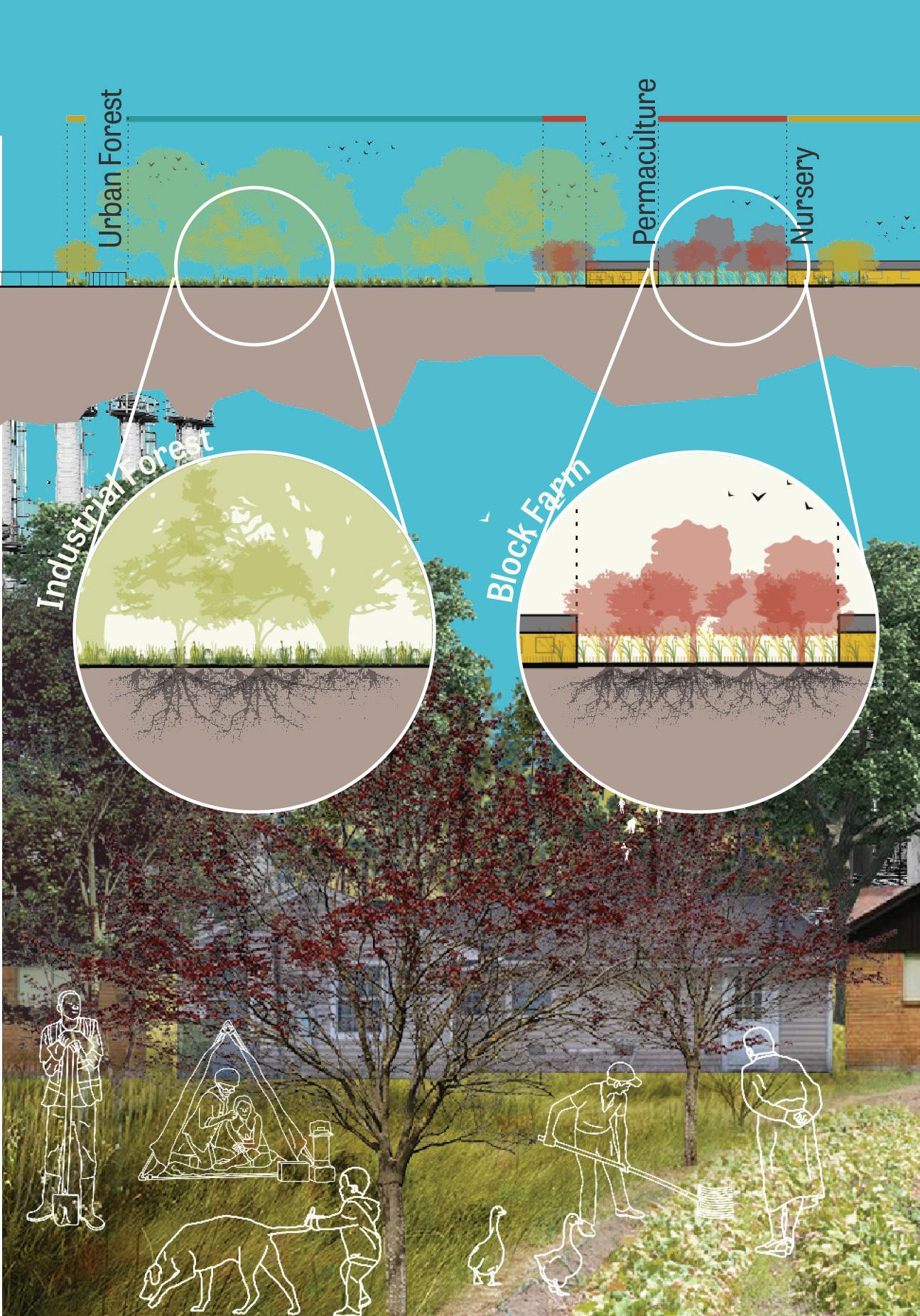 The intervention serves as a platform for community voices. Its program includes an environmental justice magnet school and community offices, a wastewater treatment facility relocated out of the floodplain, indoor and outdoor remediating plant nurseries, and a community greenhouse. These changes help to remediate the adjacent scrap yard and builds community food security.
