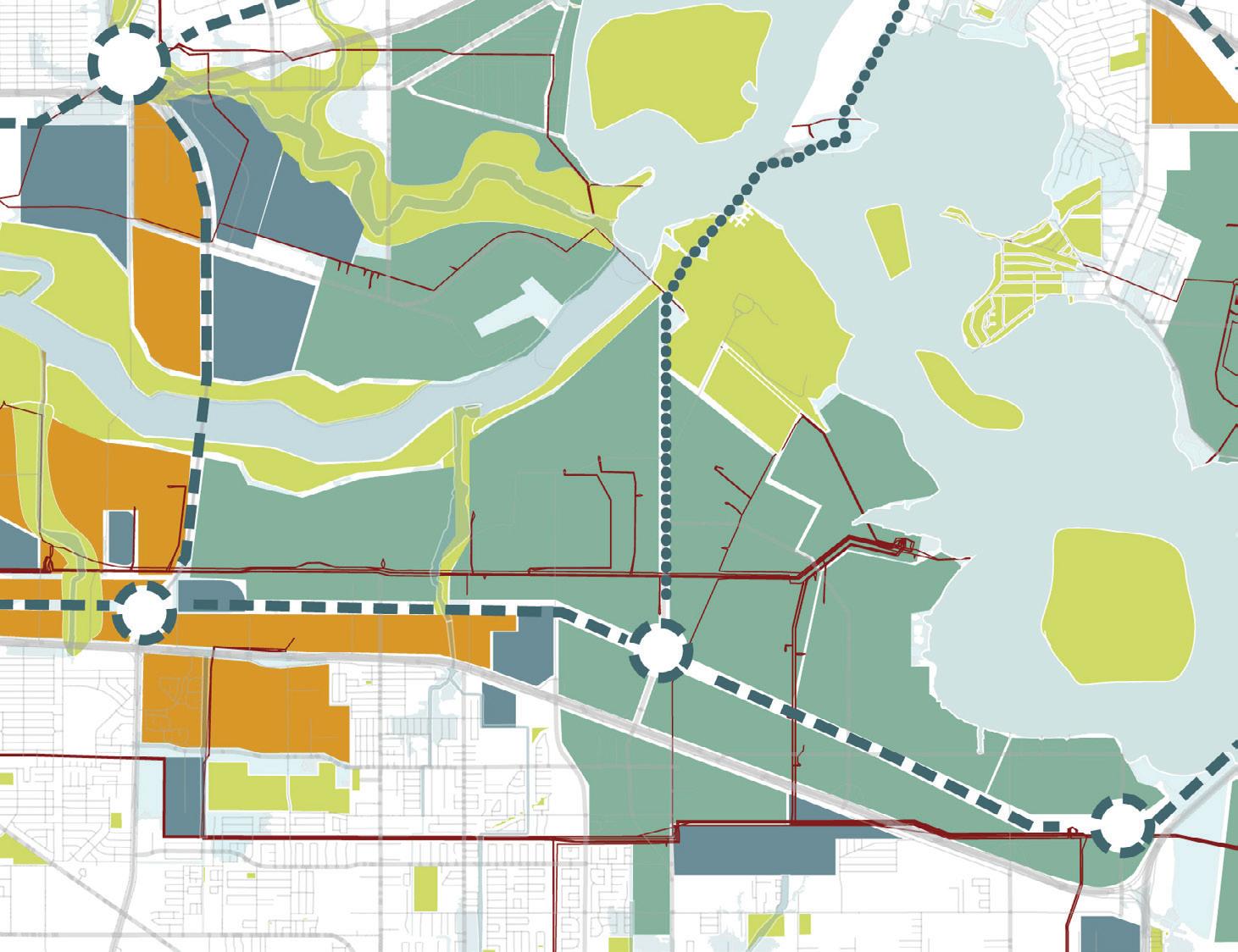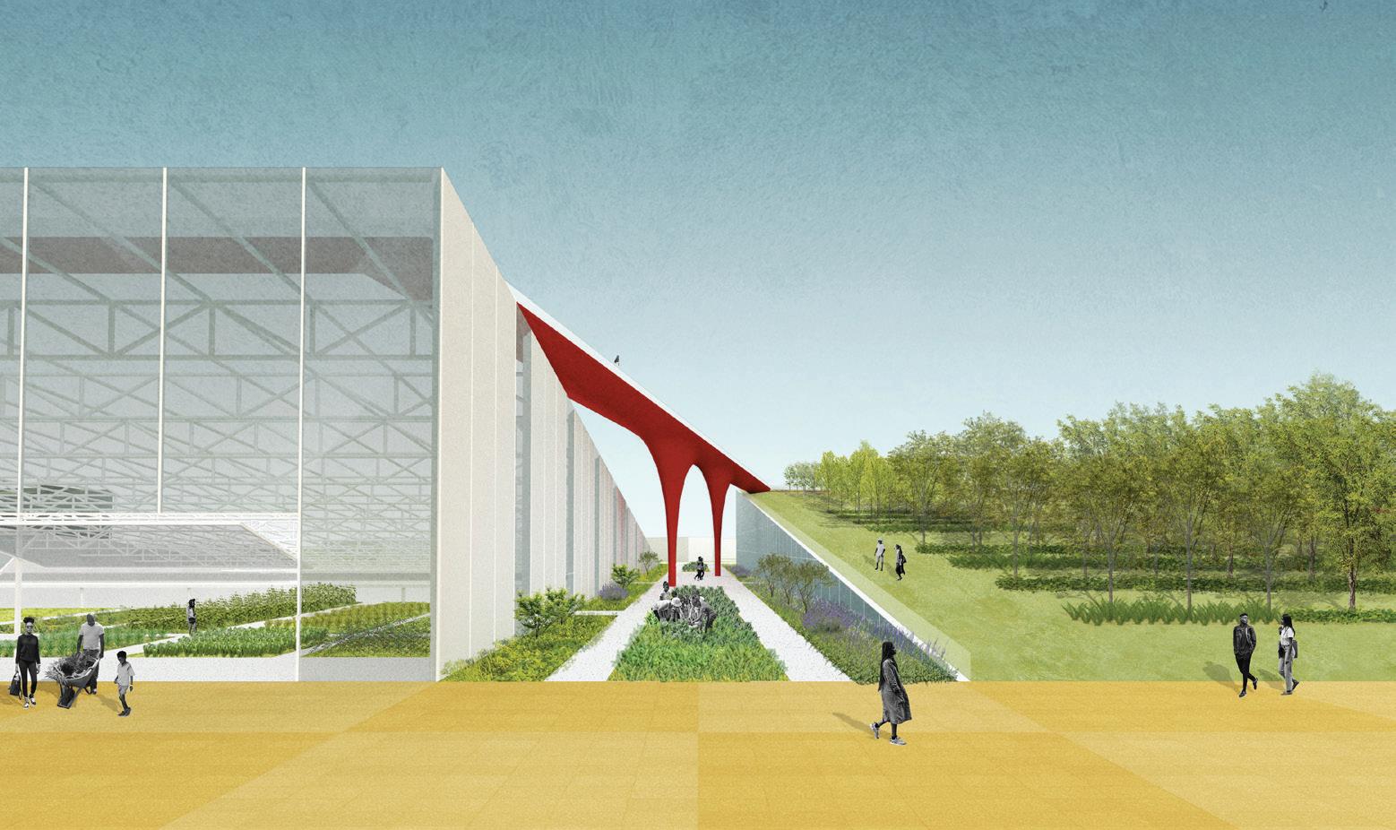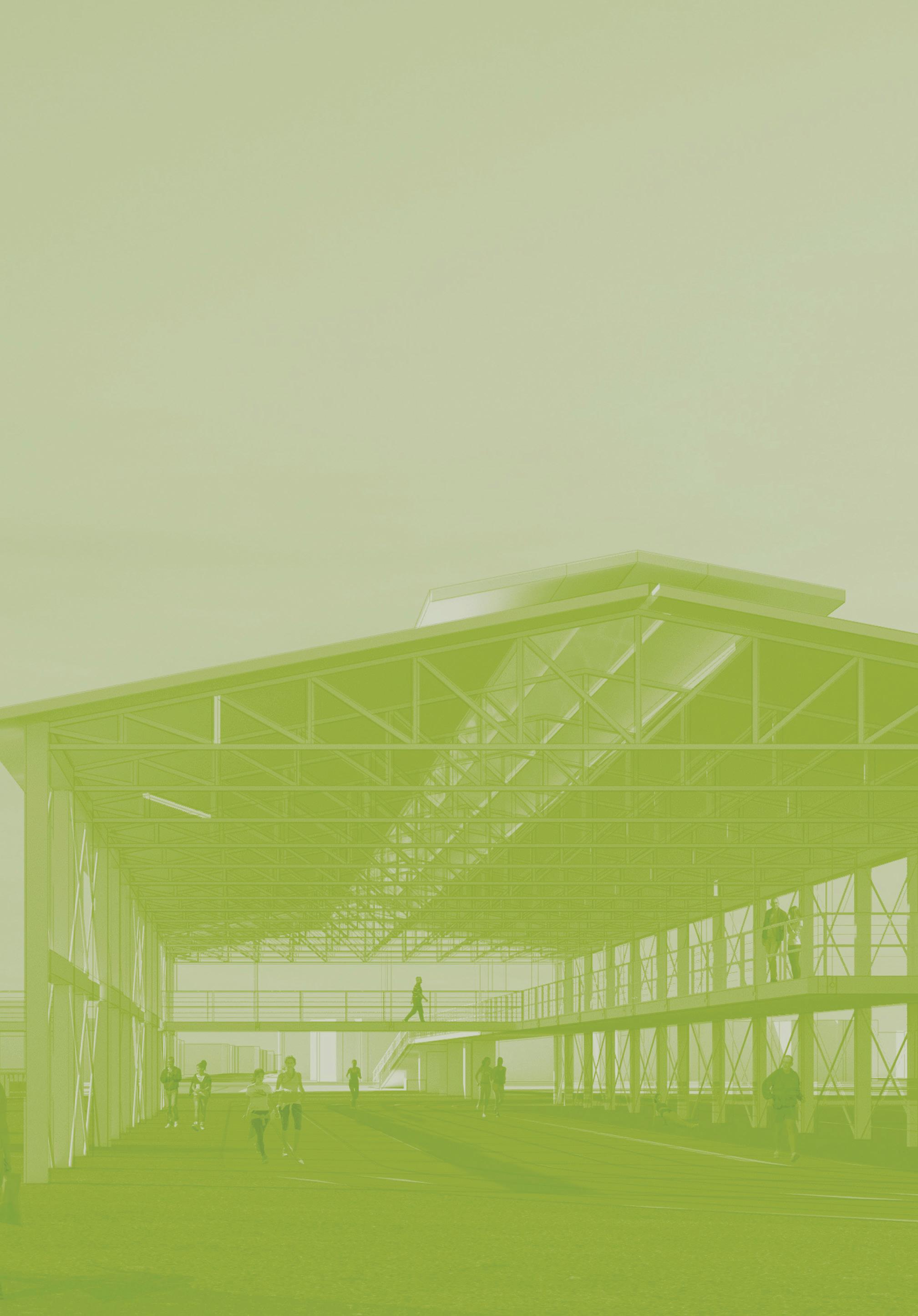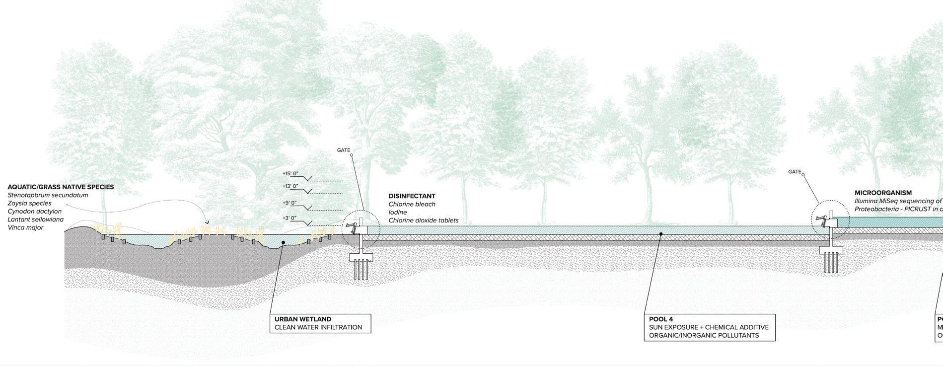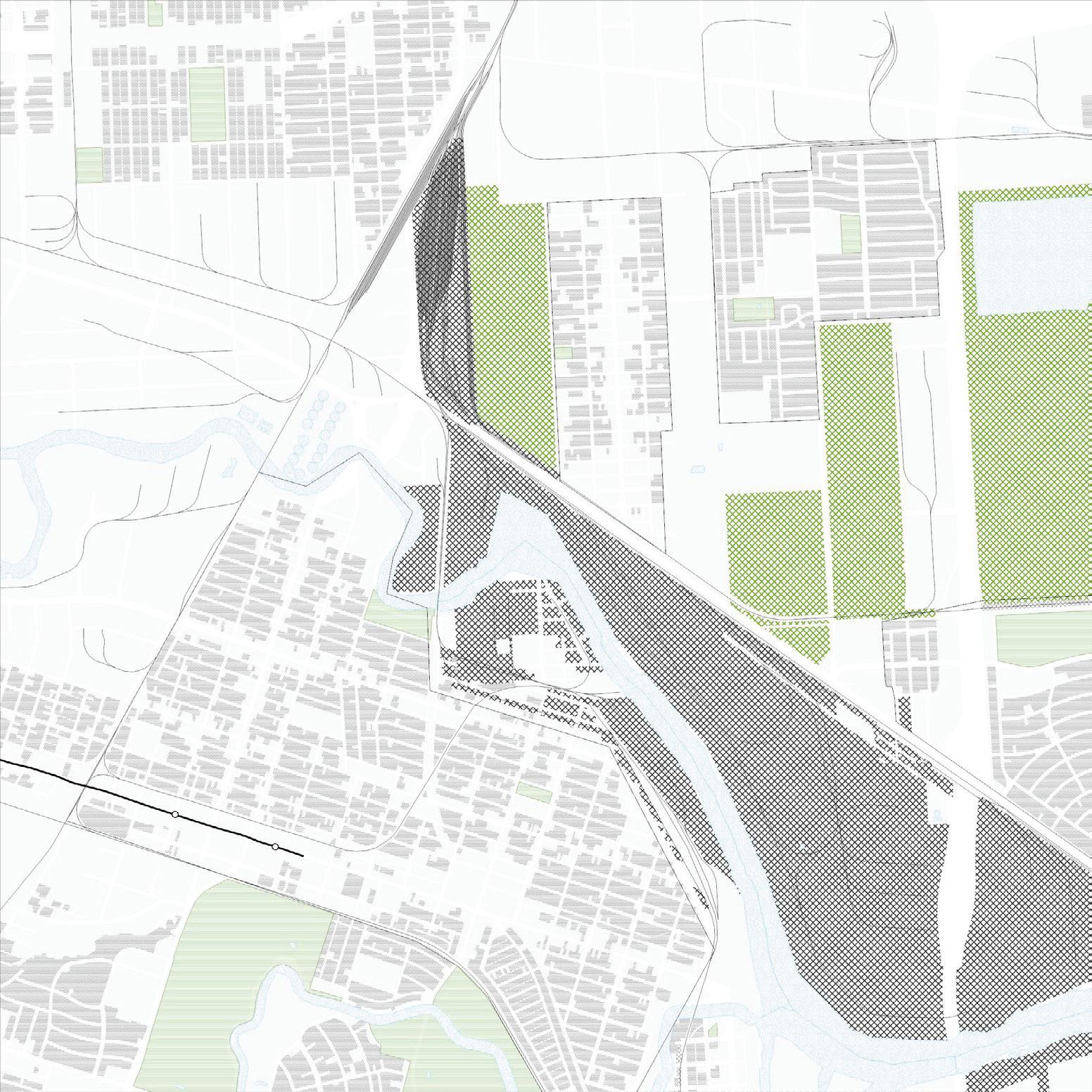 Waste flows from water treatment feed nutrients into community agriculture and the plant nursery, supporting remediation efforts further down the bayou. The park extends the building program outward, spanning school recreation, aquatic filtration gardens, and further remediation planting, helping to bridge the intervention with new development. Agricultural ribbons embed food sovereignty into the heart of the neighborhood. The project creates a direct link between citizens and the continually-evolving natural environment, seeding a culture shift through engagement with natural systems. The Green House aims to bring optimism and targeted investments that improve living conditions and provide opportunities for residents, both new and existing. Leveraging the remediation hub in the Fifth Ward, the bayou system is restored in phases to mitigate flooding, eliminate environmental contaminants (thereby allowing future development), and provide a connective park network.