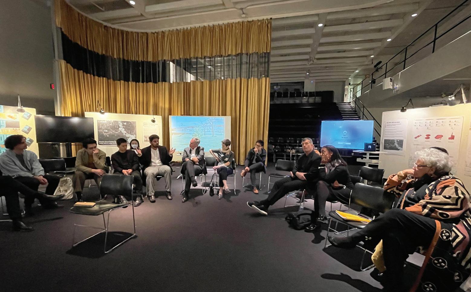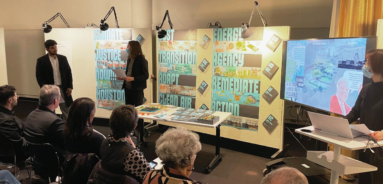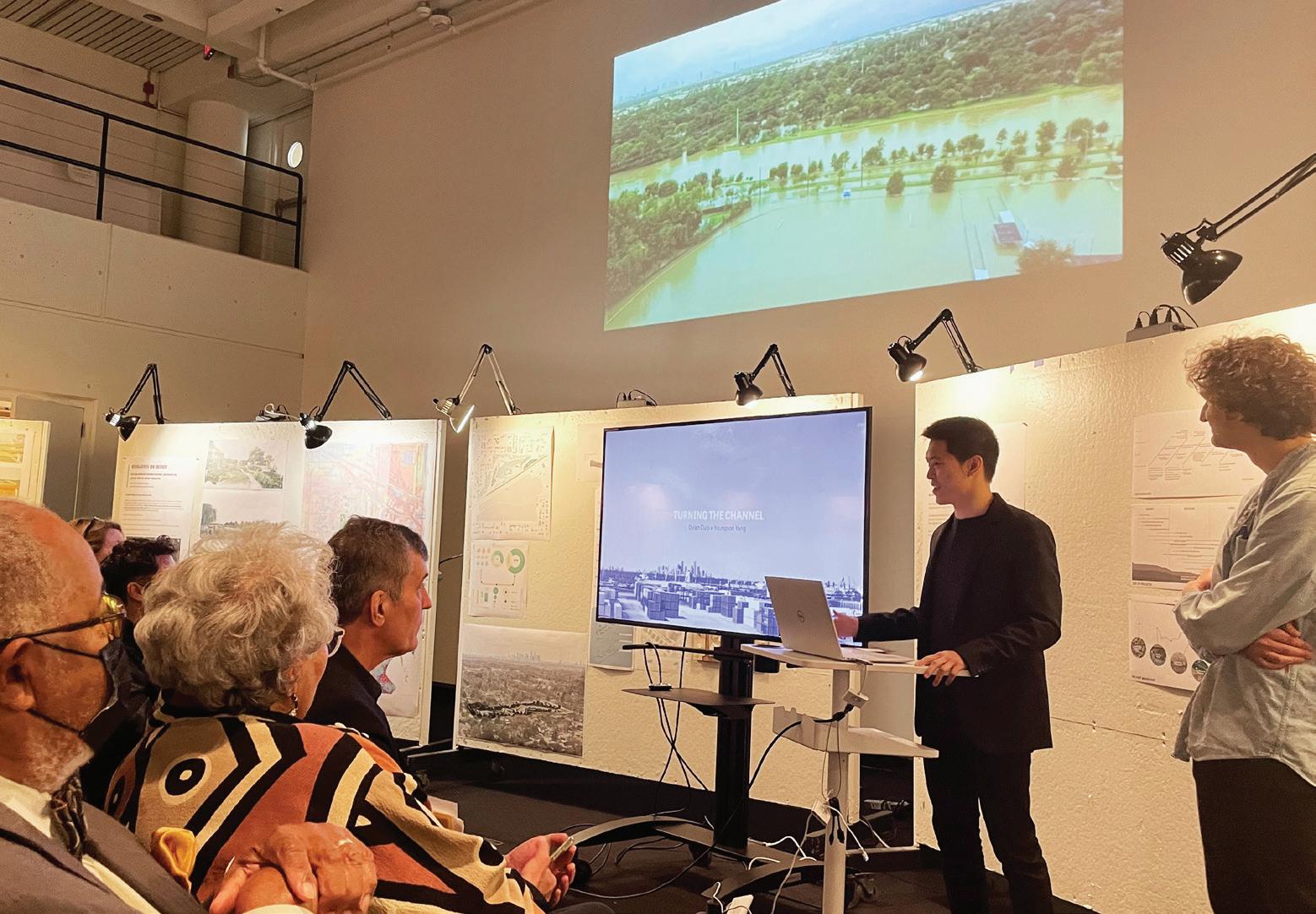 The midterm review, held at the Rice University School of Architecture in Houston, Texas on March 14, 2022, was used for local validation of, and feedback on, initial design concepts and findings. Students presented research findings, “What If?” exercises, and preliminary design concepts to an interdisciplinary range of local and visiting guest critics, including Amna Ansari, founder of Houston-based urban design practice Associates UltraBarrio; Janice Barnes, founding partner of Climate Adaptation Partners, a global expert in resilience and adaption planning; Sean Chiao, FAIA, Fellow at AECOM and former Global Business Line Chief Executive of AECOM Buildings and Places; Steven Duong, Principal and lead of the Urbanism and Planning (U+P) practice for AECOM’s West Region; Dalia Munenzon, Associate at One Architecture and Urbanism; Albert Pope, Gus Sessions Wortham Professor of Architecture at Rice University; and Margaret Wallace Brown, Director of the City of Houston’s Planning and Development Department.