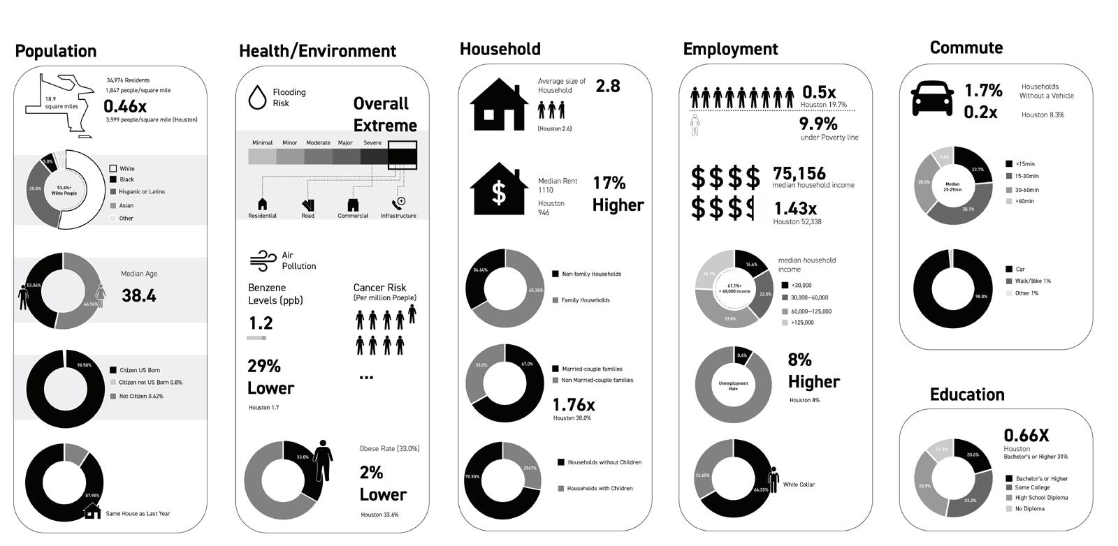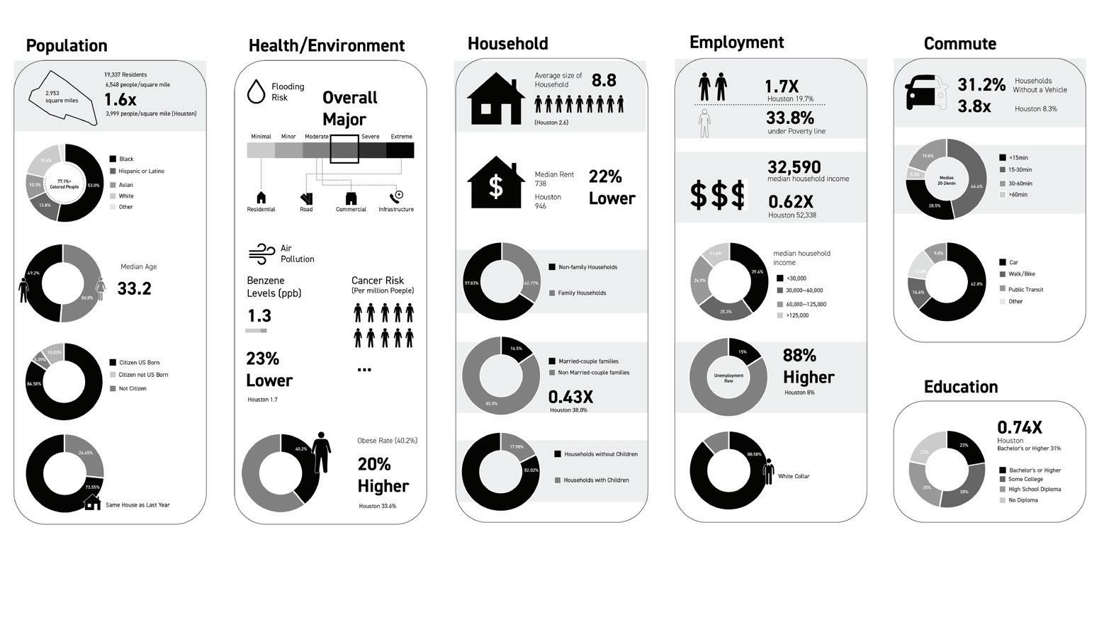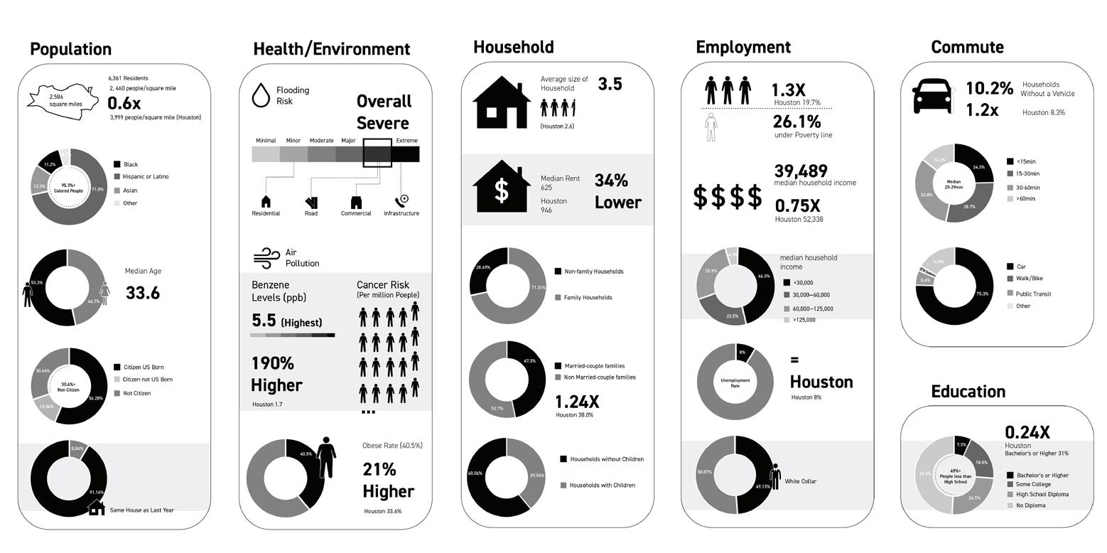 We would like to thank Sean Chiao and the AECOM Buildings and Places team for their generosity and support. Thank you to the Rice University School of Architecture and AECOM Houston for hosting us during our visits in February and March 2022. We would also like to thank Ms. Cleo Glenn Johnson-McLaughlin of the Black United Fund of Texas for welcoming us to Houston and her community.
