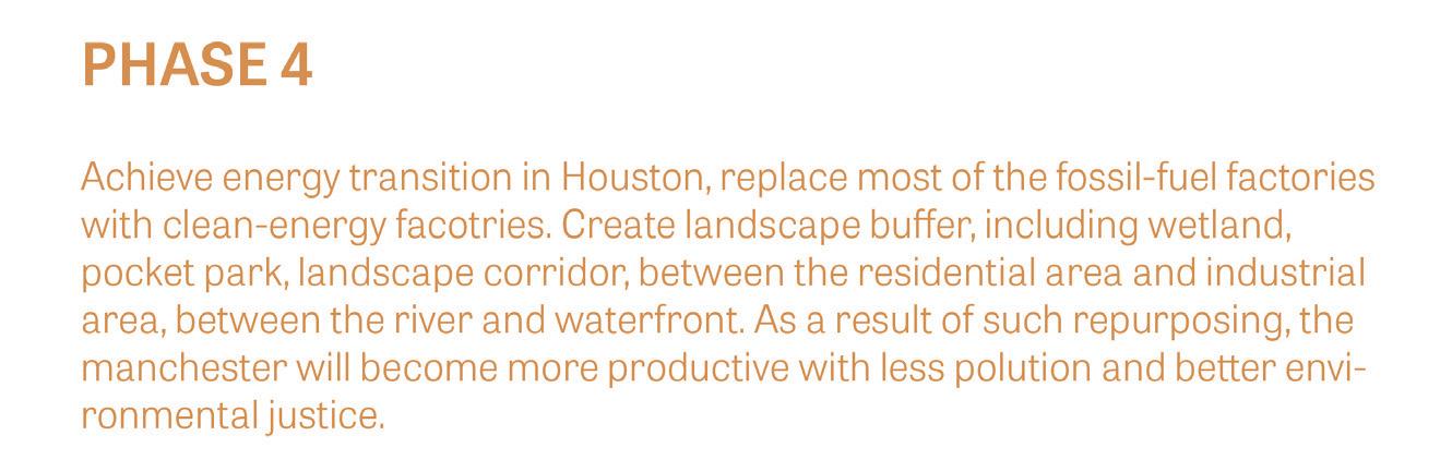 Houston is on the cusp of an important moment. For decades, much of Houston’s identity and material wealth have been based on petrochemical extraction. Simultaneously, climate-change-induced extreme weather and unchecked industrial growth leave neighborhoods on the brink of environmental disaster. Our project argues that the energy transition in Houston will only succeed if it changes the story Houston tells about itself to one of decarbonization and environmental justice. Four hybrid infrastructure interventions leverage energy systems intersections to catalyze neighborhood change. In the process, they build towards a decarbonized Ship Channel region with community equity at its core.