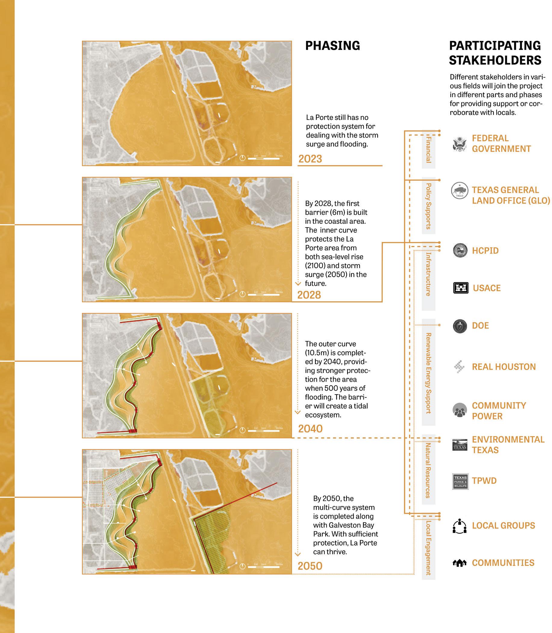 Finally, we move to La Porte, where the upstream transition culminates in a net carbon-negative manufacturing, logistics, and shipping hub that, through the processes of international trade, gives Houston’s local energy transition a global reach. The transition along the channel requires the consolidation of port facilities in areas that can accommodate wider lanes and larger ships (such as the waters around La Porte), where, in turn, more synergistic relationships can emerge. This new configuration allows the Port of Houston to become an accessible, public-facing, and ecologically-integrated port.