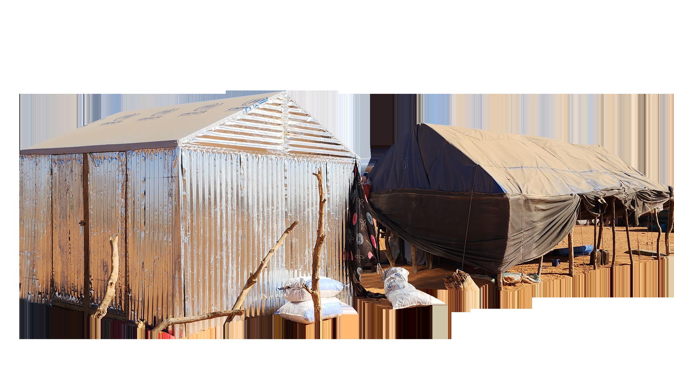 poly-cotton cavas providedby UNHCR combined and extended by the refugees using locally available or salvaged materials