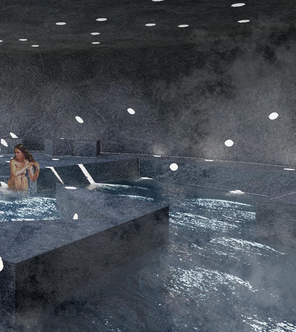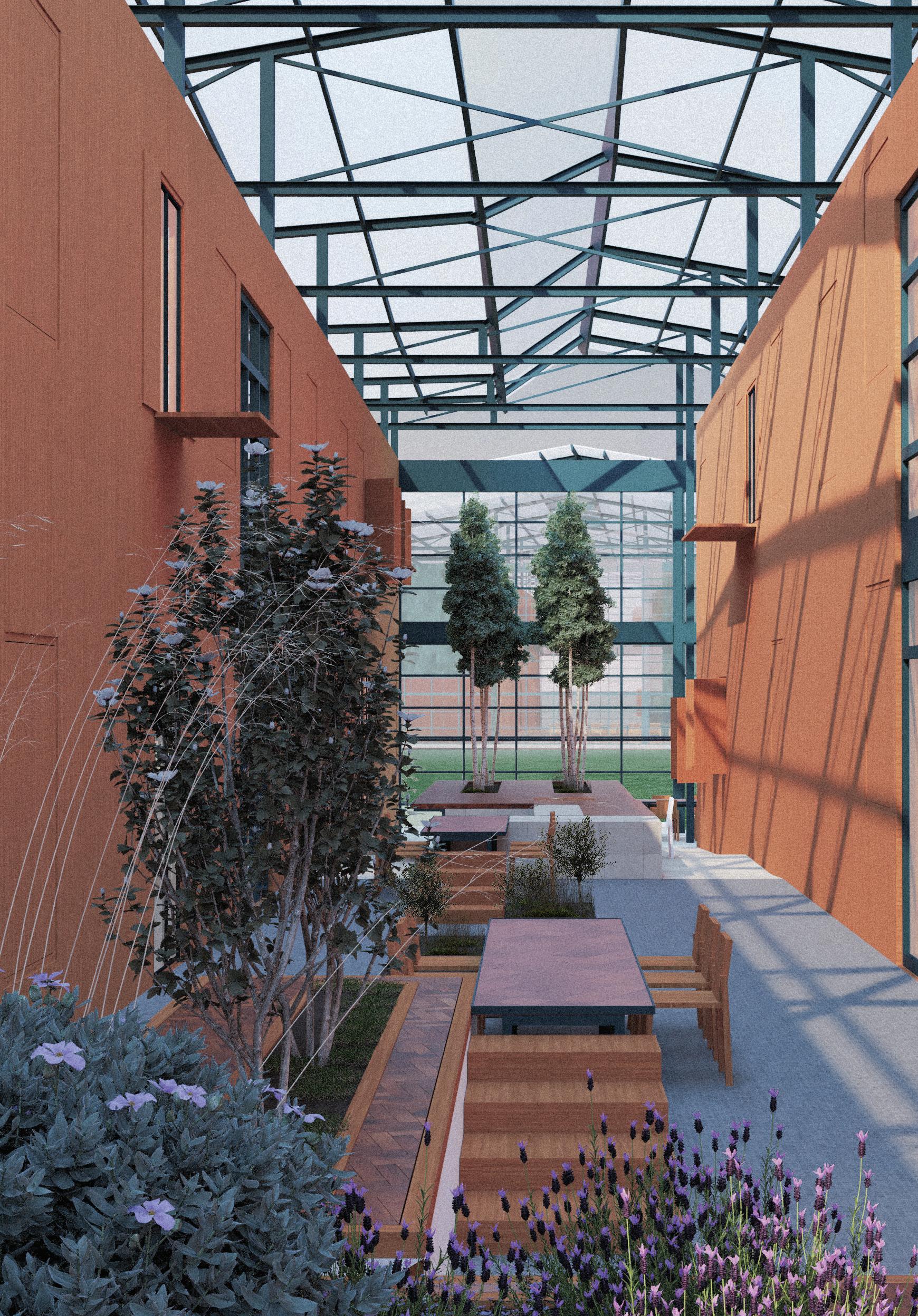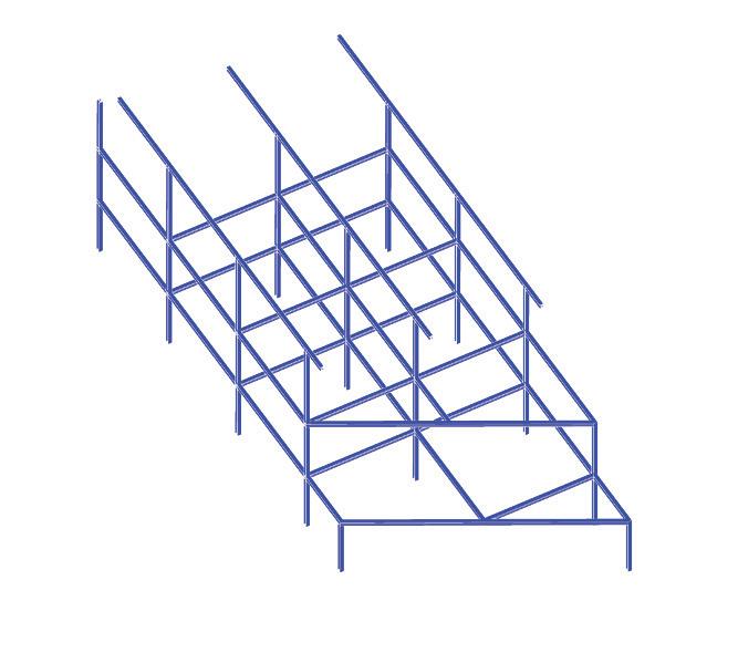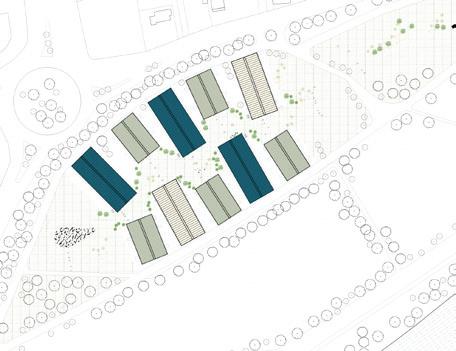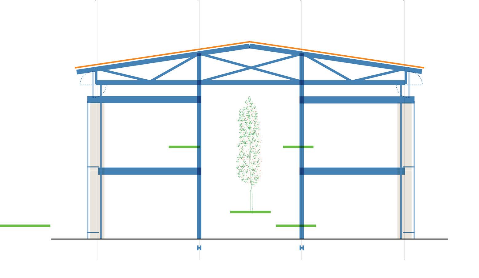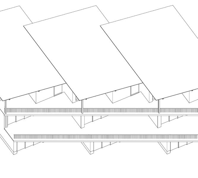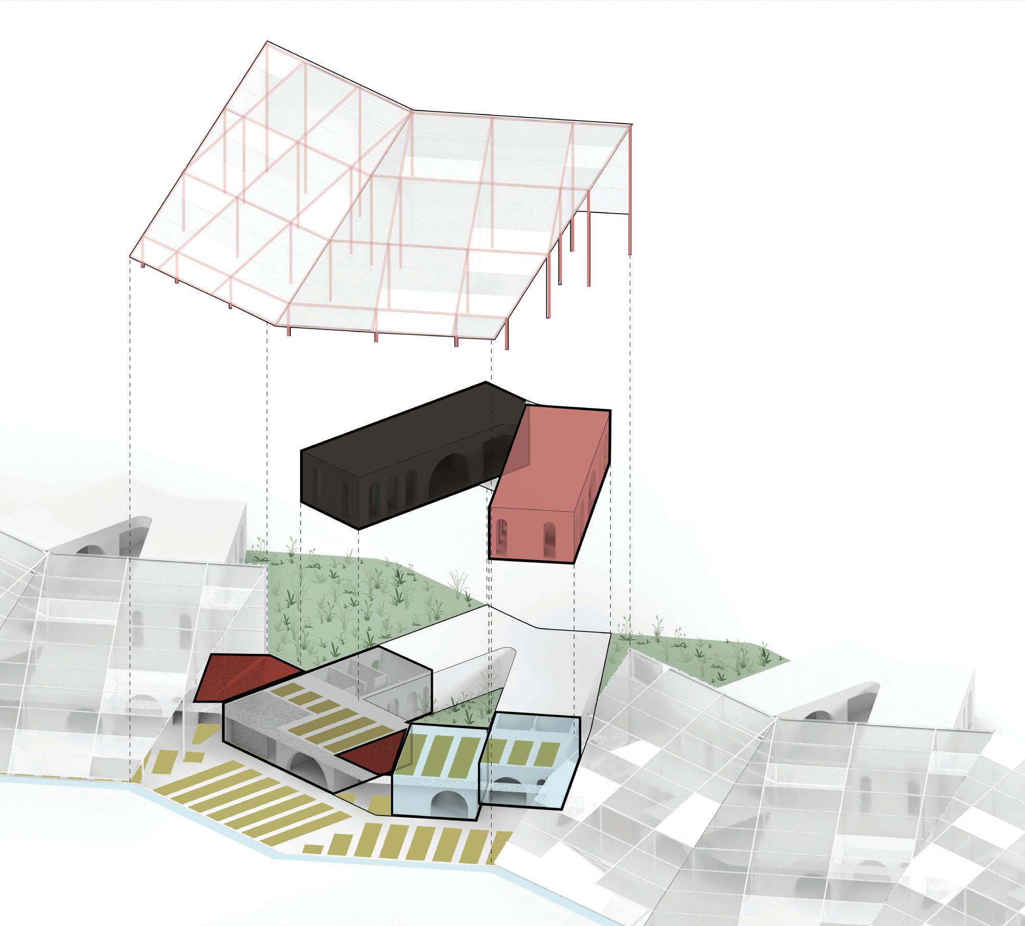 types that would interlock to make the spaces. Form, in the context of urban mining, would try to follow the availability of the structural steel frames. This strategy takes into account the fact that the steelwork came from a building designed by Gustave Eiffel for an exhibition center in Marseille and had already been moved to Arles after the Second World War, where it was abandoned and designated with the label of twentieth-century cultural heritage that could not be destroyed. Steel can be recycled and reused infinitely to produce virgin iron ore by smelting it down. This relies largely on fossilfuel-fired melting plants that consume large volumes of coal, emitting carbon in the process, and therefore is incompatible with zero-carbon targets. By taking a cradle-to-cradle approach, we explored the reuse of steel (currently an important material in the architectural field) in order to reduce the impact of mining ore on our planet.