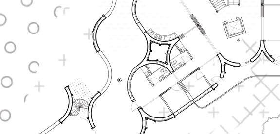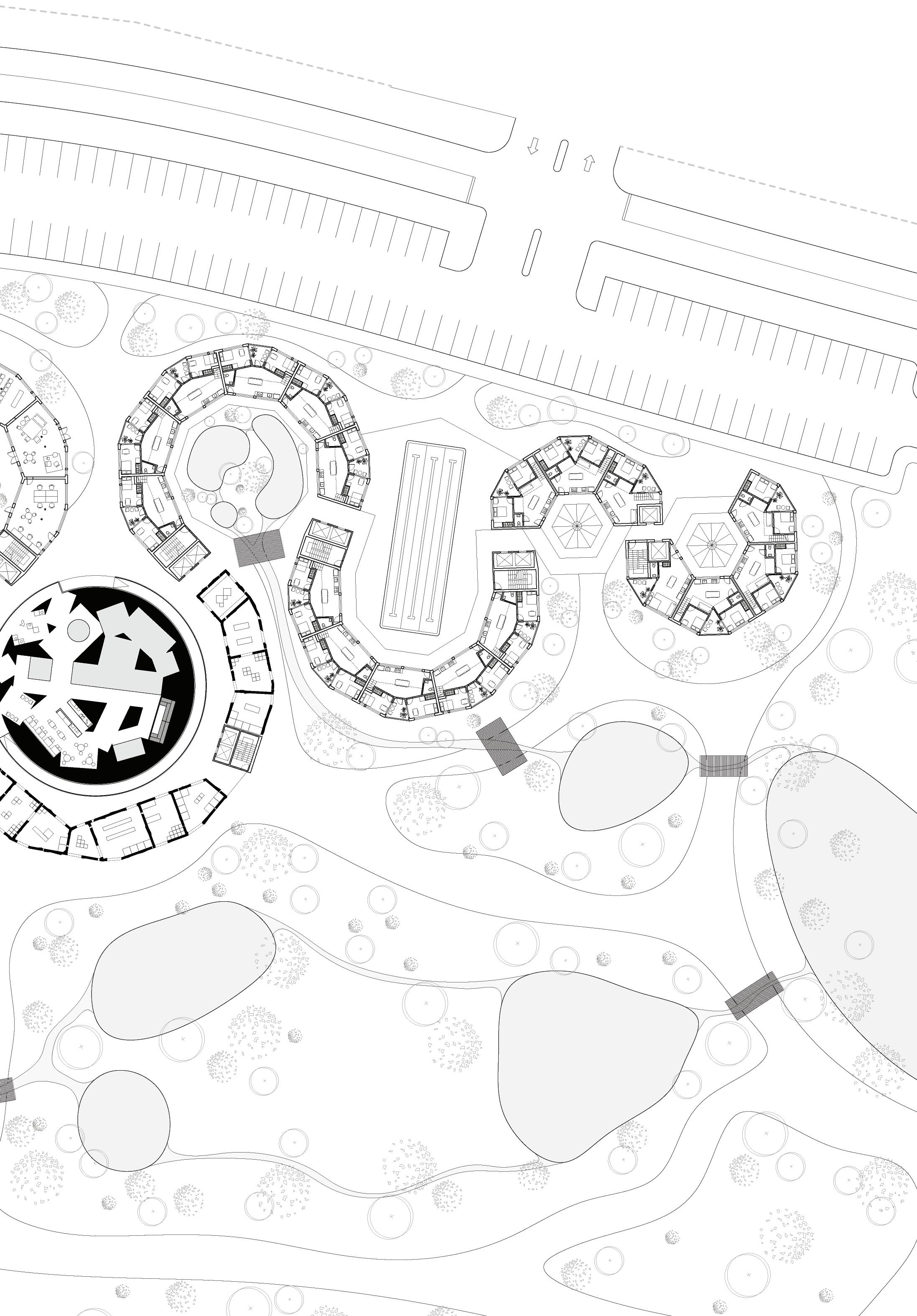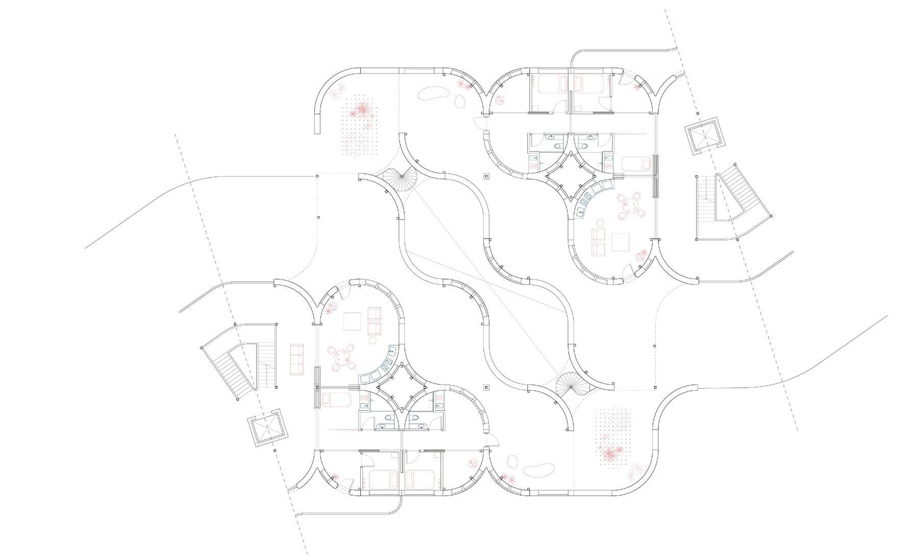 Above: To accommodate a range of visitors, the curved module differentiates shared functional spaces (bathroom, kitchen, etc.) from the private spaces of bedrooms or living rooms.