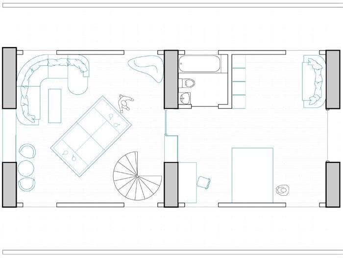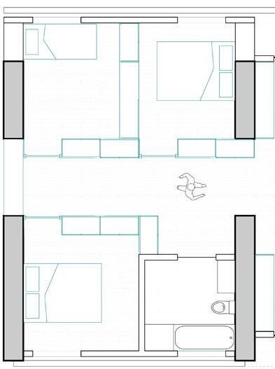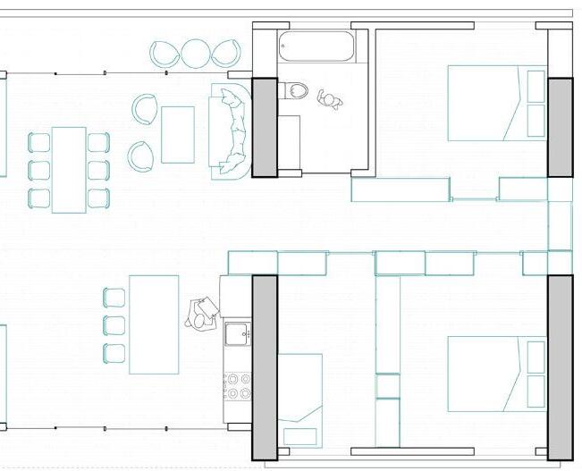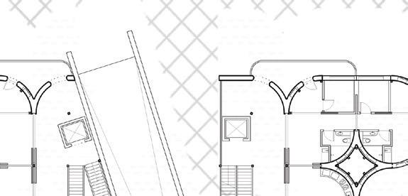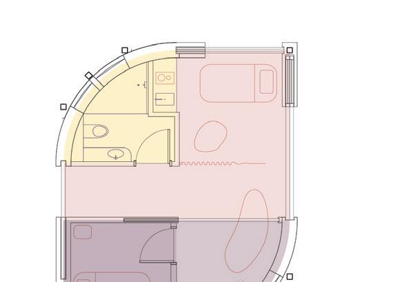 Below: Given the functionality of the curved module, the corners generate room configurations, offering potential as an open living space, a singular square bedroom, or a privacy buffer. Combined, these elements give rise to a flexible unit, with varying degrees of privacy.