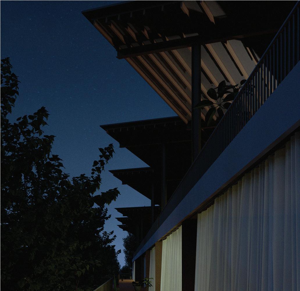 Rotated units create a variable balcony width that expands indoor living to outside. This can serve as a common outdoor space for collective meals. Curtains provide privacy and the option of using the balcony as an outdoor room.