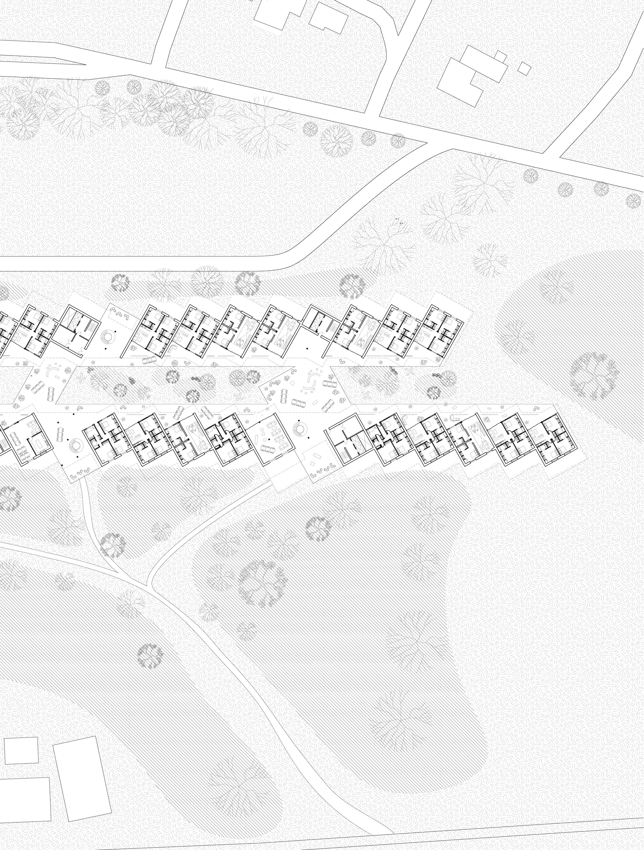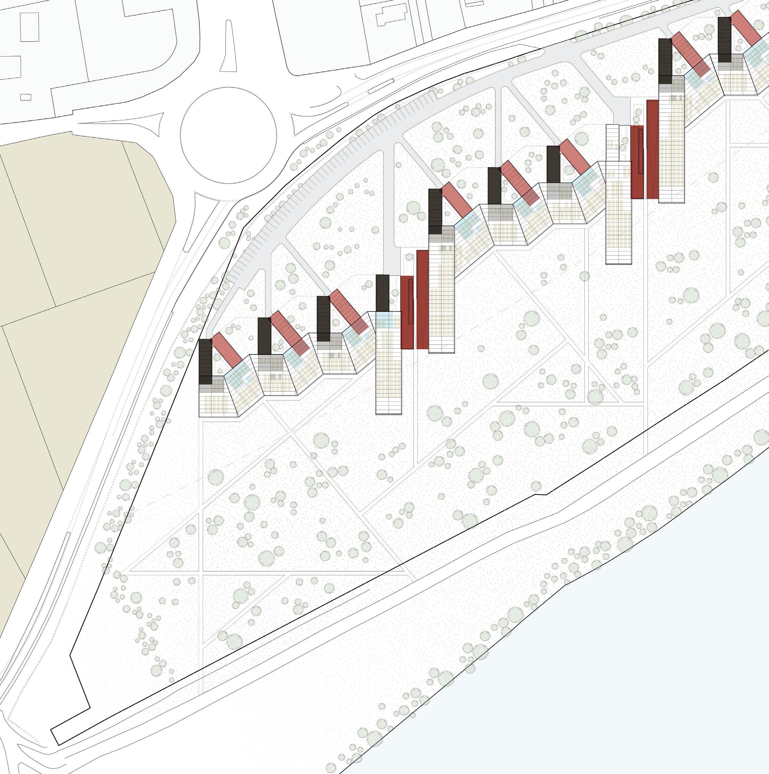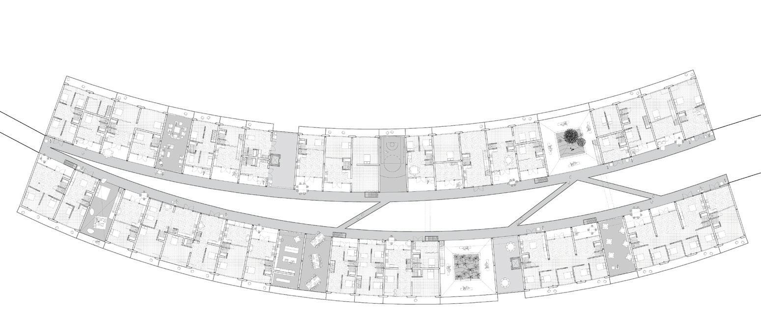 Second floor plan illustrating the relationship between the housing units, the shared spaces in the intersections, and the public plazas framed between the volumes.