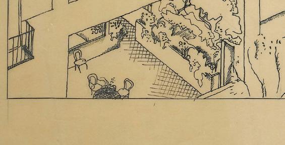 Perspective of a view across the housing complex. The shared balcony becomes more than a zone of circulation—it widens to become a programmable space that can be used nearly year-round in the Mediterranean climate of Arles, France.