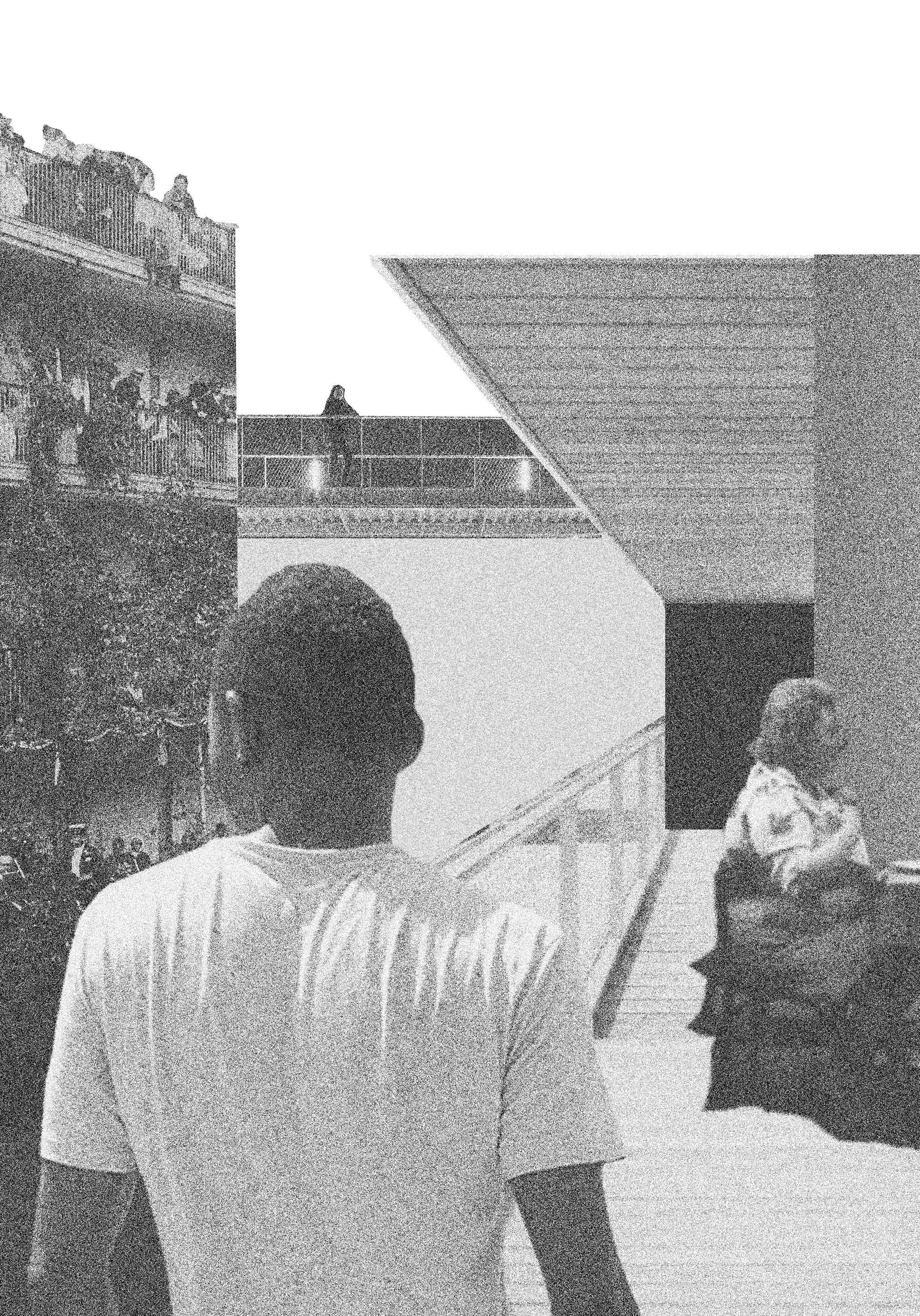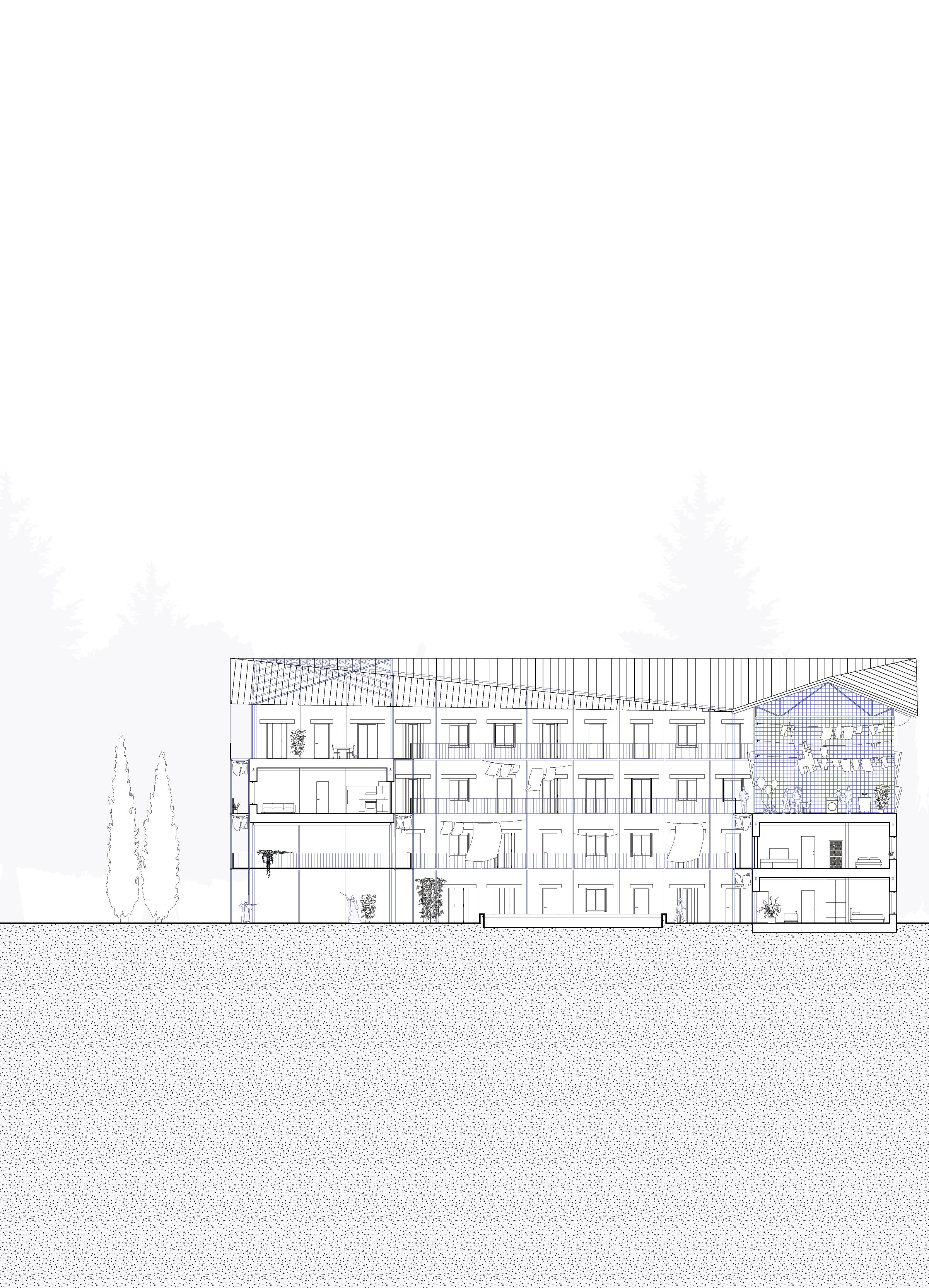 Located in Arles, France, this project sets out to house shortterm, medium-term, and long-term residents. Various unit types range in size and communal aspects, defining clusters of residents and what they share. Two long bars frame three stories of housing and two collective courtyards. The balcony blurs public and private space through the scalar technique of widening at select points to give residents an additional pocket of balcony space. The stepping of the building connects the balconies to the courtyards, reduces structural load, generates a variety of unit sizes, and lets light into lower units.