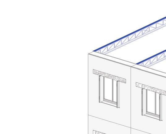 20 mm lime and clay render 2. Thermal CobBauge layer 3. Structural CobBauge layer Top of joist Steel to wood hanger Bottom of joist Recycled structural steel beam Internal clay plaster 9. Skirting 10. 25 x 75 mm floorboards 11. 18 mm plywood substrate 12. 325 mm joist 13. Expanded polystyrene insulationA 5 x 5m structural grid organizes the thick CobBauge walls, which define the exterior and unit partitions. A large overhanging roof helps mitigate water damage and reduces heat gain.