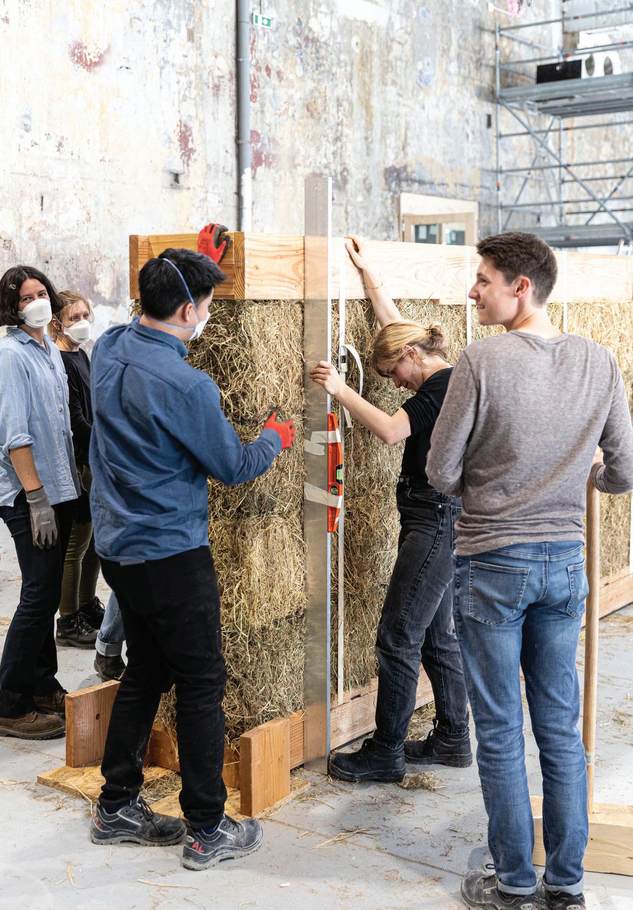 in these construction techniques. A range of experts and local craftspeople were gathered to deliver lectures around the use of each construction technique and teach one-day practical workshops on the principles of rammed earth, structural straw, stone, CobBauge, and fiber panel fabrication. There were specific trips organized to visit some of the locations where the materials originated. The purpose of this week, as the title suggests, was to introduce architecture students to the know-how of these
