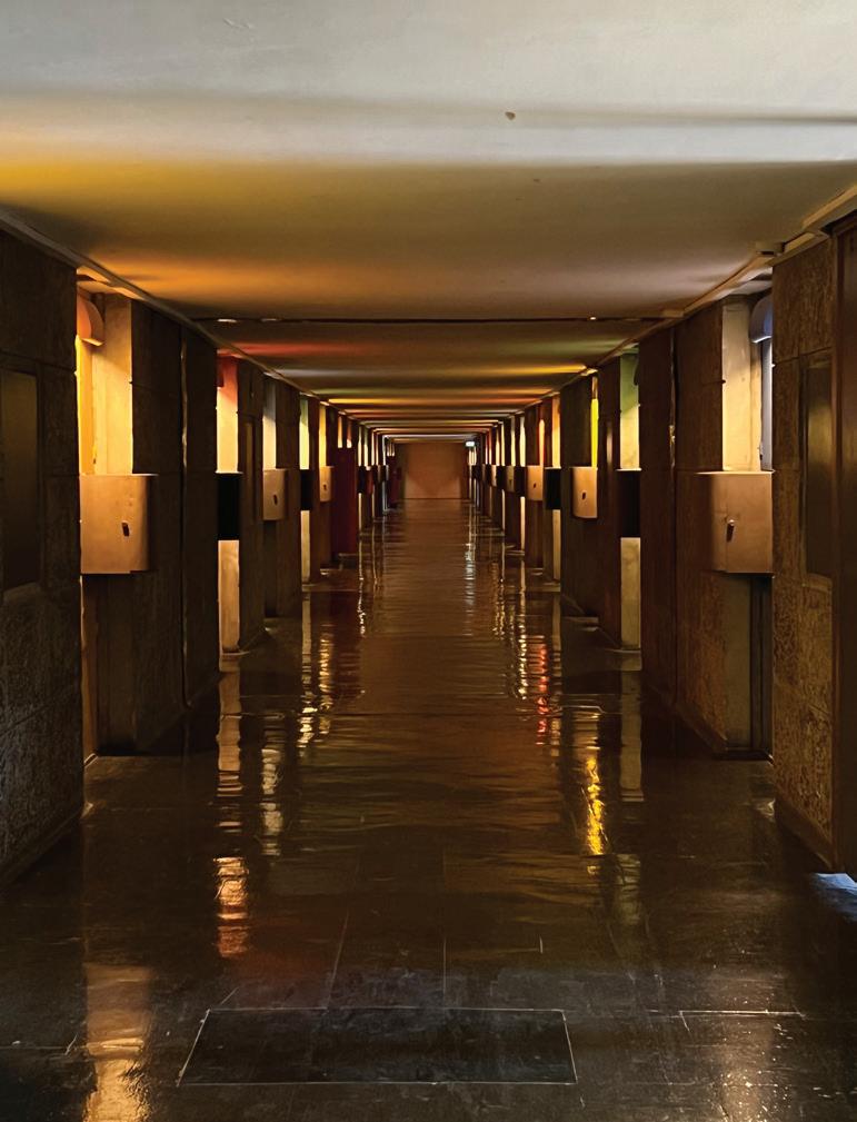 The expansive courtyard functions as a canyon, effectively mitigating direct sunlight during the daytime. The intervals between stacking apartments facilitate the gentle infiltration of daylight into this communal space.
