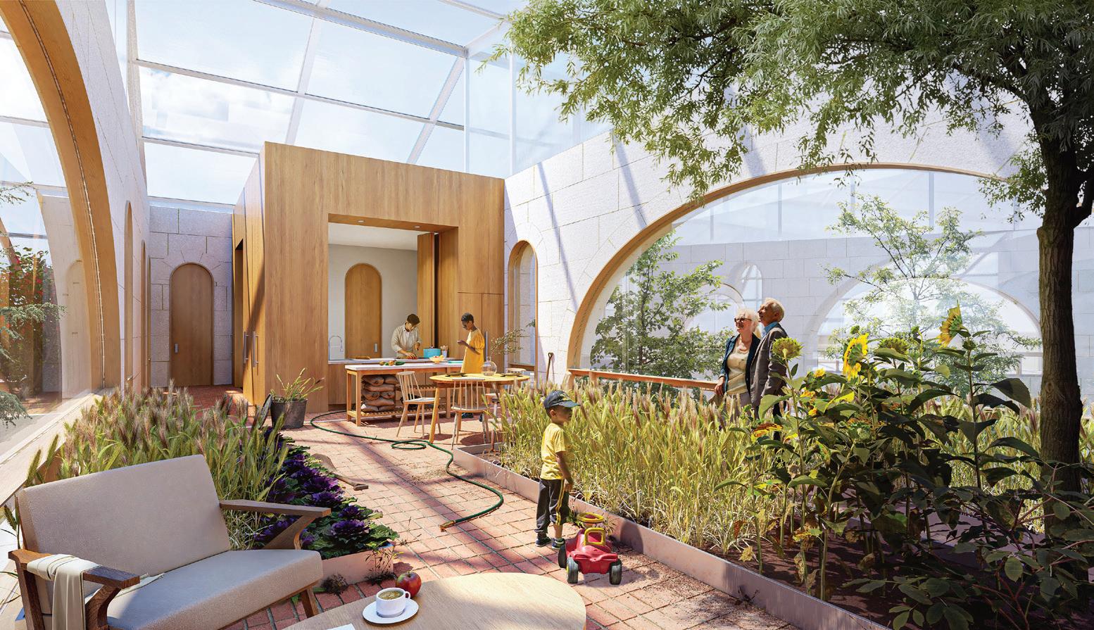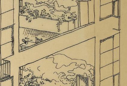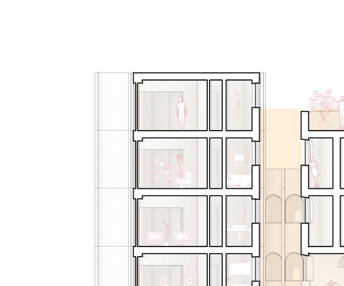 A stepped-back section reduces structural load and creates new relationships between the courtyards and balconies.