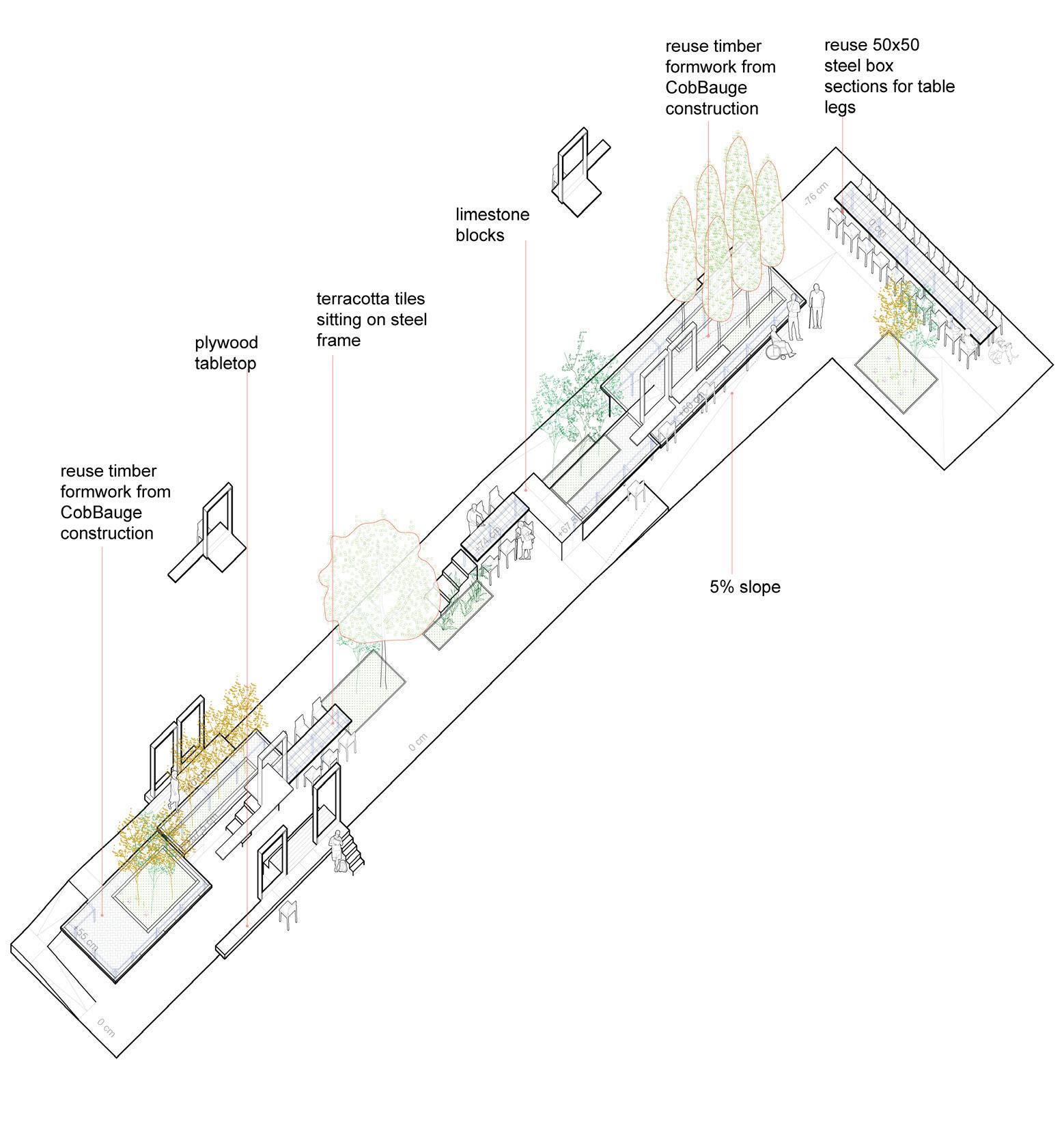 Site Sands, gravel, clay SiltThe proposed site currently holds a disassembled steel structure from a 1906 exhibition center by Gustave Eiffel. These parts are disassembled and reused for structural beams and columns in order to maintain a low embodied carbon footprint.