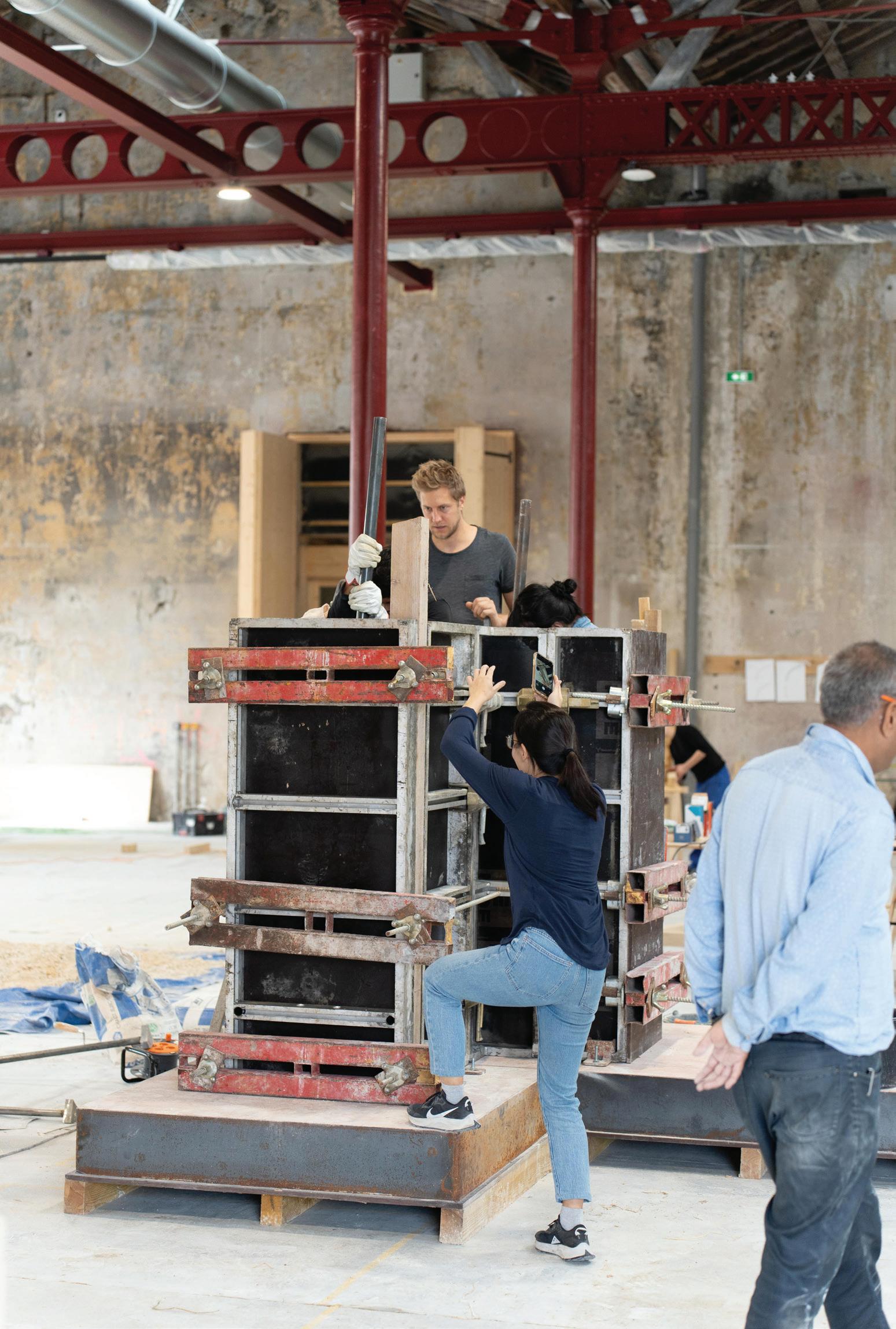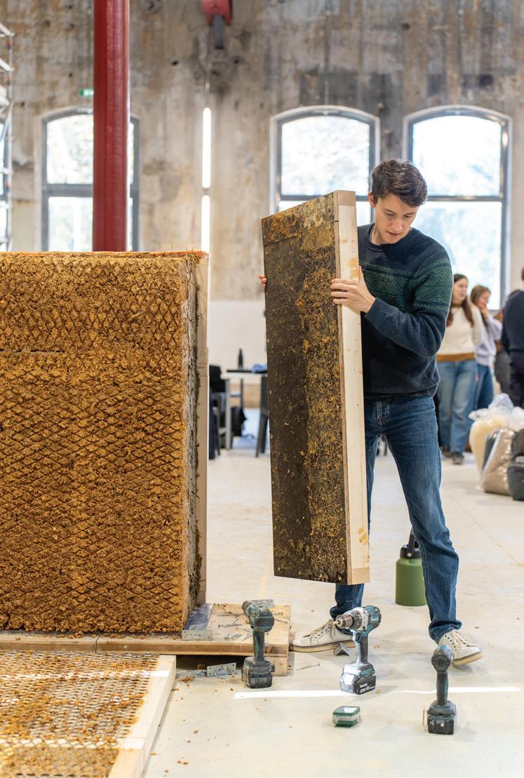 During the site research, we concluded that by building in the process of “indigenization” as core logic we would be able to liberate the agenda and unleash a hyper-local strategy as an exciting starting point in such a unique opportunity. First, we learned that France and Belgium have a well-developed supply chain based on the reuse of materials (they have legislation to align with sustainable development goals); this allows the birth of new specialist contracting companies, insurances, and policies to drive. Many European practitioners in the construction industry believe we should recirculate at least 50% of building elements by the early 2030s to make a difference. Secondly, we found approximately 100 tons of abandoned structural steelwork on site that could be given a new life: the end-of-life processes of abundant construction material over the last two centuries are fraught with uncertainty and need to be considered with whole-life carbon in a more holistic, climate-focused way. Thirdly, Atelier Luma has been conducting research on the use of natural materials in construction with a wellequipped workshop and laboratory over the past five years. Aligning these three pillars would lead us to an overarching theme of urban mining as a design strategy in studio research.