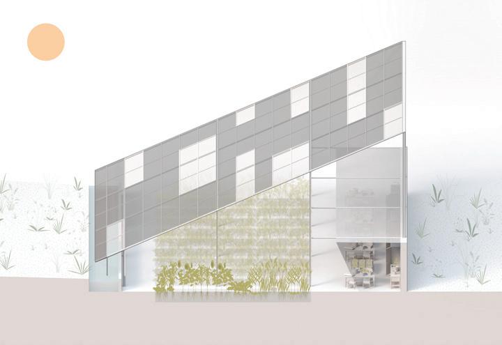 The facade consists of two layers, an operable stretched fabric facade on the exterior and an operable glass and brick facade behind. The fabric facade absorbs and reflects the sun’s heat while allowing the building to breath and ventilate.