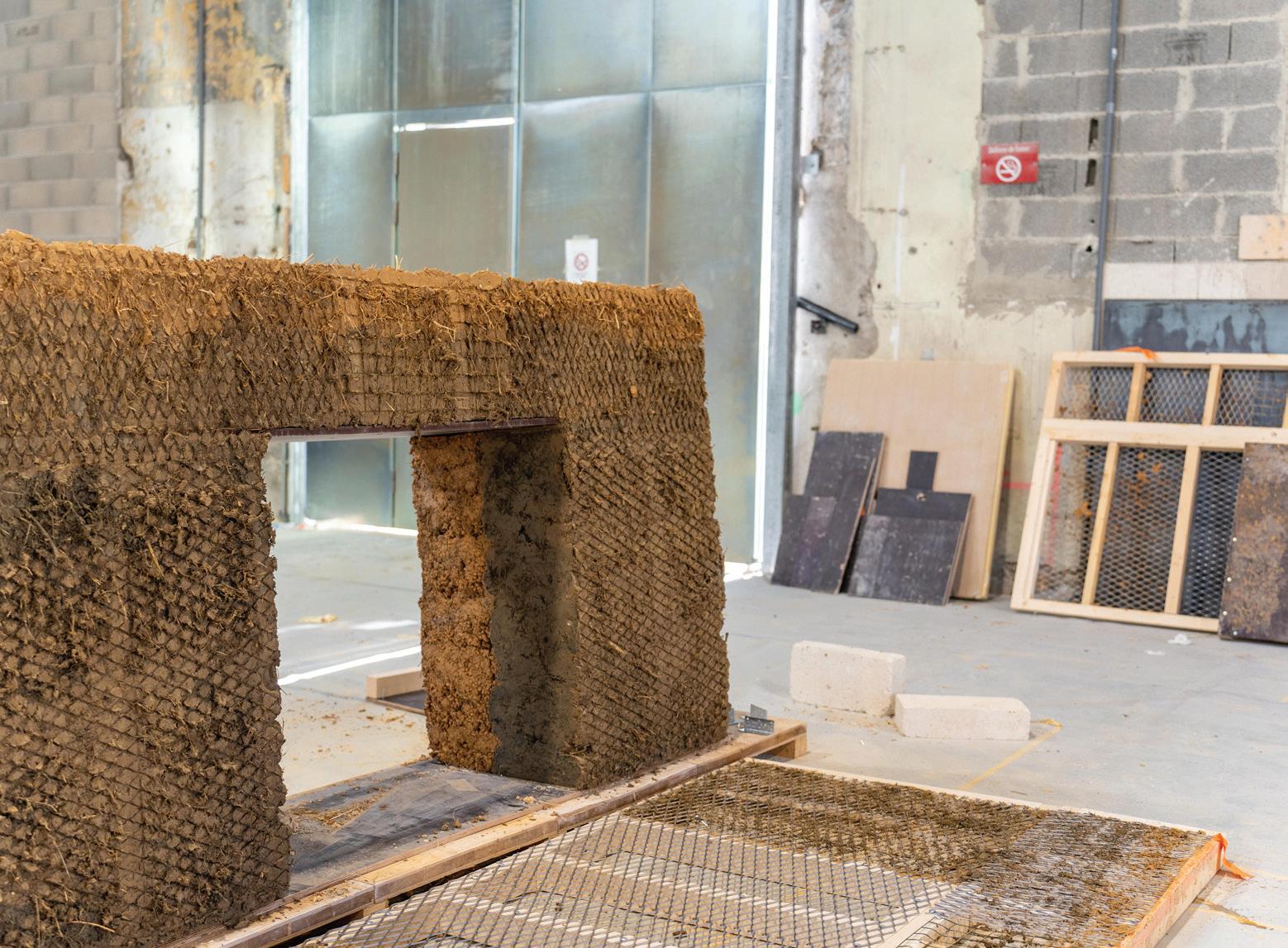 1. Students and instructors cutting stone, Arles, France, September 2022. ©Austin Sun. 2. Stone arch carved during the stone practical workshop, Arles, France, September 2022. ©Austin Sun. Stone carving in progress, Arles, France, September 2022. ©Adrian Deweerdt. Courtesy of Atelier LUMA.CobBauge consists of subsoil, fibers, and water. It builds on the traditional building material of cob by adding a thermal layer to the structural layer.