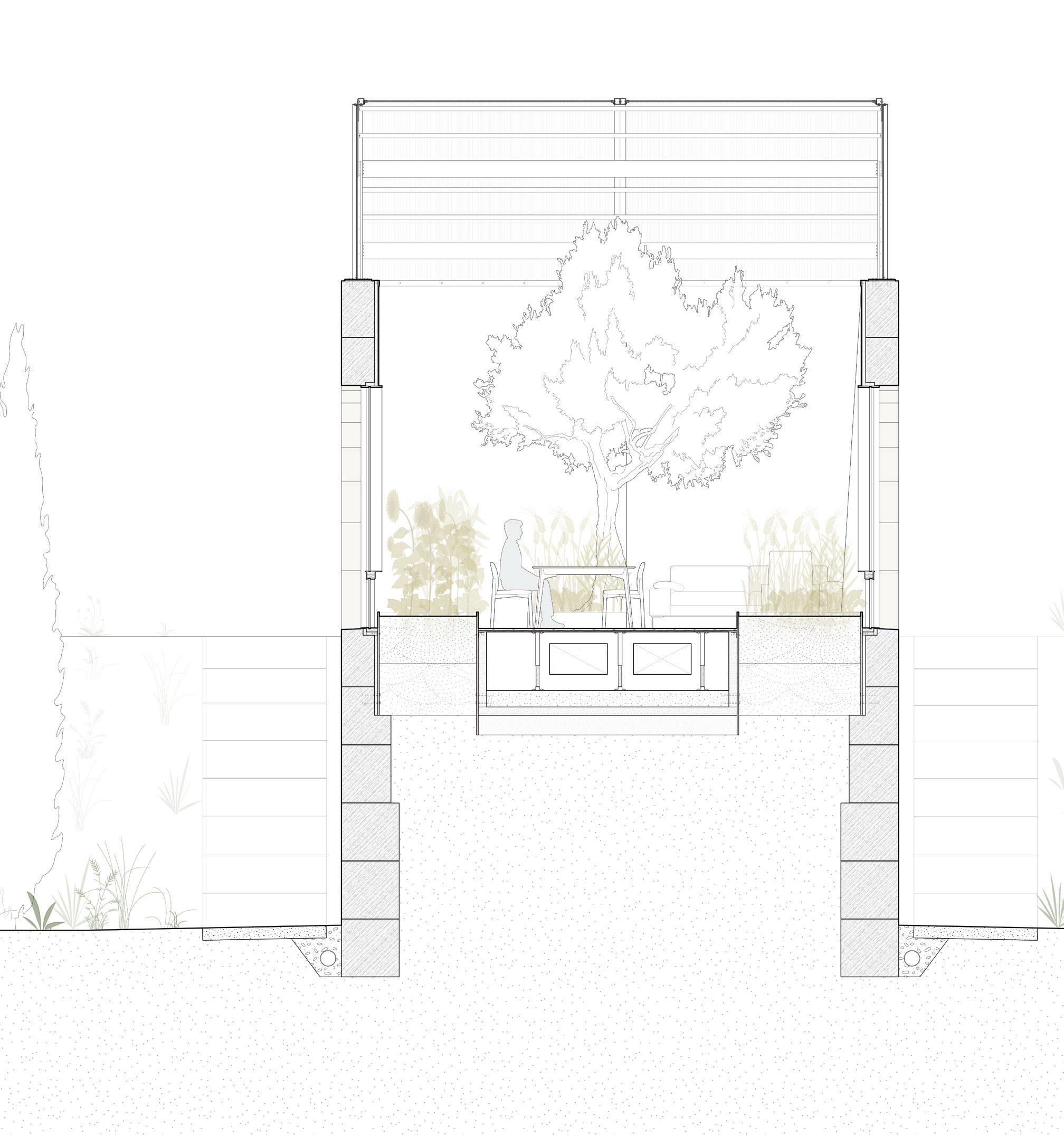 The site used for the proposals is former industrial land along the Rhone river, close to the city center, and located at the tip of the Camargue Natural Park; therefore, it benefitted from a wide view of the river as well as the city center. A steel structure designed by Gustave Eiffel in 1906 for an exhibition center in Marseille is currently being stored on the site. The structure has been cladded in three different ways over time, and after the Second World War, it was moved to Arles and used as a warehouse before falling into oblivion. It is now a listed structure, waiting to be reused. To complement the space and energy-saving measures developed through co-living arrangements, the students were asked to reuse the steel structure as the load-bearing elements of their projects, as its near-zero carbon emis-