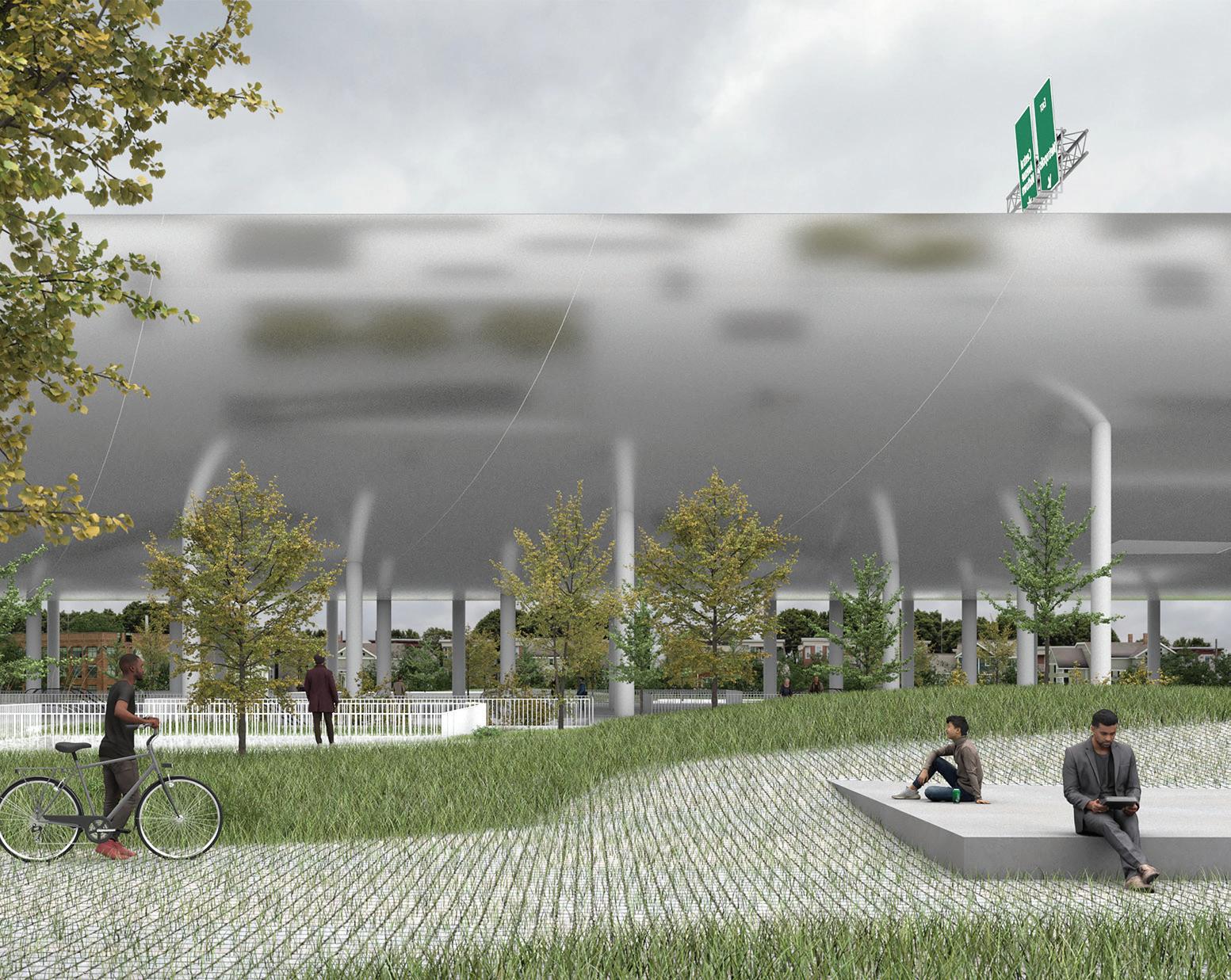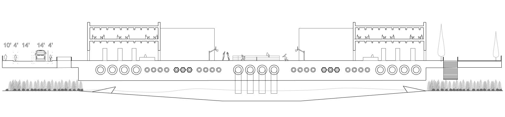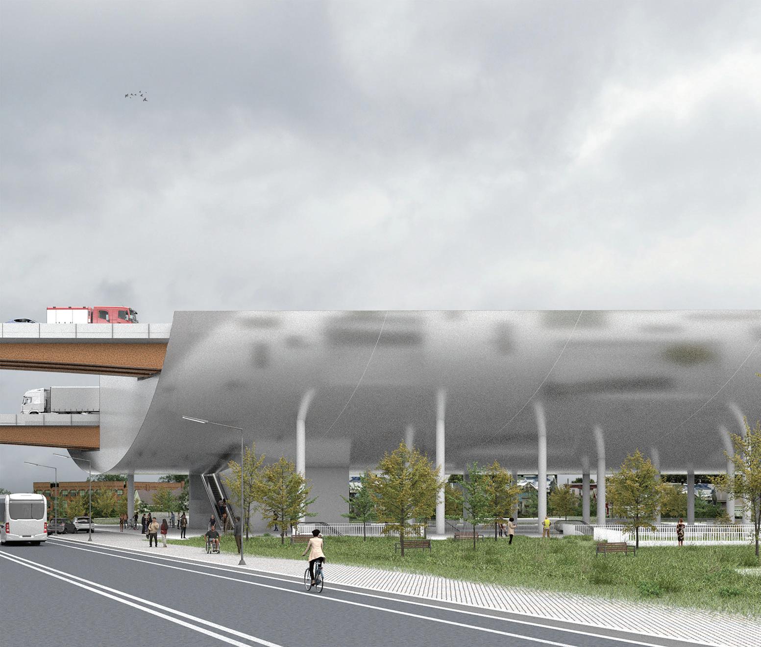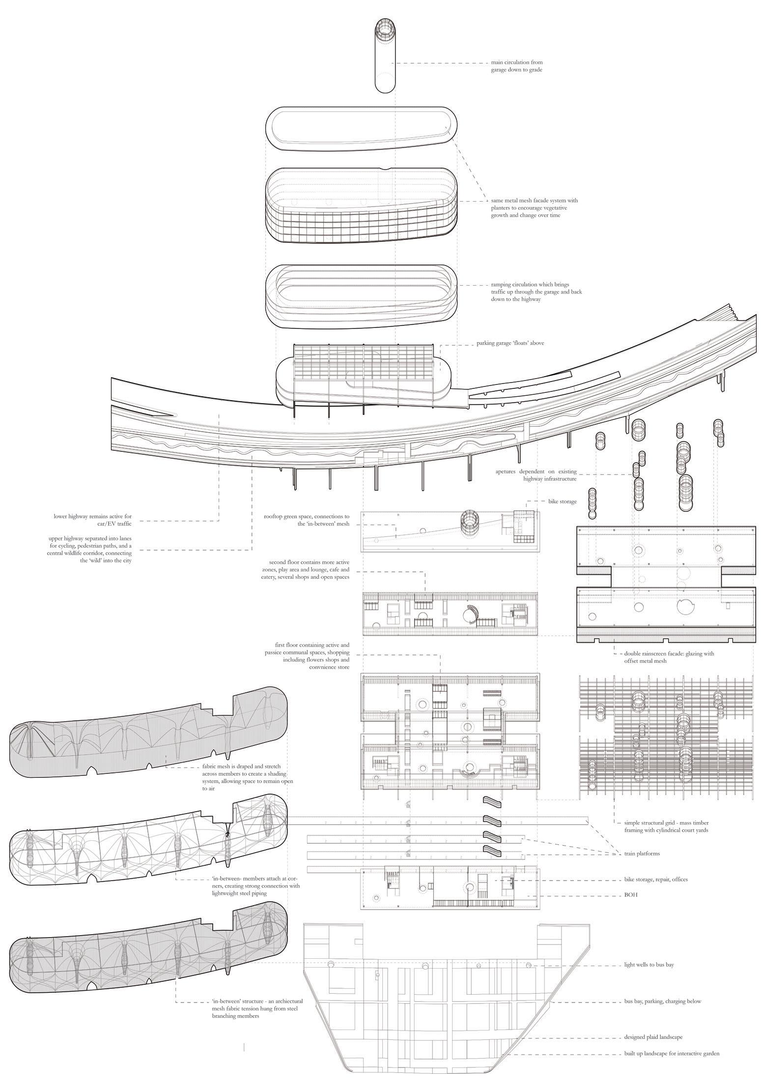 A multi-level mobility hub settles between exiting infrastructure, bridging previously disparate urban spaces, elevations, and opportunities for inter-species growth and transformation. The multi-layered and porous building envelope carefully calibrates habitats for animals and plants as well as human occupation.