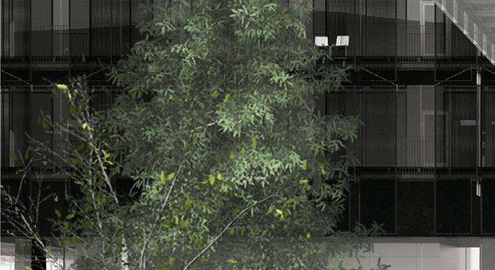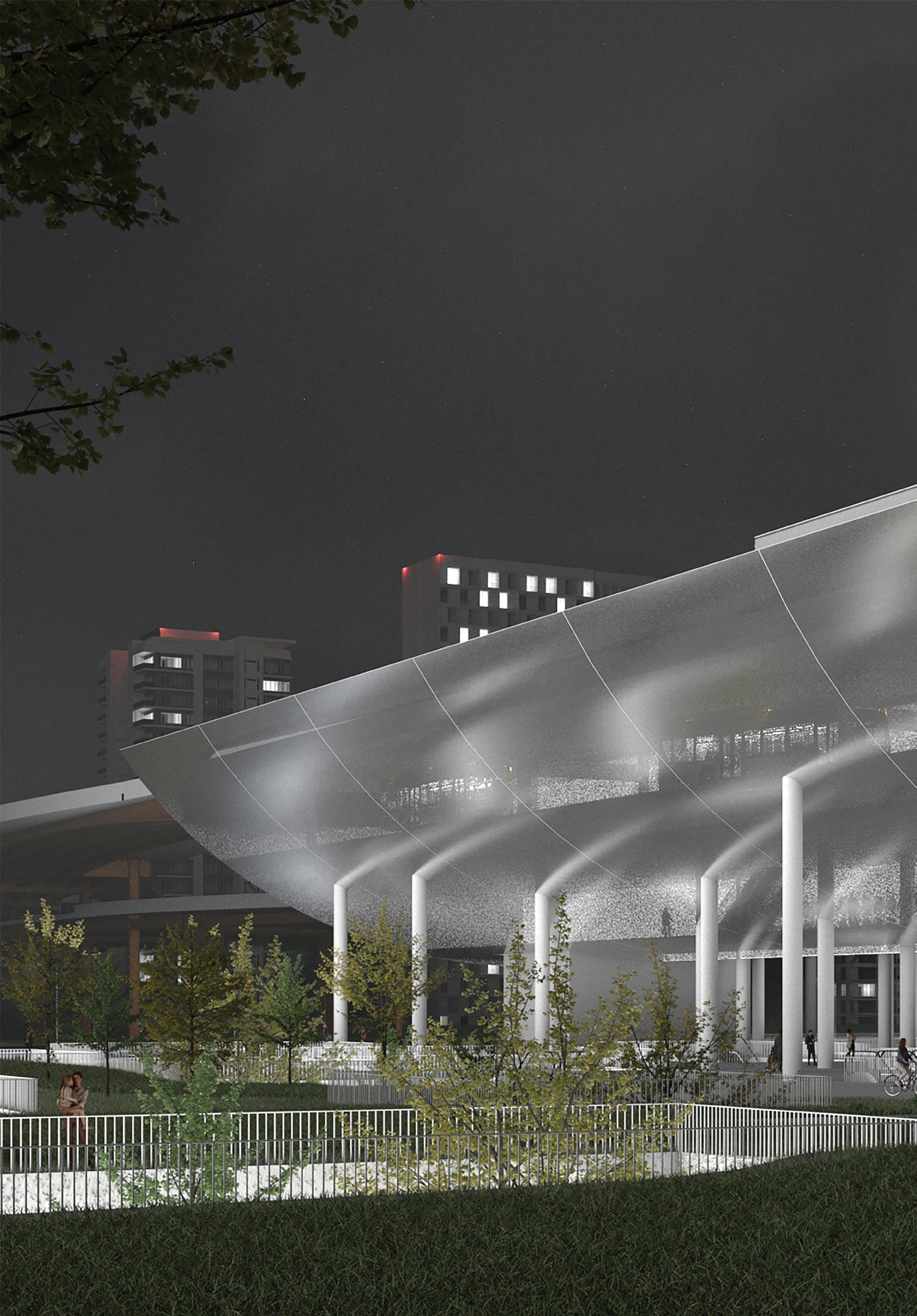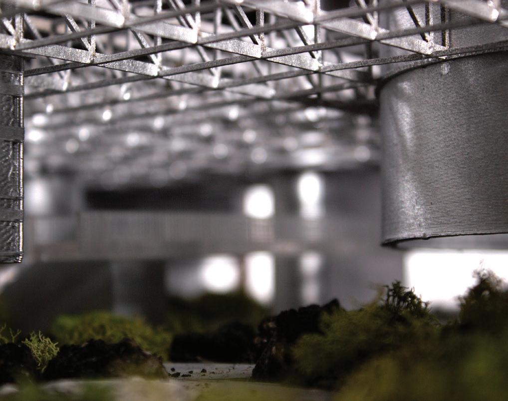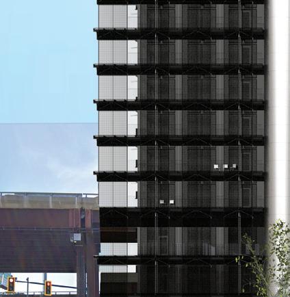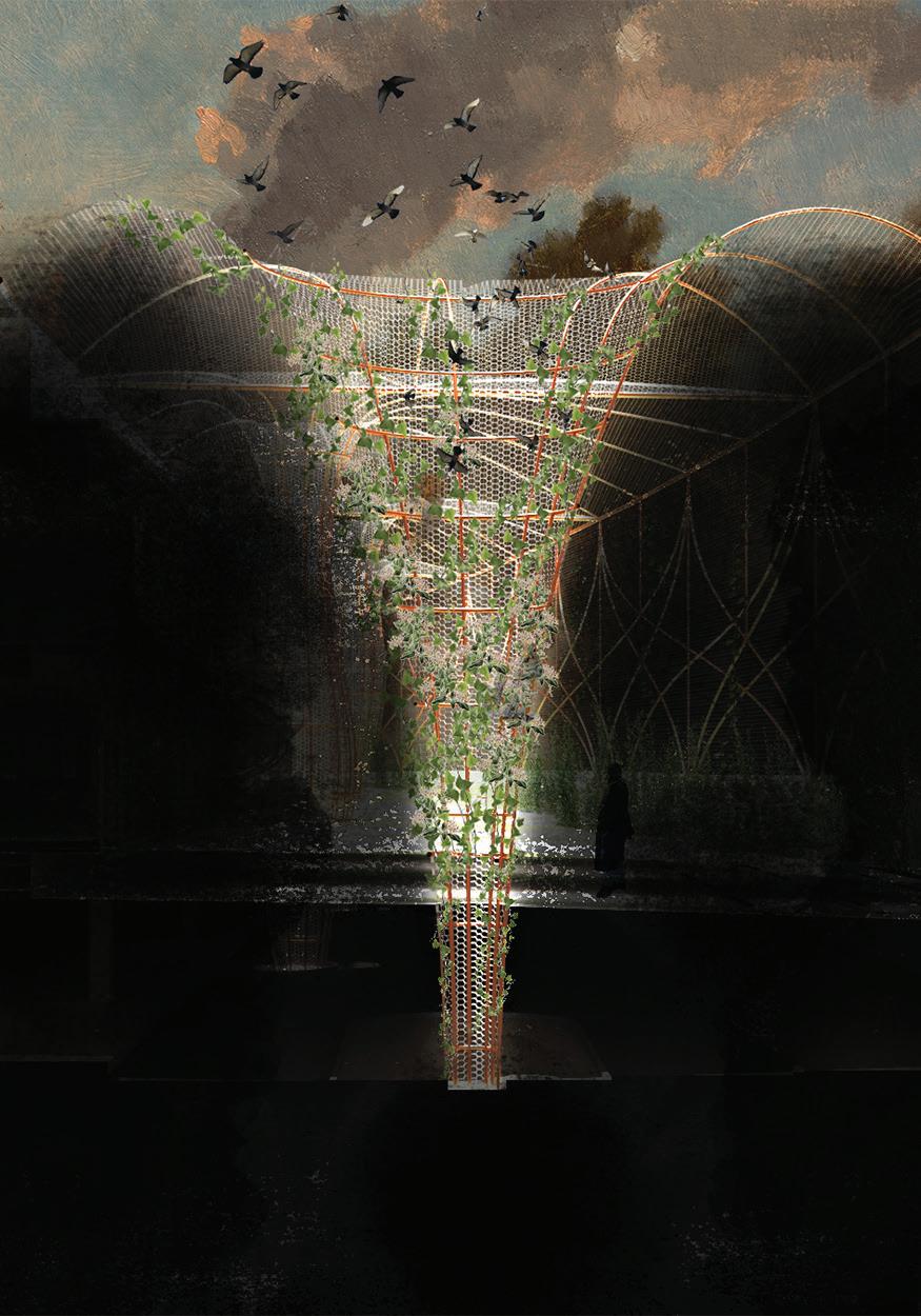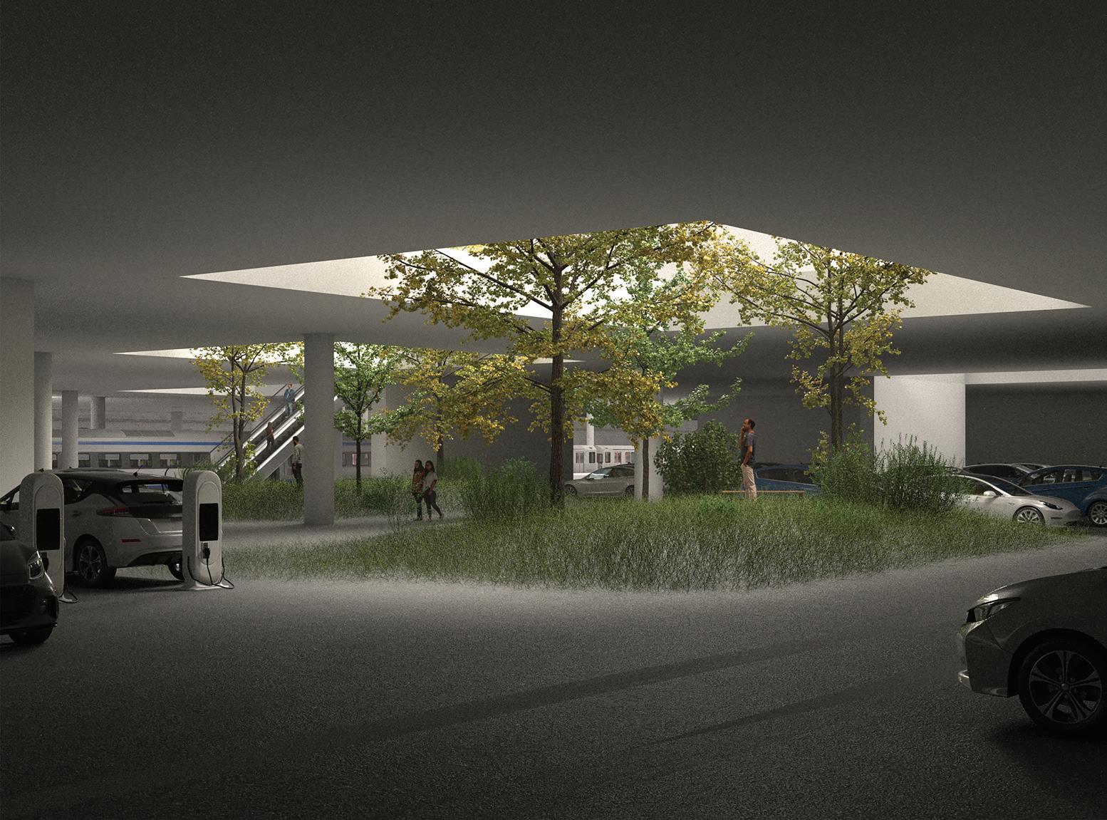 A multi-level mobility hub settles between exiting infrastructure, bridging previously disparate urban spaces, elevations, and opportunities for inter-species growth and transformation. The multi-layered and porous building envelope carefully calibrates habitats for animals and plants as well as human occupation.