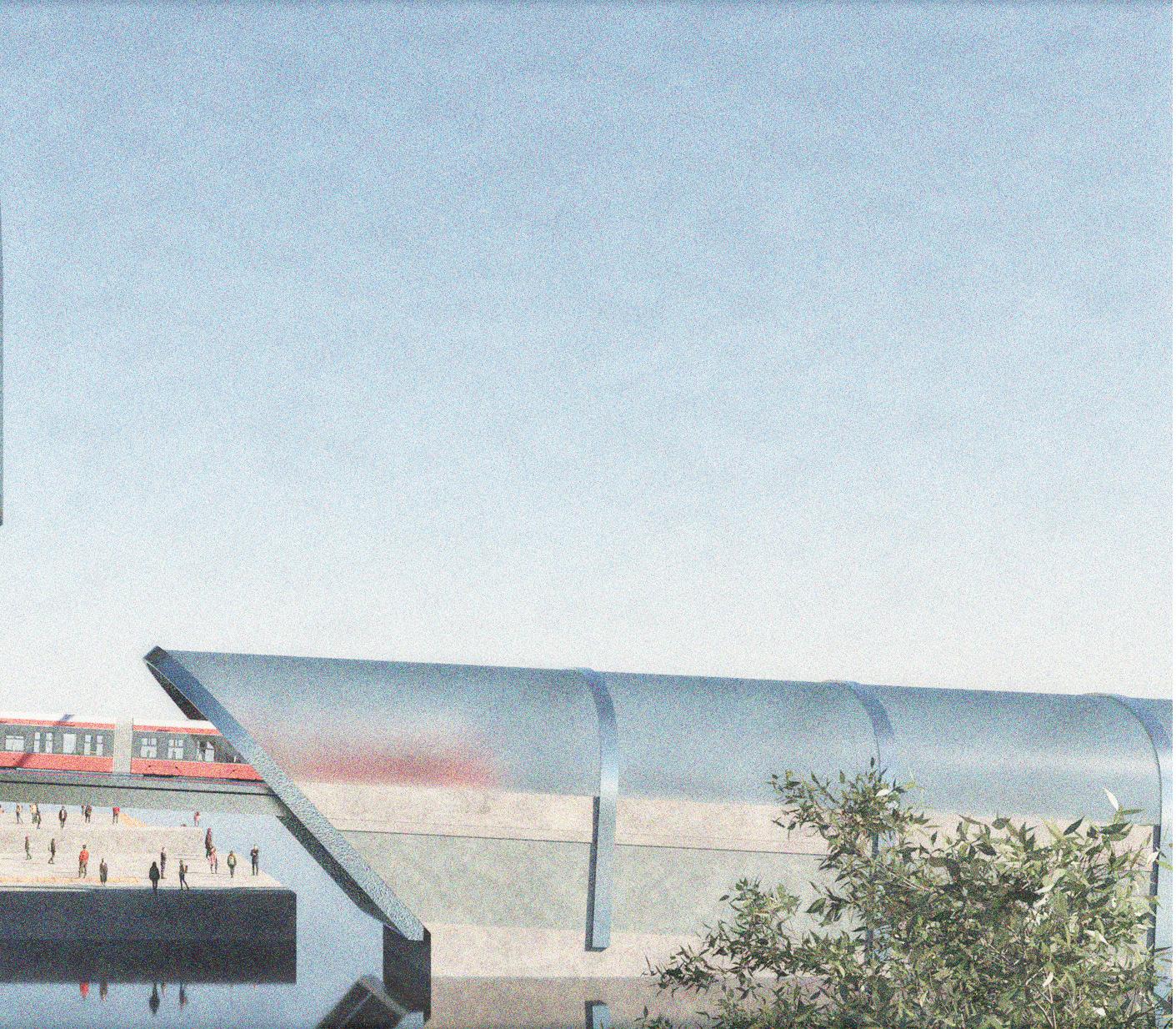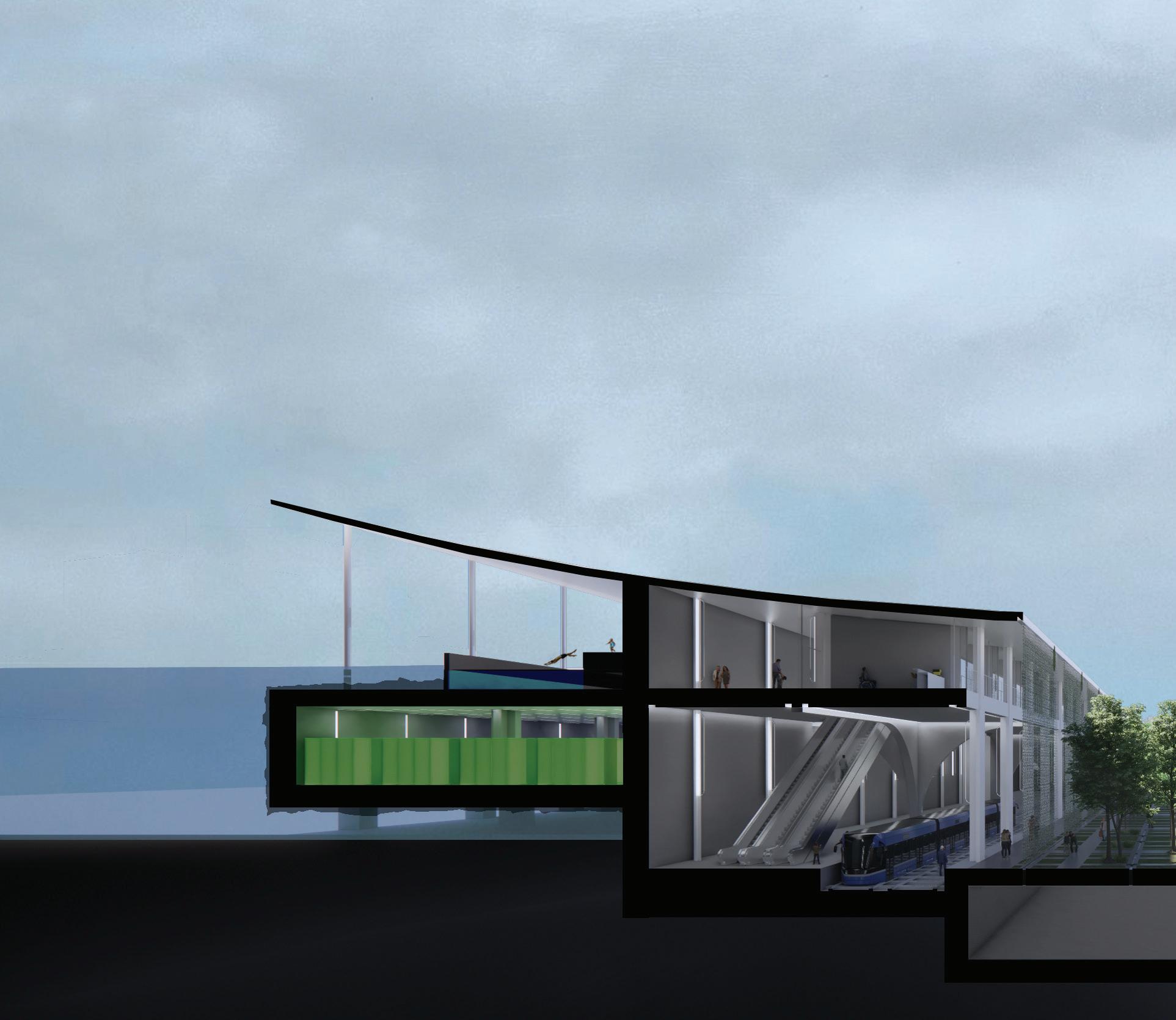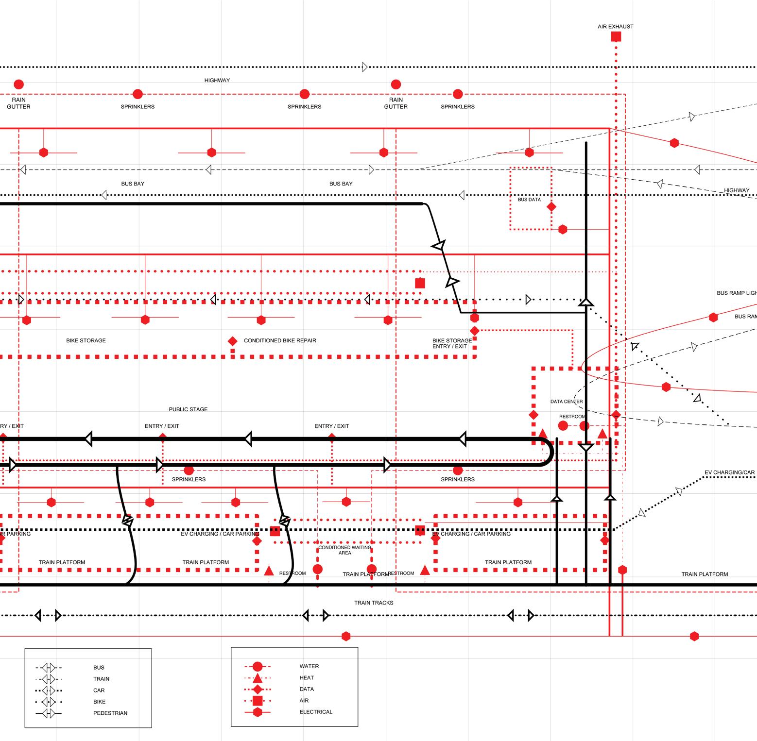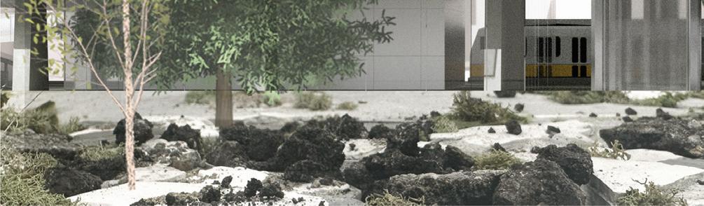 alternative present as the set for design and the stage upon which public life unfolds within the project. The site itself is also imagined as a moment of friction—or a meaningful glitch —within the efficiency of the transit and infrastructural landscape. It must awkwardly balance the demand of systemic efficiencies with the meaningful inefficiencies that are essential for human life.