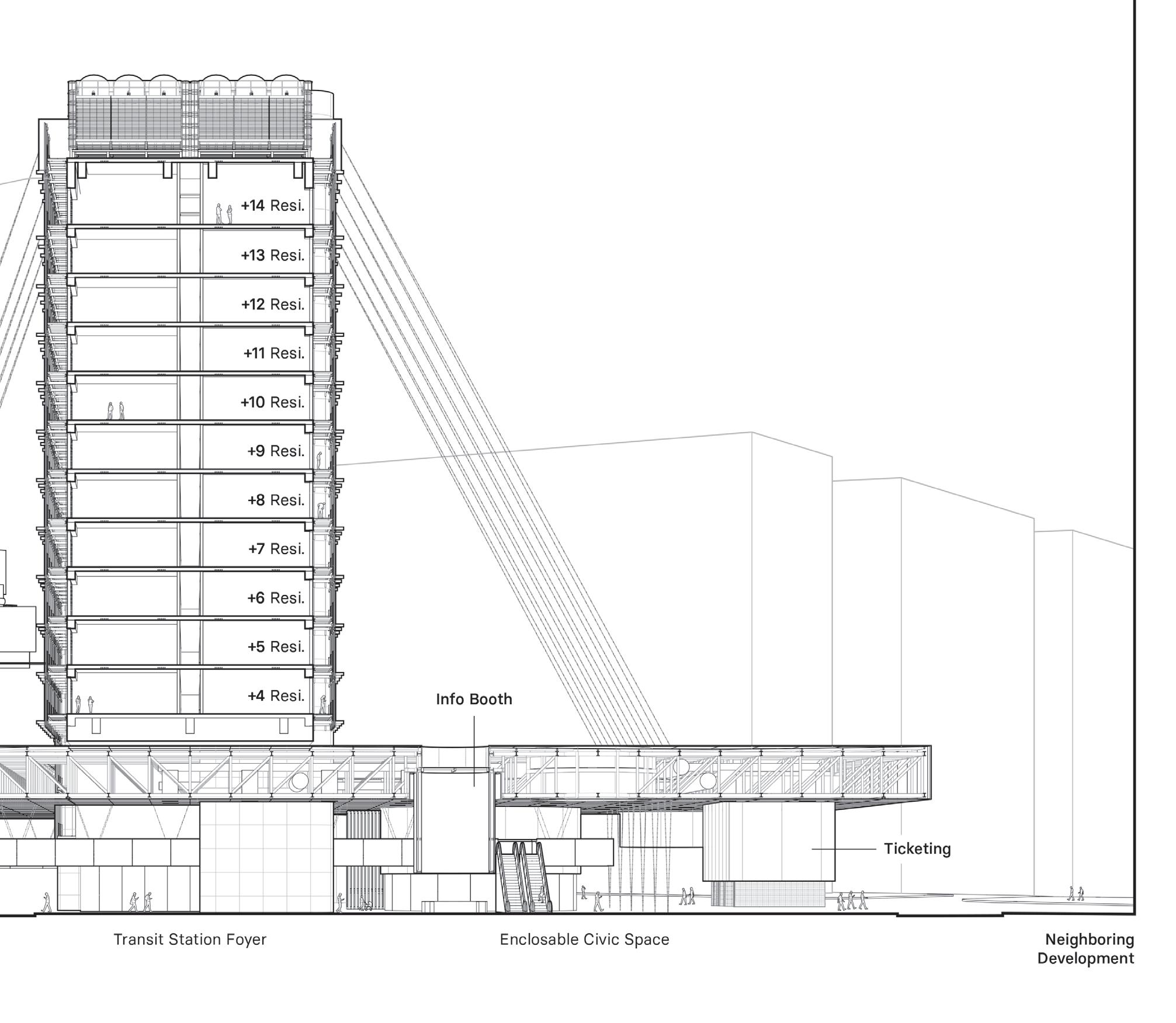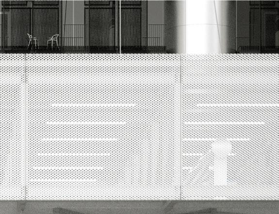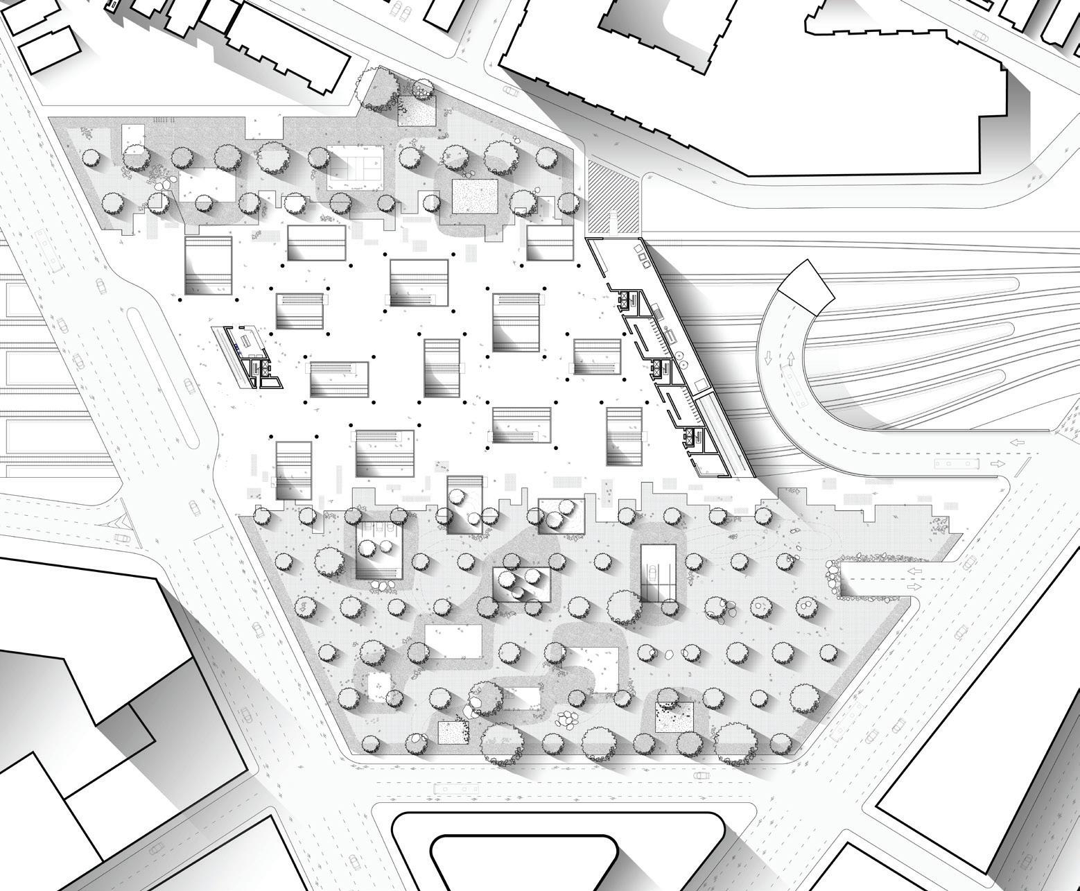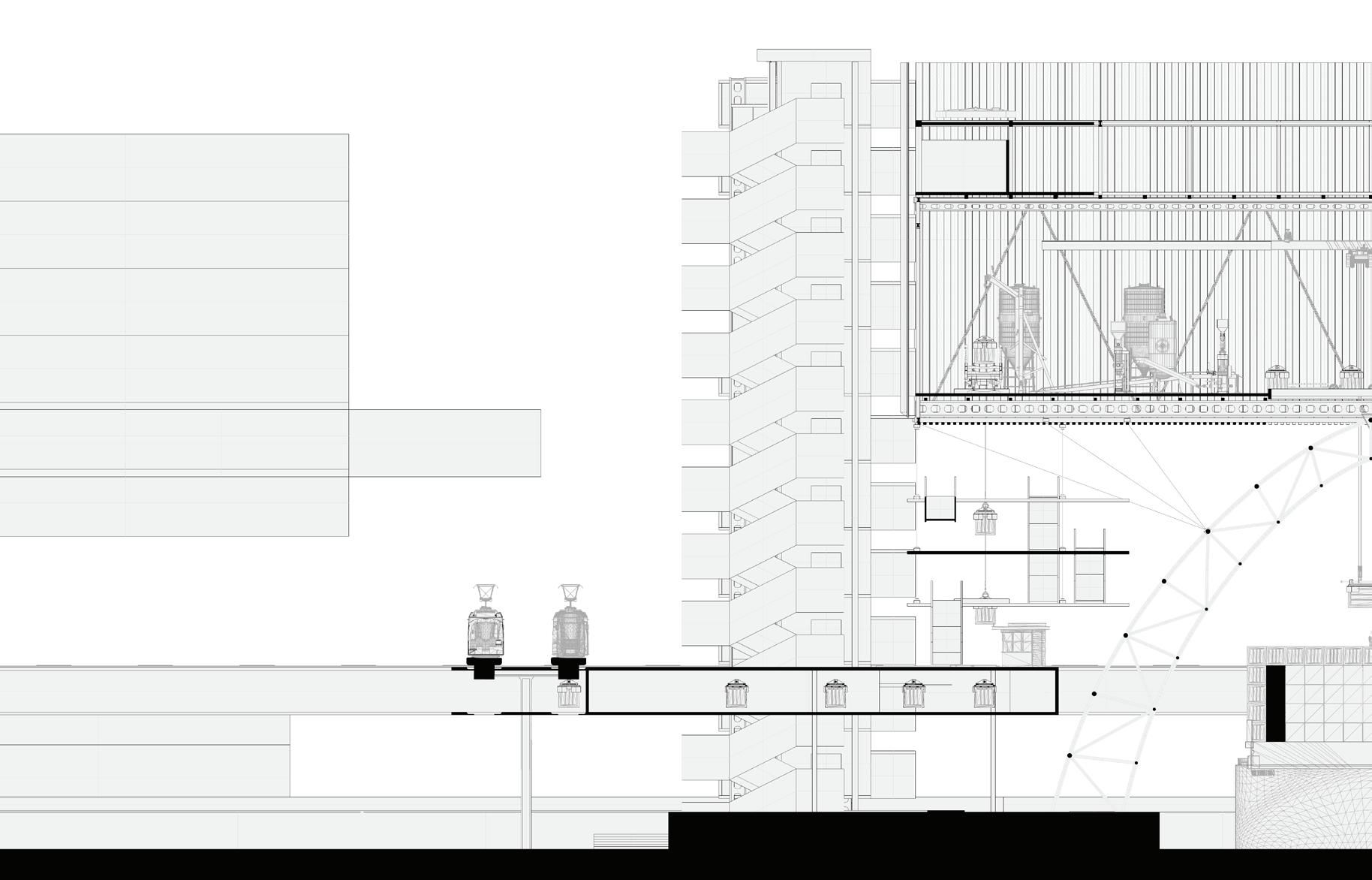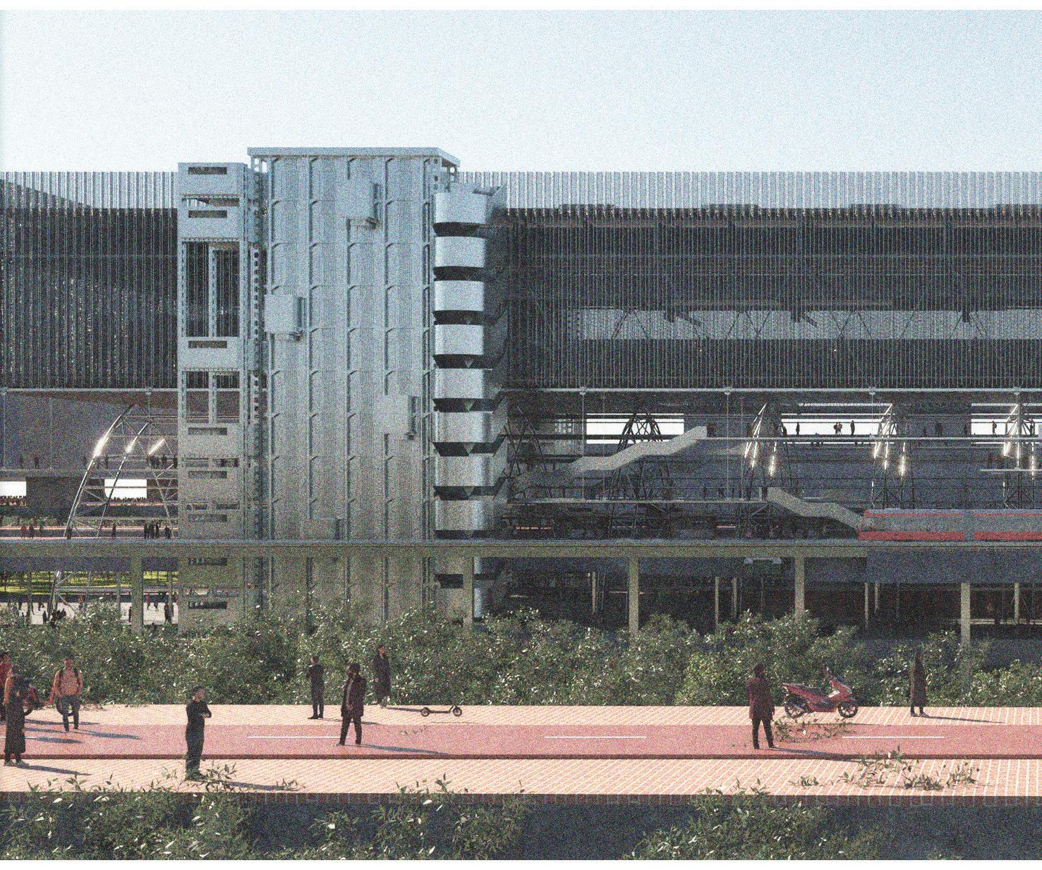 alternative present as the set for design and the stage upon which public life unfolds within the project. The site itself is also imagined as a moment of friction—or a meaningful glitch —within the efficiency of the transit and infrastructural landscape. It must awkwardly balance the demand of systemic efficiencies with the meaningful inefficiencies that are essential for human life.