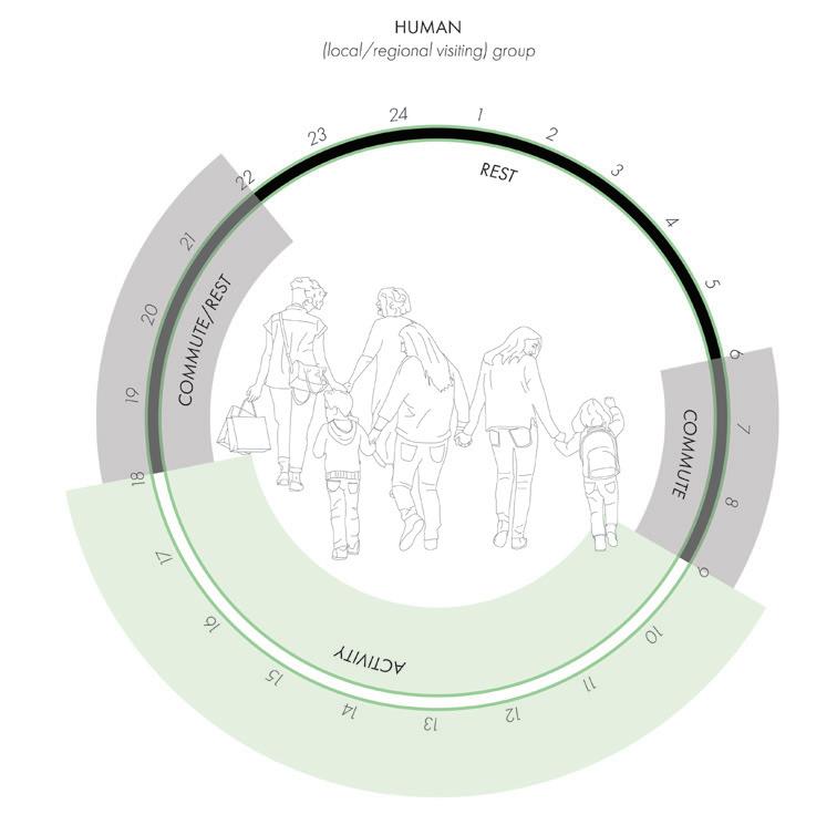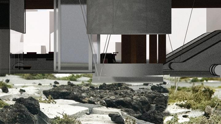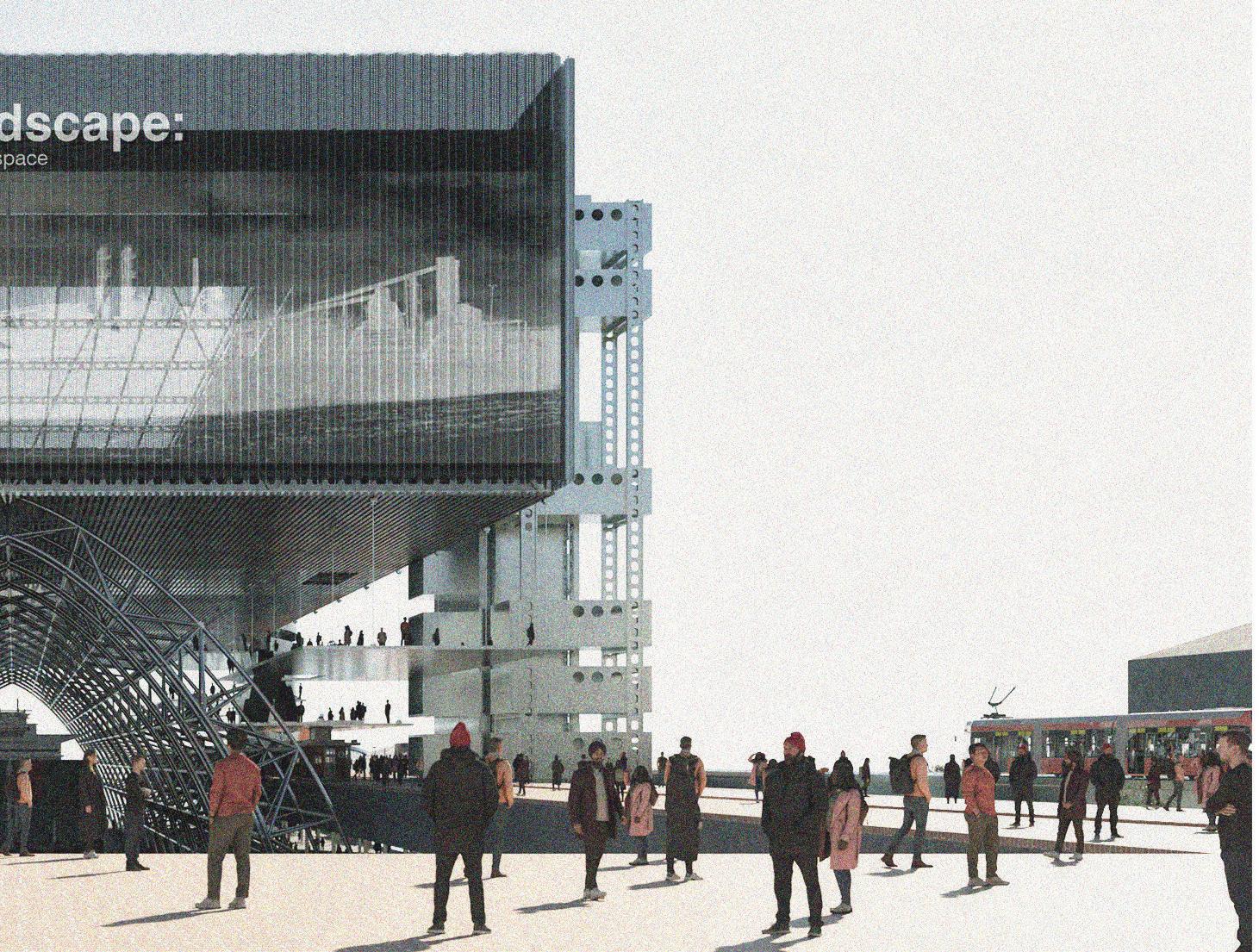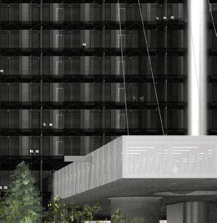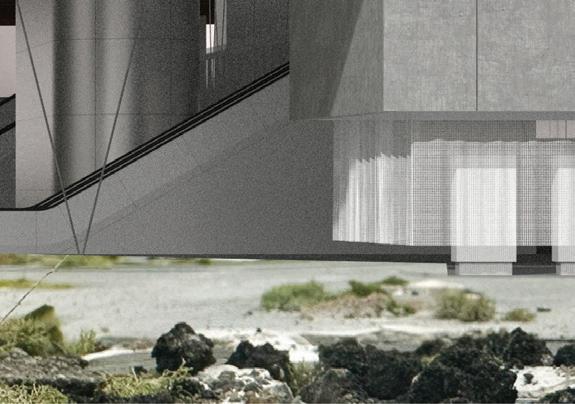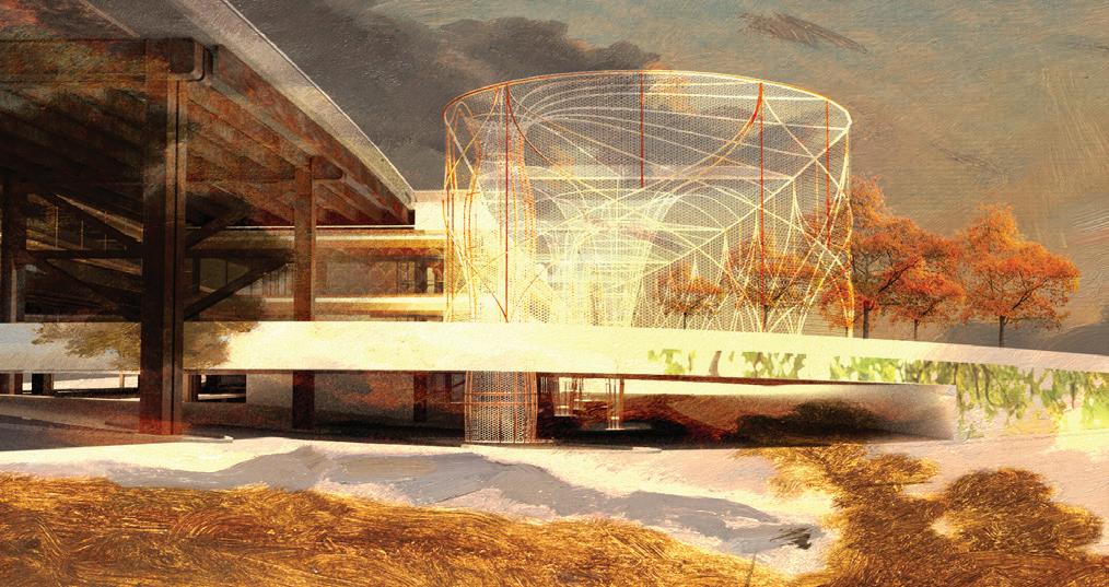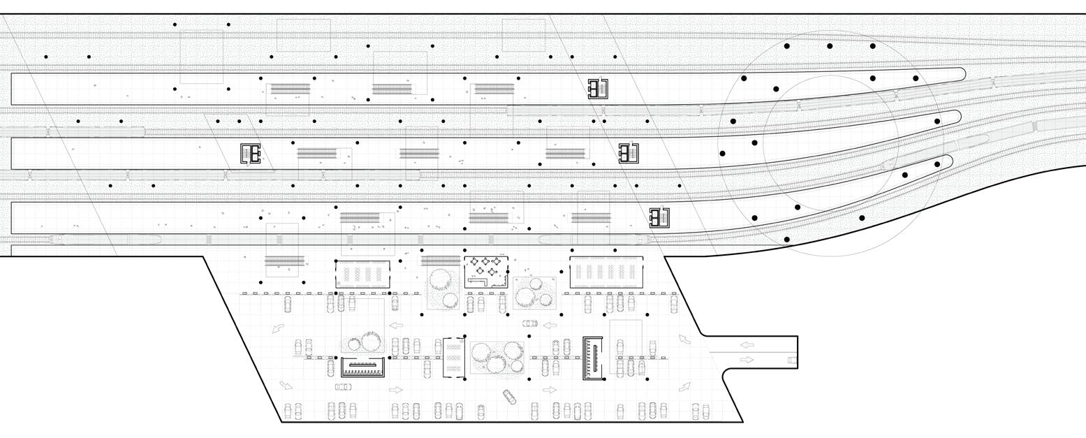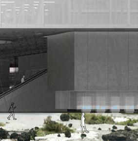 alternative present as the set for design and the stage upon which public life unfolds within the project. The site itself is also imagined as a moment of friction—or a meaningful glitch —within the efficiency of the transit and infrastructural landscape. It must awkwardly balance the demand of systemic efficiencies with the meaningful inefficiencies that are essential for human life.