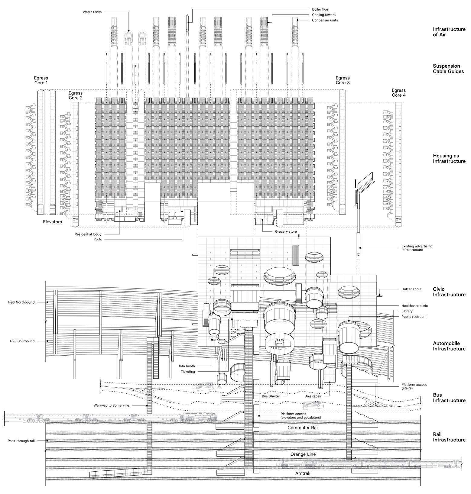 By 2024, the effects of this approach are apparent: the city has become a landscape of hasty private development with little regard for the social fabric necessary in a more crowded, livelier Boston. This proposal for an intermodal transit hub at Sullivan Square refashions how we manage densification and renewal. Situated amid the entanglement of I-93, 11 bus lines and 7 train tracks, the project acknowledges the heaviness of infrastructure to ask if housing can itself be recast as basic civic infrastructure. By suspending the archetypal long-span truss structure of a train station from a midrise housing block, we envisage a series of mediating dependencies between the private and public, urgently needed housing alongside supporting civic services and the anticipation of renewal amid a necessary memory of a petrochemical near past under threat of total erasure.