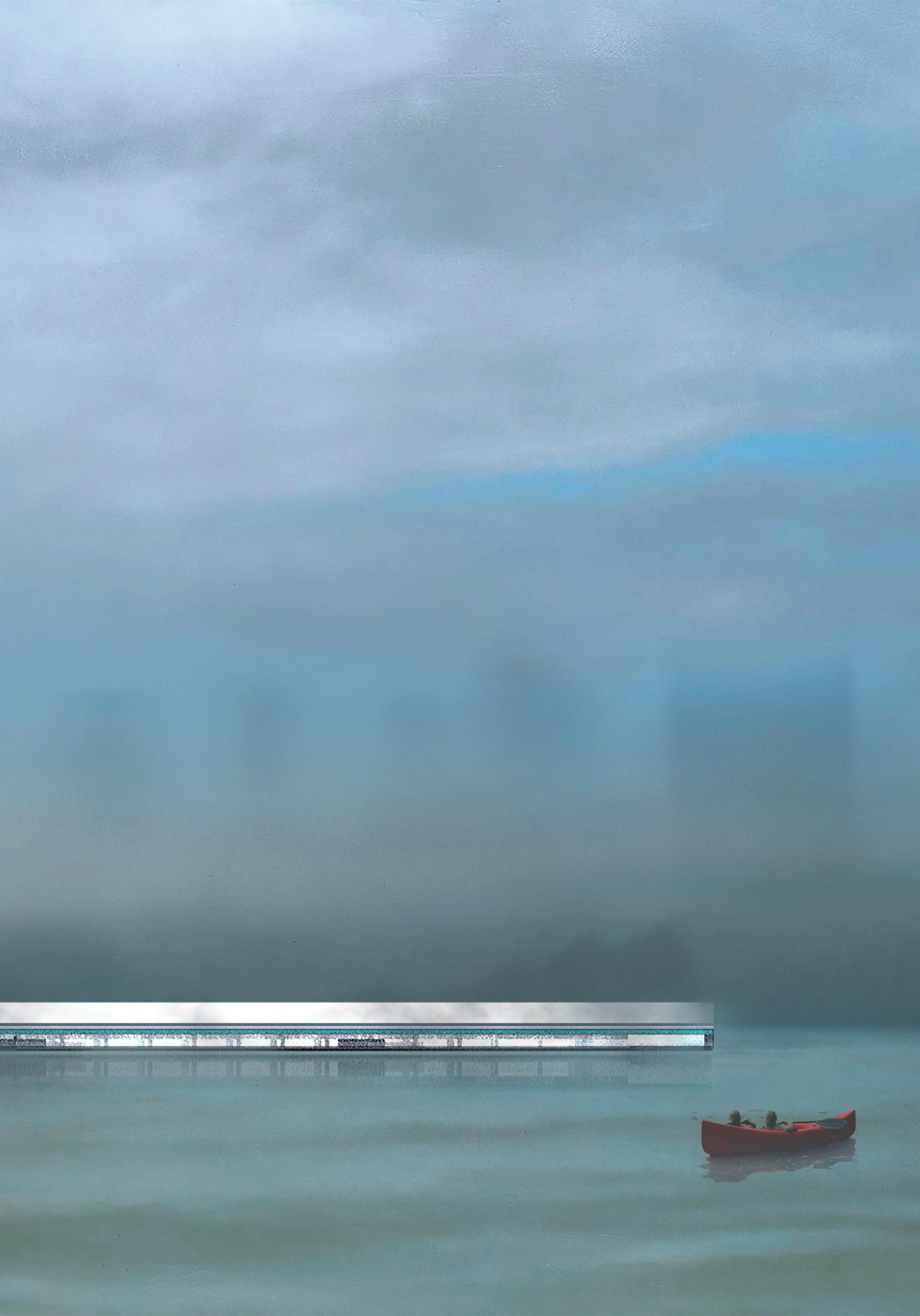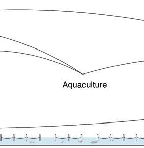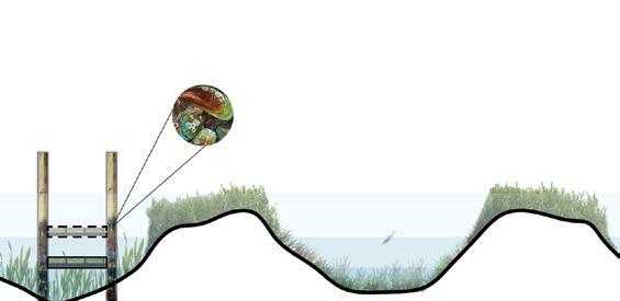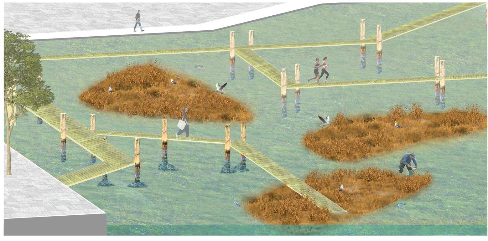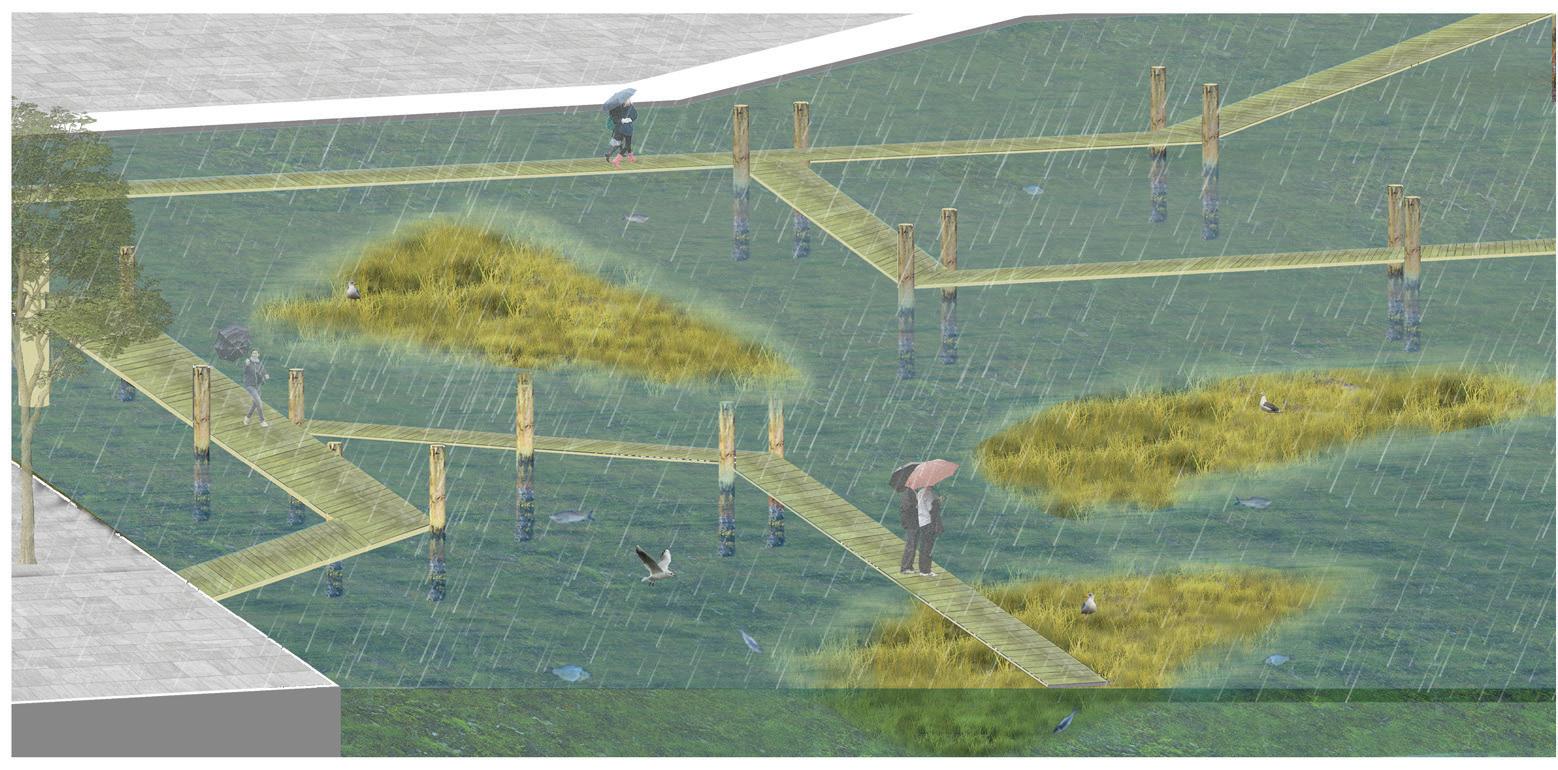 Remediated and reclaimed post-industrial shore line provides a recreational and productive landscape calibrated to handle increasing climatic fluctuations. Depiction of dry seasons (above left) and wet seasons (above right).