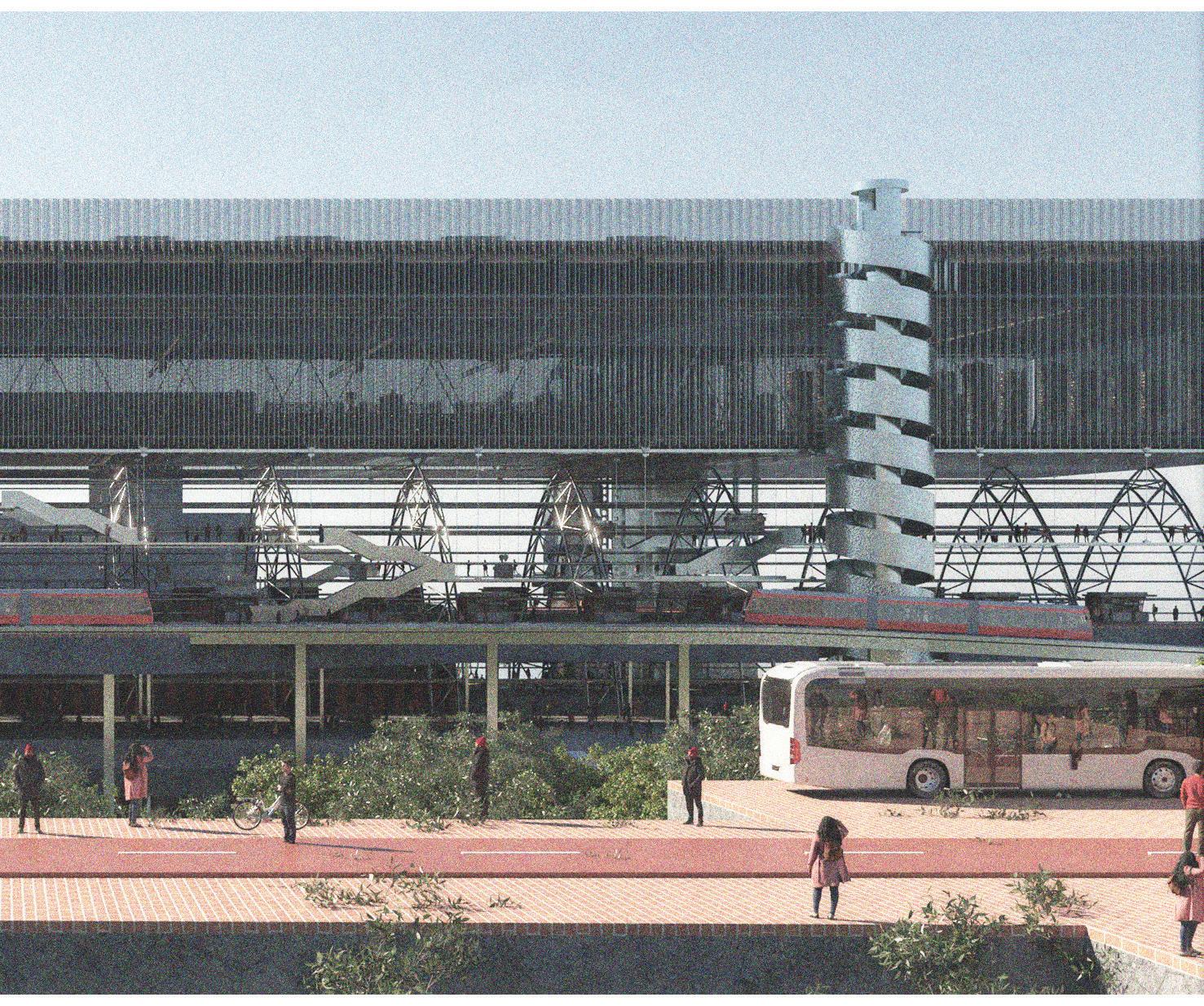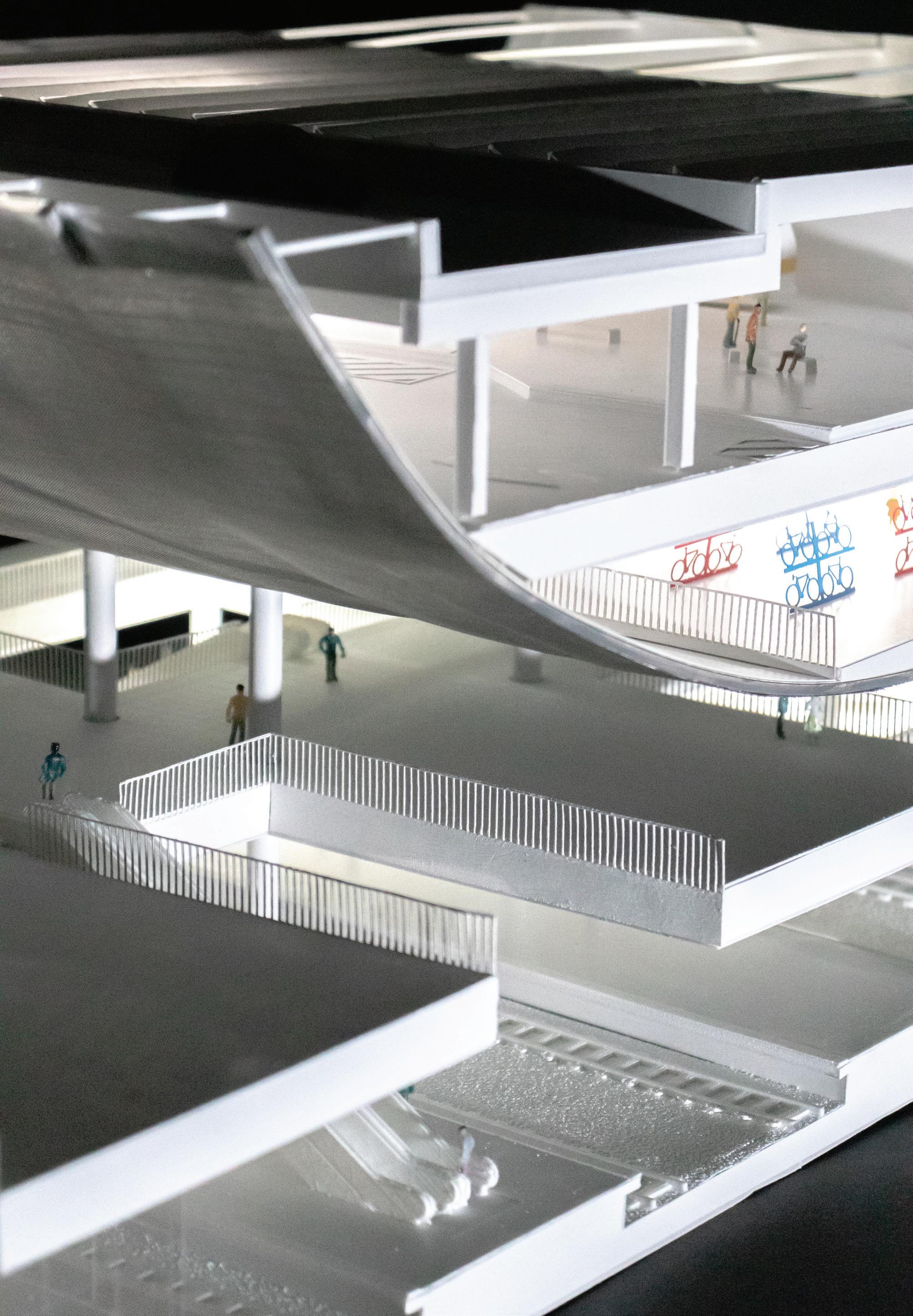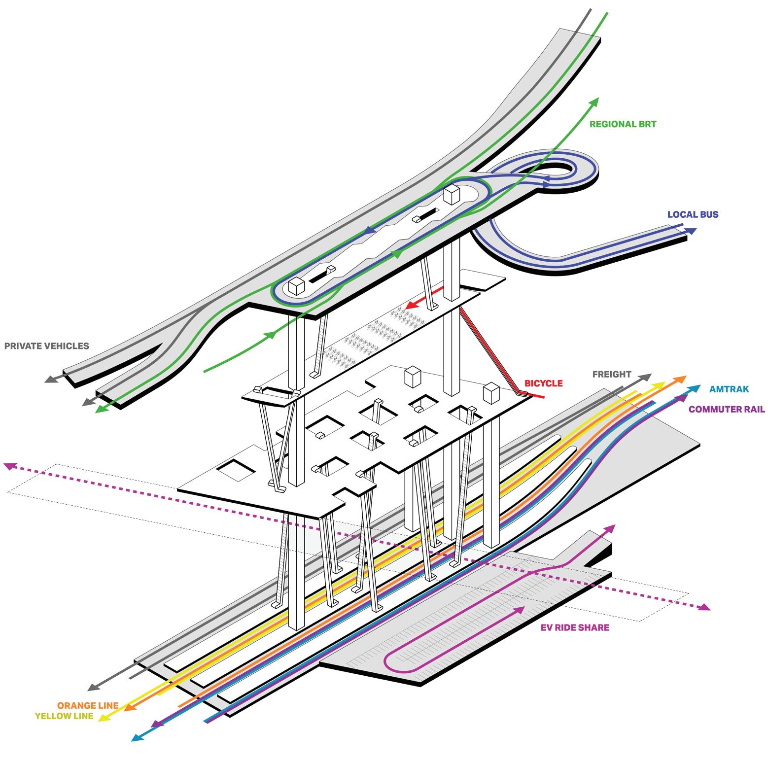 The studio program was a mixed-use transit hub that could accommodate public and private mobility within a paradigm of infrastructural decarbonization. The social dimension of such a program required the students to think critically about spaces of mobility as places for democratic activity where strangers interact regardless